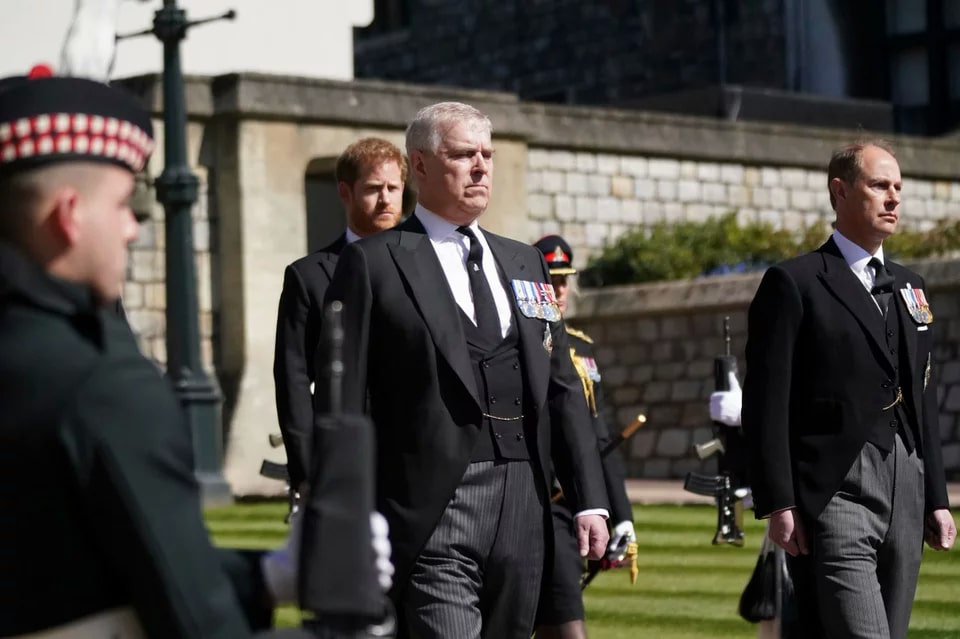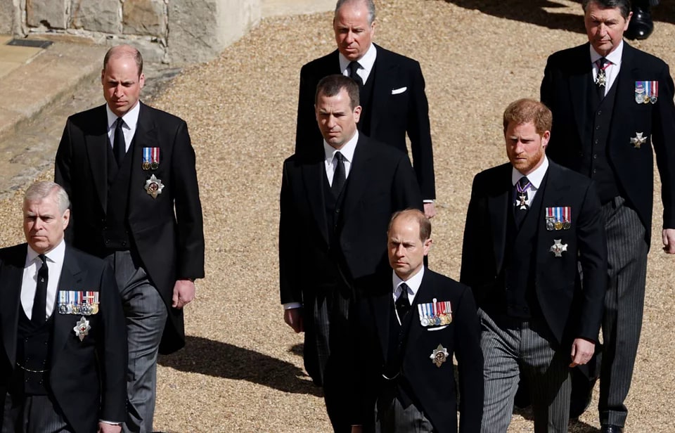 Την ίδια ώρα οι εγγονοί του πρίγκιπα Φιλίππου, πρίγκιπες Γουίλιαμ και Χάρι, ακολουθούσαν το φέρετρο του παππού τους, αλλά δεν κάθονταν δίπλα δίπλα. Ανάμεσά τους περπατούσε ένας εξάδελφός τους.