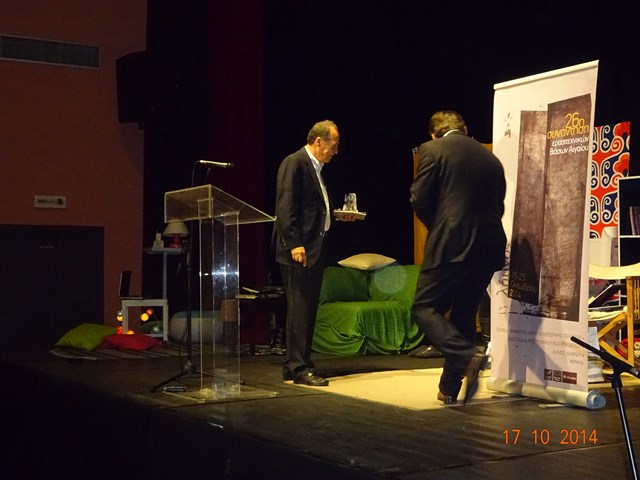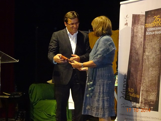 Μετά το τέλος της ομιλίας του, η κ. Βενέτη παρέδωσε αναμνηστικό της συνάντησης στο δήμαρχο Λήμνου φιλοτεχνημένο από το Λημνιό αρχιτέκτονας κ. Πινάκο συνοδευόμενο από ένα βιβλίο από την έκδοση της ομοσπονδίας η οποία πριν χρόνια είχε χρηματοδοτηθεί επίσης στο την γενική γραμματεία Αιγαίου με τίτλο "20 χρόνια θεατρικά κοστούμια στο Αιγαίο".