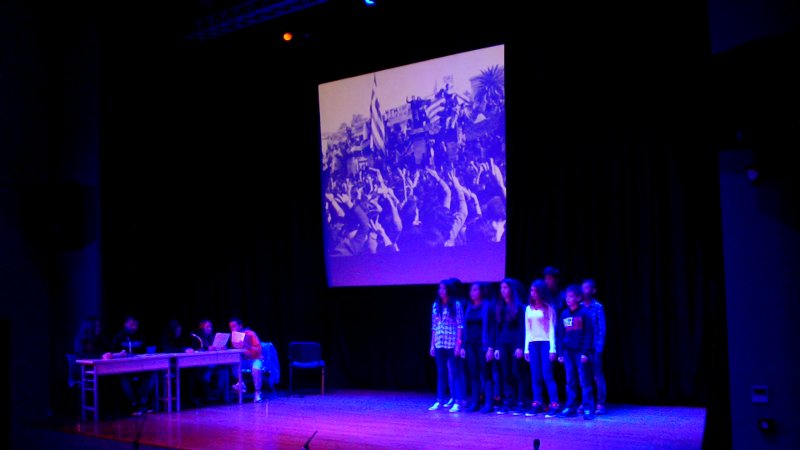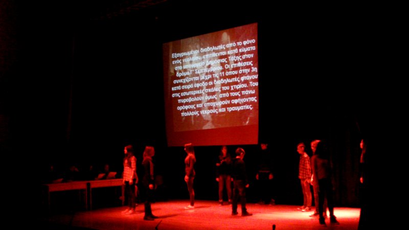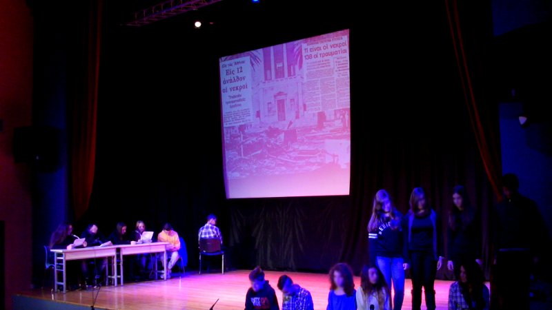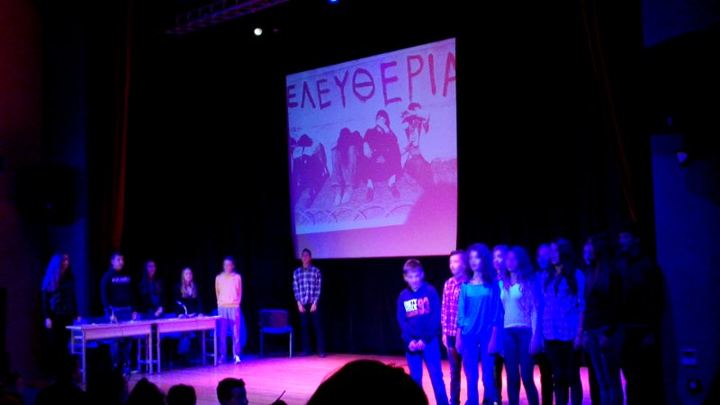Οι μαθητές του Γυμνασίου της Μύρινας τίμησαν τη μνήμη των πεσόντων του Πολυτεχνείου με μια εκδήλωση που περιελάμβανε θεατρικό δρώμενο από το βιβλίο της Κωστούλας Μητροπούλου "Το χρονικό των τριών ημερών".
