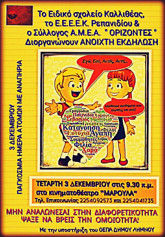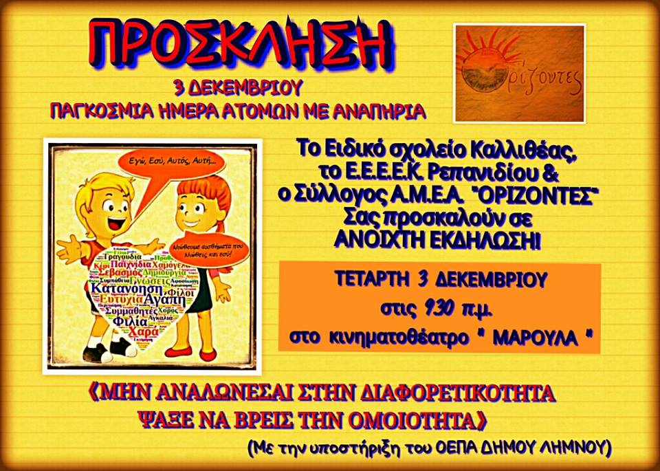 Η 3η Δεκεμβρίου έχει ορισθεί ως Παγκόσμια Ημέρα Ατόμων με Αναπηρία. Στην προσπάθεια της κοινωνικής ένταξης και ενσωμάτωσης των μαθητών της Λήμνου και της ευαισθητοποίησης του κοινωνικού συνόλου απέναντι στη στάση του στην αναπηρία και τη διαφορετικότητα, το Ειδικό Σχολείο Καλλιθέας Λήμνου, το Ε.Ε.Ε.Ε.Κ. Λήμνου, και ο Σύλλογος Γονέων, Κηδεμόνων και Φίλων Α.Μ.Ε.Α. «Ορίζοντες», διοργανώνουν ανοιχτή εκδήλωση, με την υποστήριξη του Ο.Ε.Π.Α. Δήμου Λήμνου, στο κινηματοθέατρο «Μαρούλα», την Τετάρτη 3 Δεκεμβρίου 2014 και ώρες 09.30π.μ.-12.00 π.μ.