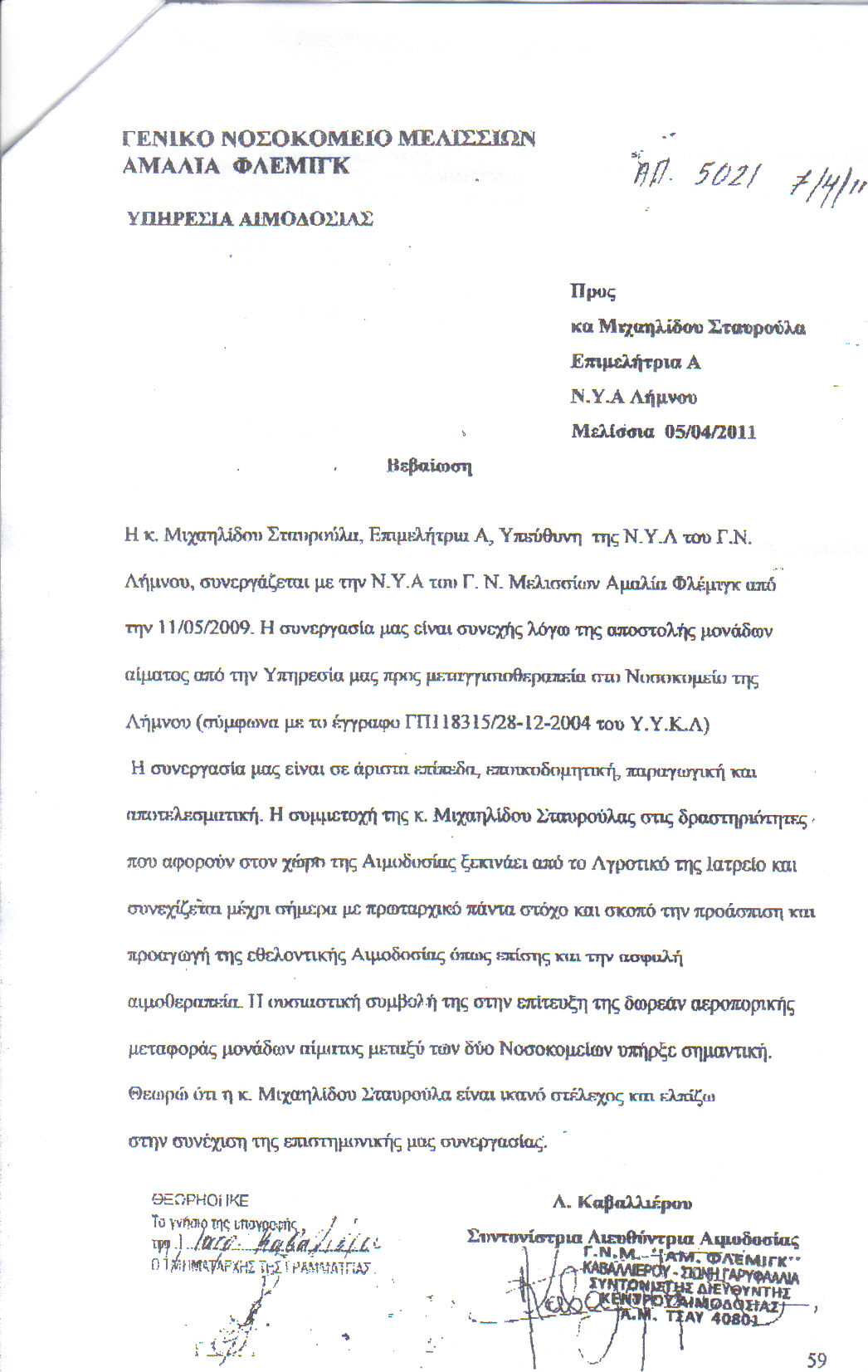 Η αφοσίωση μου και η αγάπη για την Αιμοδοσία αρχίζει από το αγροτικό και συνεχίζει με μεγάλη επιτυχία στο Γ.Ν. Κέντρου Υγείας Λήμνου το οποίο επάνδρωσα πλήρως.