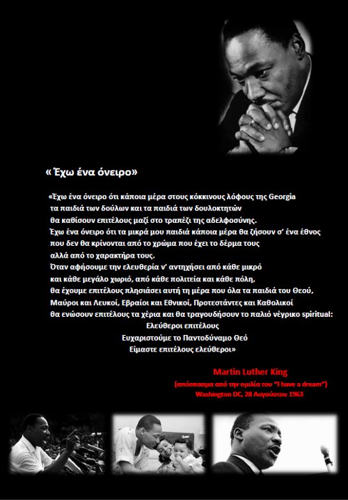 3. Δημιουργία και ανάρτηση αφίσας με θέμα τον ρατσισμό και ένα απόσπασμα της ομιλίας του Martin Luther King "I have a dream" στις 28 Αυγούστου 1963, Washington DC.