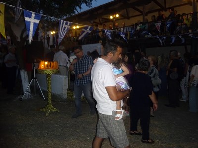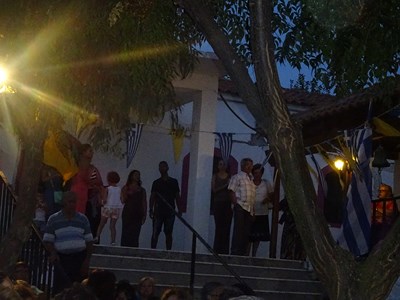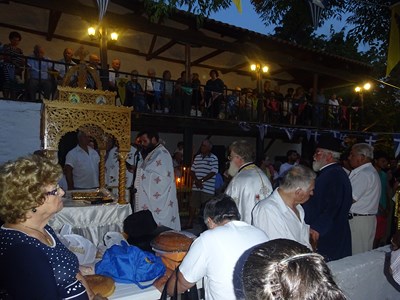 Και φέτος όπως και πέρυσι, ο εσπερινός έγινε στον αύλειο χώρο του ναού, καθώς μετά το σεισμό της 24ης Μαΐου και τις ζημιές που υπέστη έχει κριθεί ακατάλληλη.
