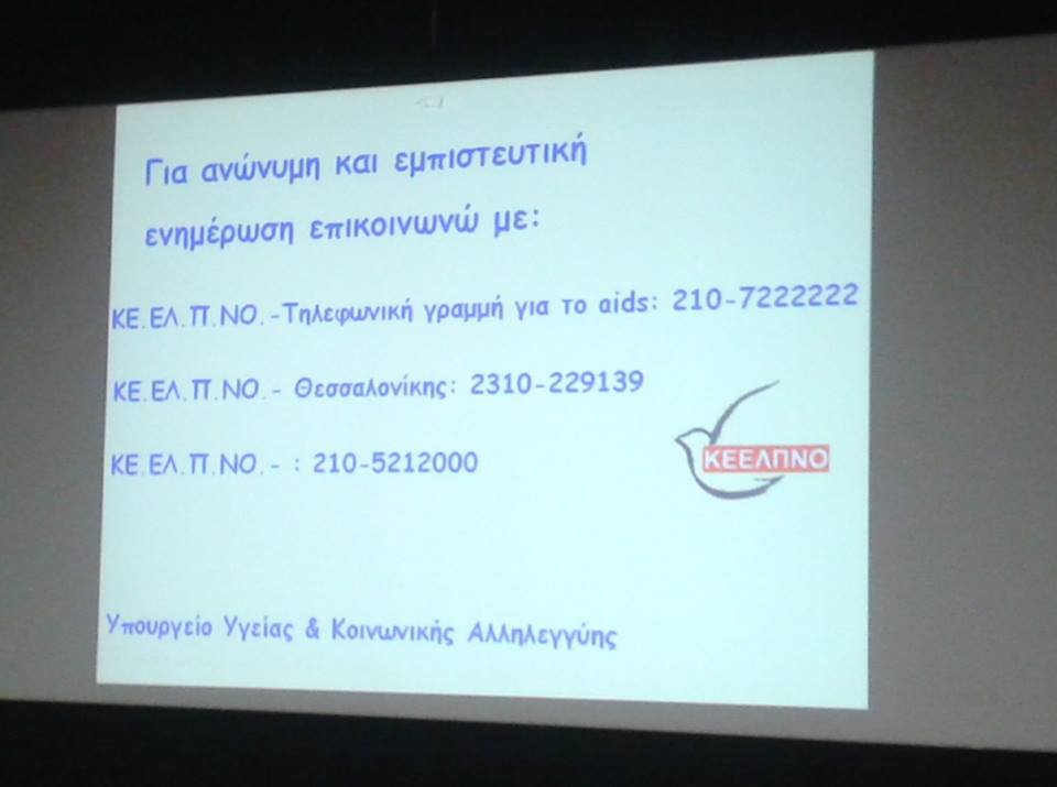 Αύριο Τετάρτη 21 Οκτωβρίου και ώρα 16:00-18:00 στο κινηματοθέατρο Μαρούλα θα γίνει ενημέρωση από το ΚΕ.ΕΛ.Π.ΝΟ στους σπουδαστές του ΙΕΚ Λήμνου και στους φοιτητές του Πανεπιστήμιου σχετικά με το HIV/AIDS και τα Σεξουαλικώς Μεταδιδόμενα Νοσήματα (τρόποι μετάδοσης και προφύλαξης).