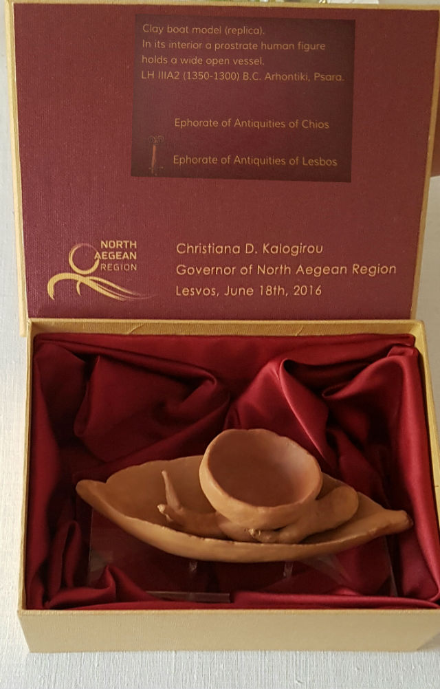 Η Περιφερειάρχης προσέφερε στο Γενικό Γραμματέα του ΟΗΕ ένα δώρο συμβολισμού, ένα ομοίωμα πλοιαρίου που βρέθηκε σε ανασκαφή τάφου στο Αρχοντίκι Ψαρών.