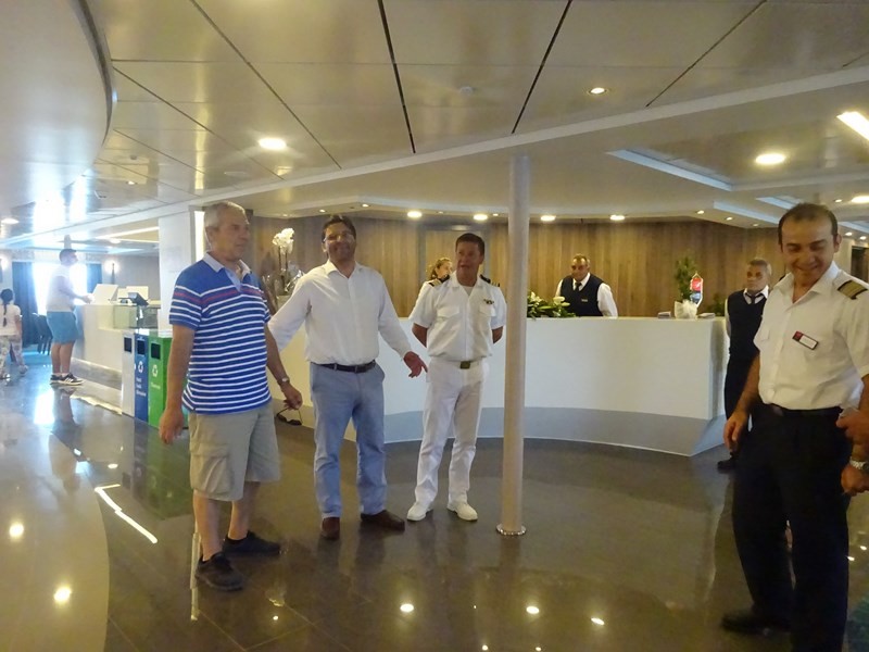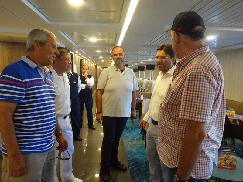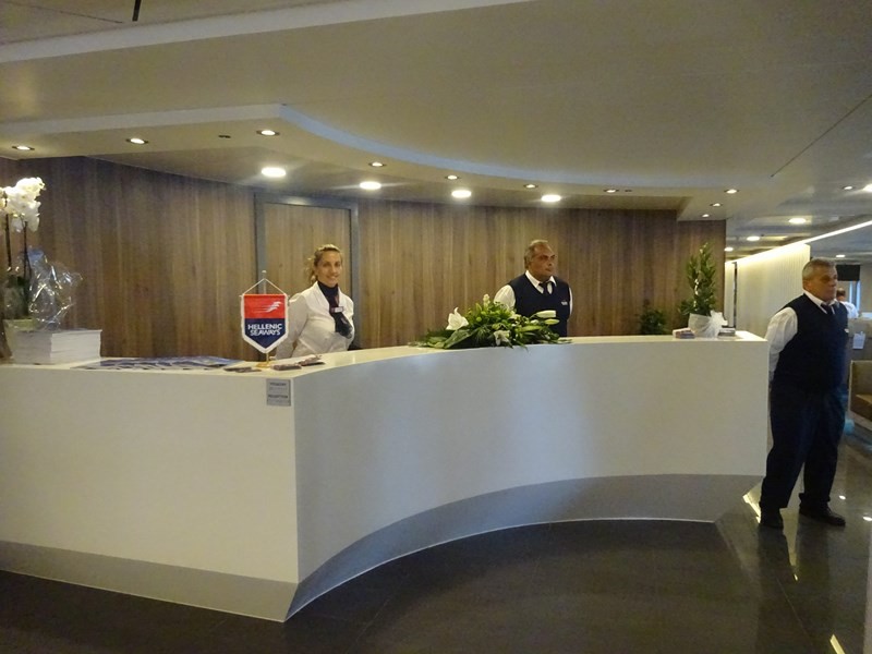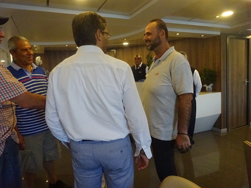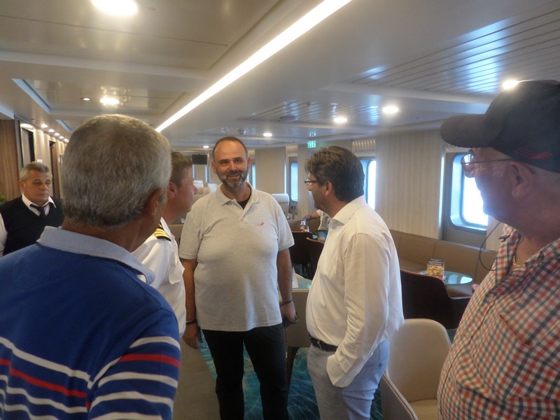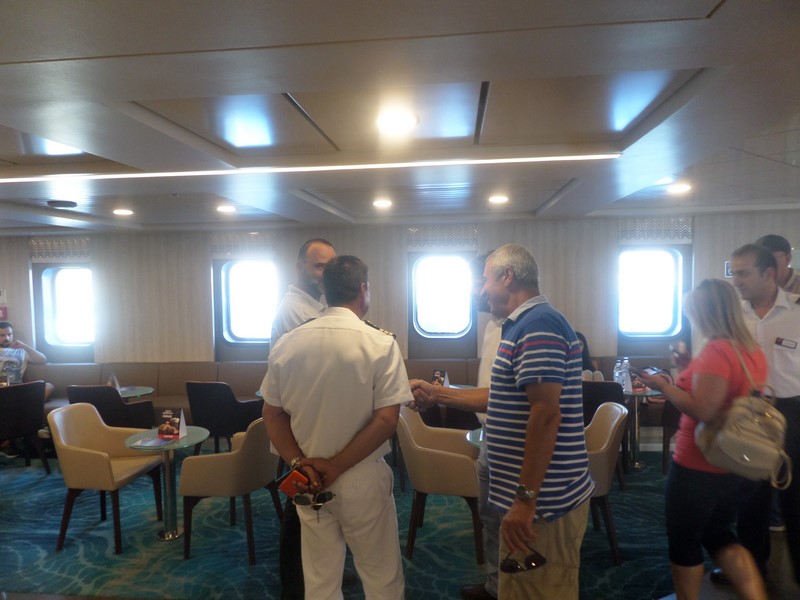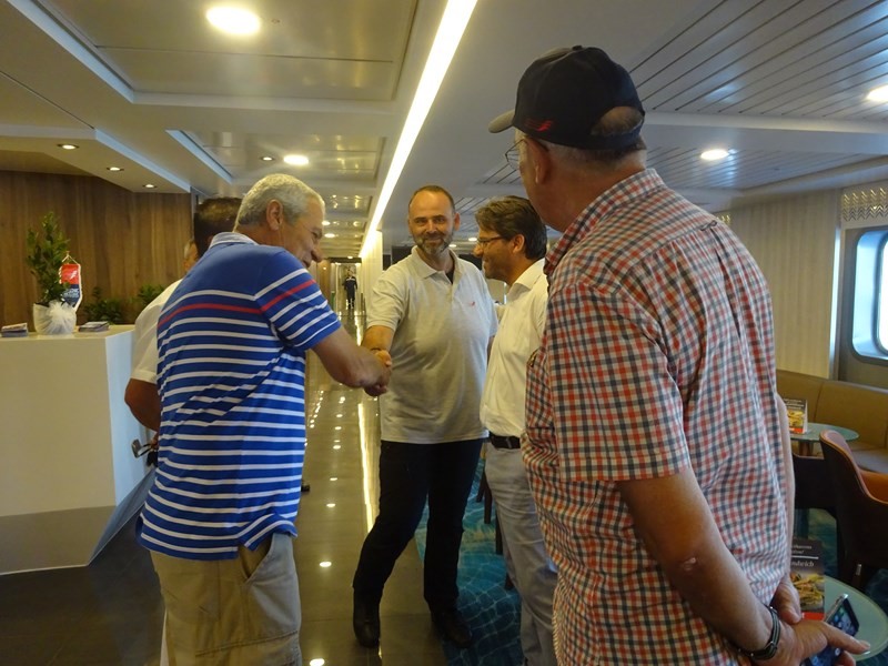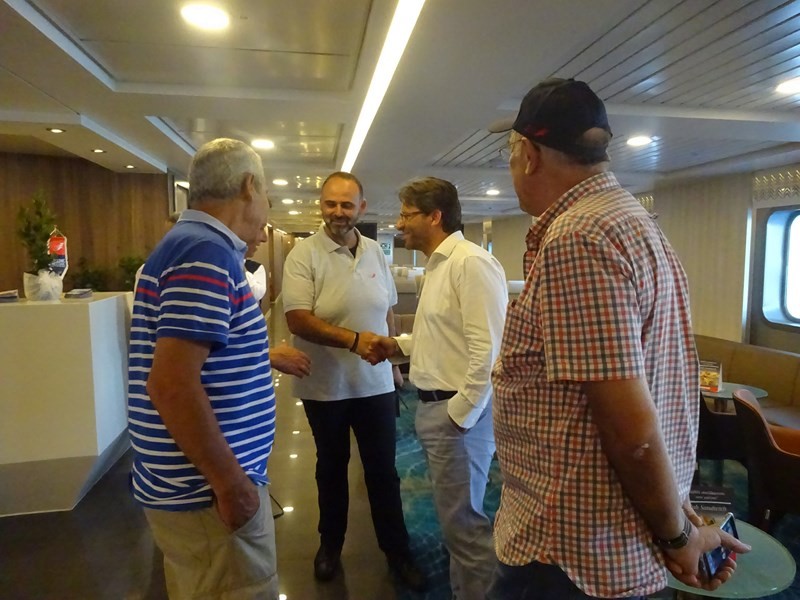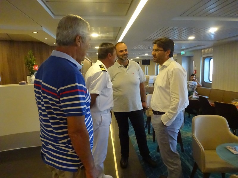Το πλοίο υποδέχτηκε στο λιμάνι της Μύρινας ο Δήμαρχος Λήμνου κ. Δημήτρης Μαρινάκης, συνοδευόμενος από τον πρόεδρο του Λιμενικού Ταμείου κ. Χαράλαμπο Δαλαβίτσο και τον Λιμενάρχη κ. Γιώργο Αρβανίτη. Ο καπετάνιος τους καλωσόρισε στη ρεσεψιόν του πλοίου, όπου αντάλλαξαν ευχές για τη νέα συνεργασία.