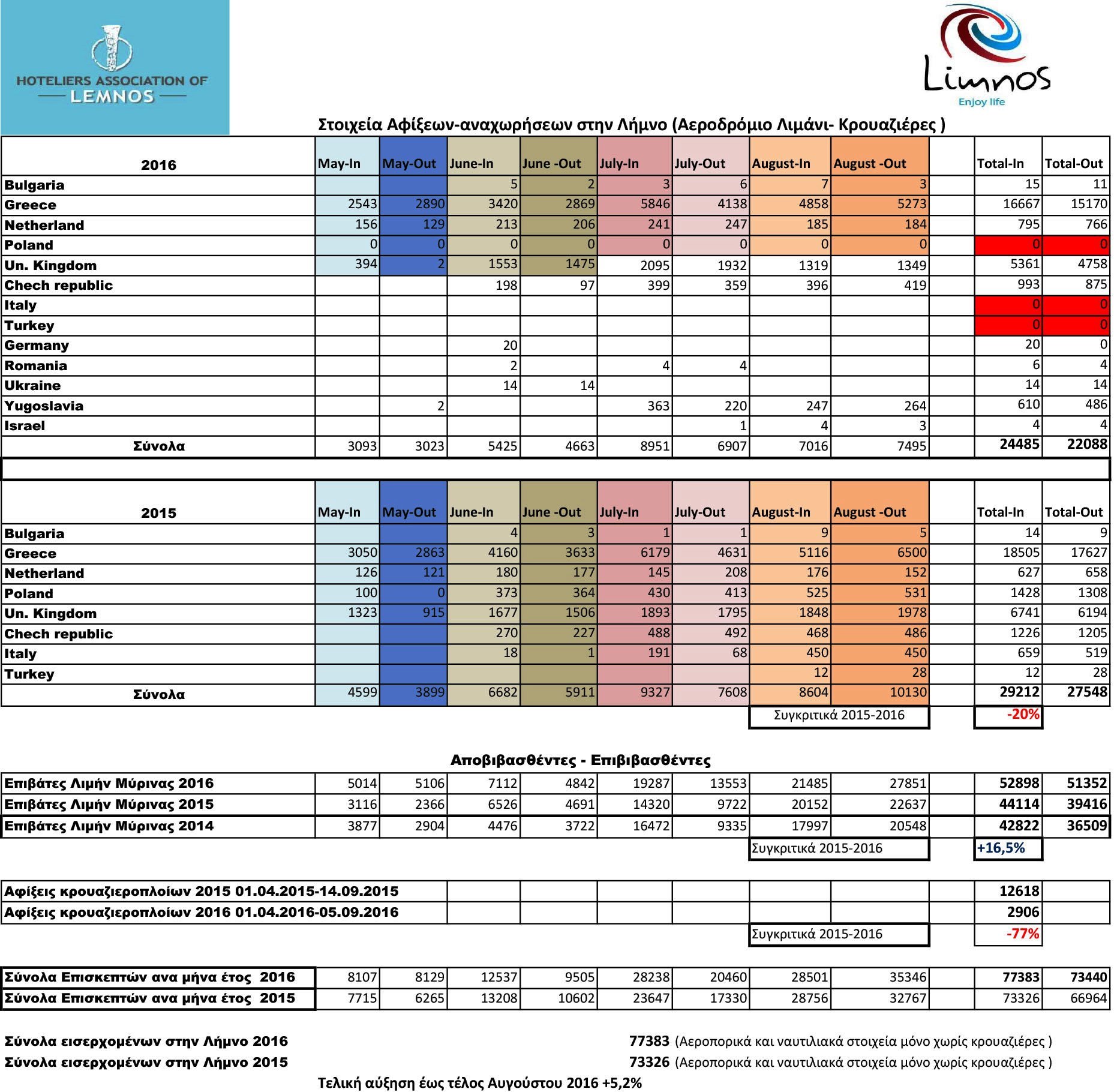 Ευχαριστούμε θερμά τον Αερολιμενάρχη Λήμνου Κο Πέτρο Χασάπη ,καθώς και τον Λιμενάρχη Λήμνου, Πλωτάρχη Κο Γεώργιο Αρβανίτη, για την θερμή και αγαστή συνεργασία με την Ένωση Ξενοδόχων Λήμνου".