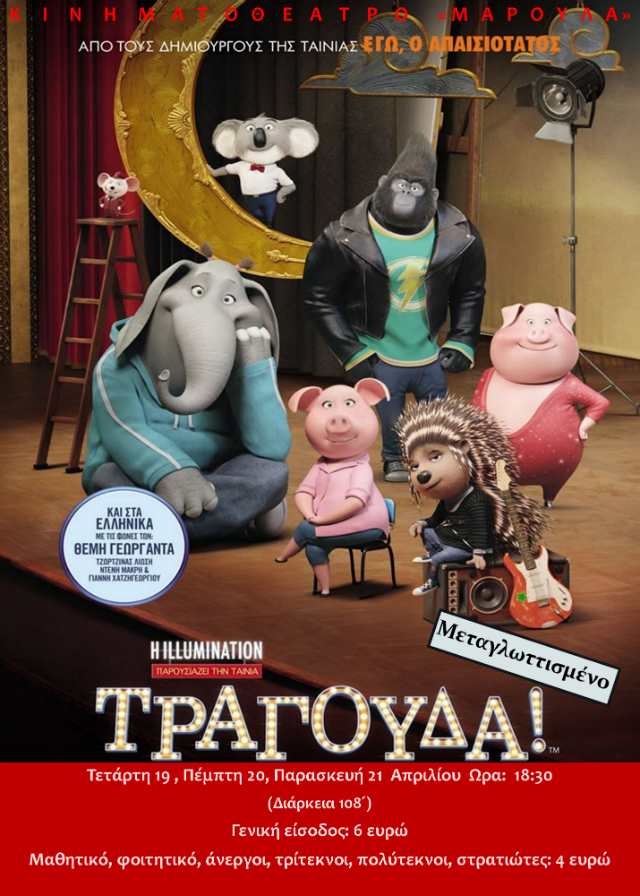 Υπόθεση: Το κοάλα Μπάστερ Μουν διοργανώνει διαγωνισμό τραγουδιού για να σώσει το θέατρό του από τη χρεοκοπία, με τη συμμετοχή των φίλων του. Οι πρωταγωνιστές της τηλεοπτική σειράς ΤΑΜΑΜ Γιάννης Χατζηγεωργίου (στο ρόλο του εκκεντρικού γουρουνιού Γκάντερ), Τζωρτζίνα Λιώση (η ντροπαλή ελεφαντίνα Μίνα με τη θεσπέσια φωνή) και Ντένης Μακρής (ο πιστός φίλος, το πρόβατο, ο Έντι) ζωντανεύουν μοναδικά κάποιους από τους βασικούς χαρακτήρες της ταινίας, ενώ ακούγονται πάνω από 65 αγαπημένα τραγούδια της σύγχρονης ποπ σκηνής σε ένα διαγωνισμό τραγουδιού που θα μας μείνει αξέχαστος!