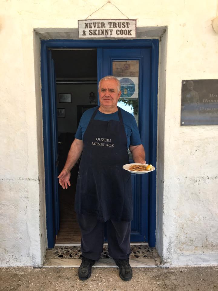 Ατμόσφαιρα δεκαετίας του '60. Φρέσκο ψάρι απο τους ψαράδες της περιοχής, φλωμαρια με τυρι, χοιρινό καβουρμά δικης τους παραγωγής με αβγά. Καφενείο 120 ετών, το χε κληρονομήσει από τον πατέρα του ο κυρ Μενέλαος που απλα σερβιρε ούζο στους ψαράδες.
