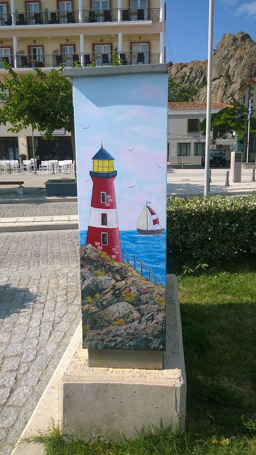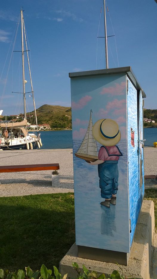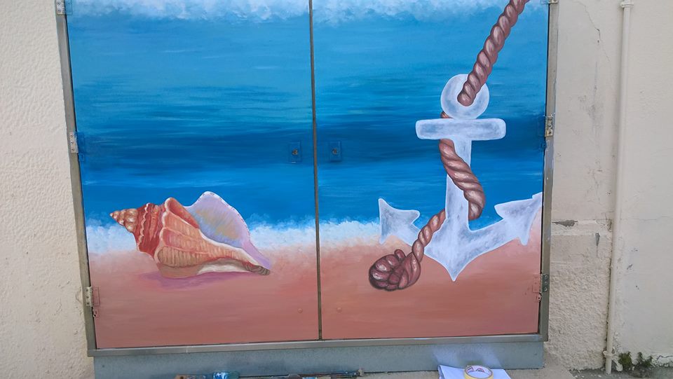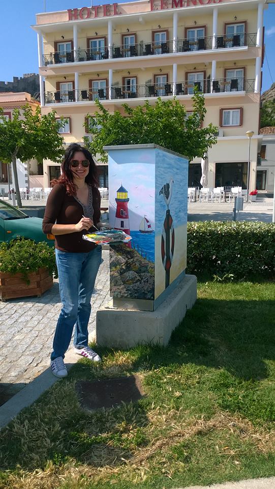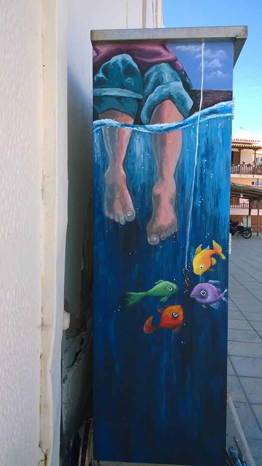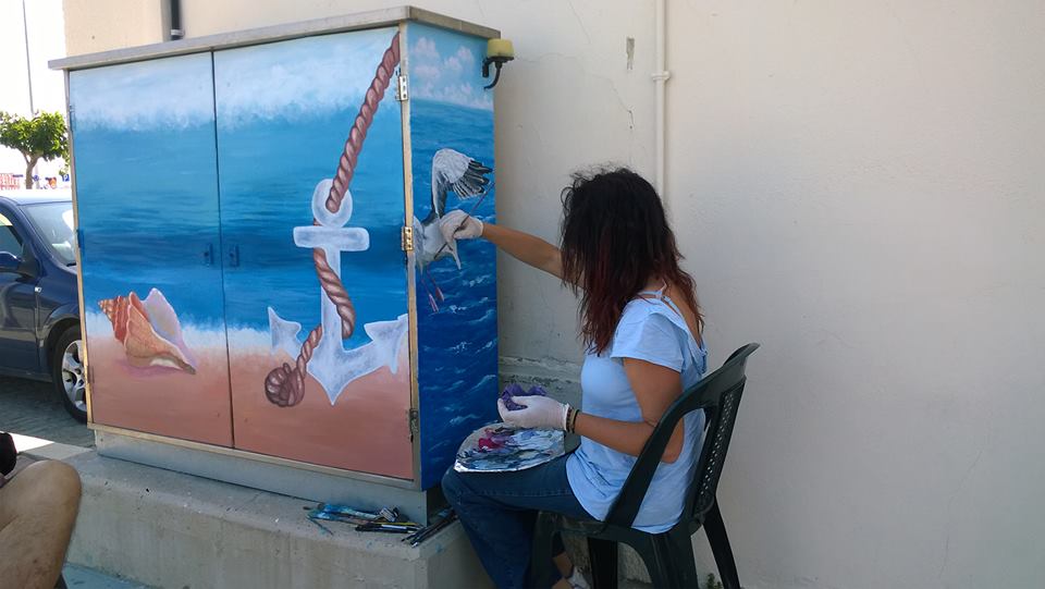 Η κ. Βελισσαρίδου, αφού πήρε σχετική άδεια, ζωγράφισε τα γκρι μεταλλικά κουτιά που βρίσκονταν εκεί, δίνοντας μια άκρως καλοκαιρινή νότα, ομορφαίνοντας τα και φυσικά κερδίζοντας τις εντυπώσεις και τις καλύτερες κριτικές.