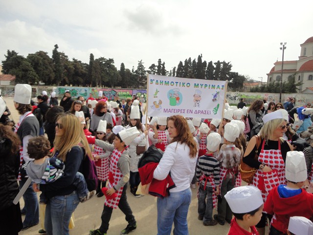 Ακολούθησαν κι άλλα σχολεία, Δημοτικά, Γυμνάσια, το Εσπερινό Λύκειο της Μύρινας, και Πολιτιστικοί Σύλλογοι του νησιού, αλλά και μεμονωμένες παρέες μικρών και μεγάλων που δημιούργησαν μια εκκωφαντικά γιορτινή ατμόσφαιρα. Όλοι με ένα θέμα ξεχωριστό, με μια έμπνευση μοναδική.