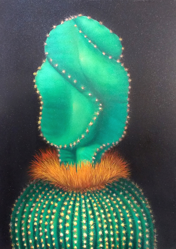 «Οι κάκτοι είναι το θέμα που διαχειρίζεται η Δέσποινα Κωνσταντίνου και φορτίζεται από την εμφαντική σημασία που του αποδίδει και τον δεξιοτεχνικό τρόπο που το επεξεργάζεται με λαμπερά χρώματα, καθαρότητα, λεπτομερή σχεδίαση και ξεχωριστή επιμέλεια στην απόδοση διαφορετικών υφών, ανακαλώντας, αρχικά, τις, εξαιρετικής καταγραφικής ακρίβειας και κομψότητας, έγχρωμες λιθογραφίες με θέμα φυτά και λουλούδια που εικονογραφούσαν εκδόσεις φυσικής ιστορίας τον 19ο αιώνα. Με τη συναρμογή διάφορων πραγματικών ειδών, δημιουργεί νέα, φανταστικά είδη-μεταλλαγμένα υβρίδια κάκτων, τα οποία καταλαμβάνουν μνημειακά τη ζωγραφική επιφάνεια, υποβάλλοντας μια άκρως ονειρική και μεταφυσική ατμόσφαιρα όπου, με ένταση και σουρεαλιστική, συχνά παιγνιώδη και ανατρεπτική, διάθεση, αναδύεται το ερωτικό στοιχείο...», σημειώνει ο Γιάννης Μπόλης, Ιστορικός της Τέχνης.
