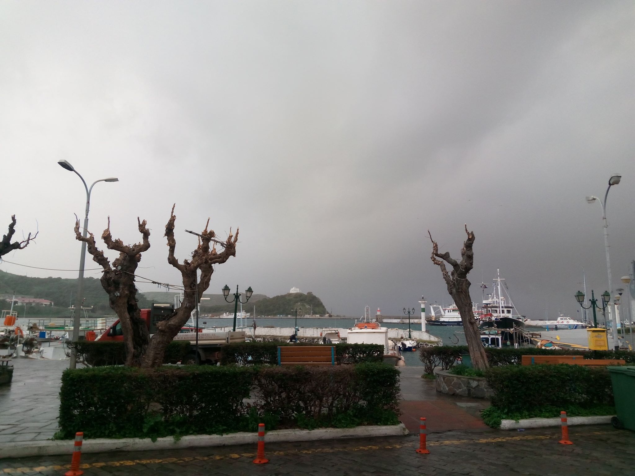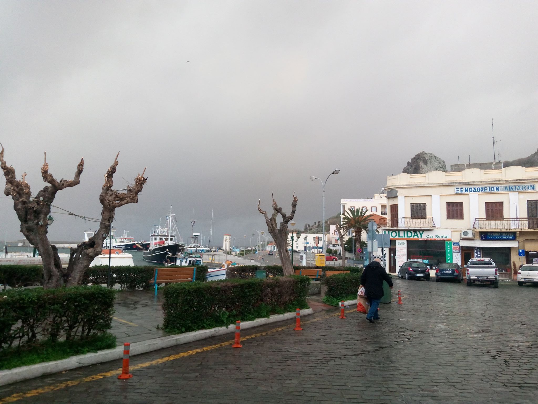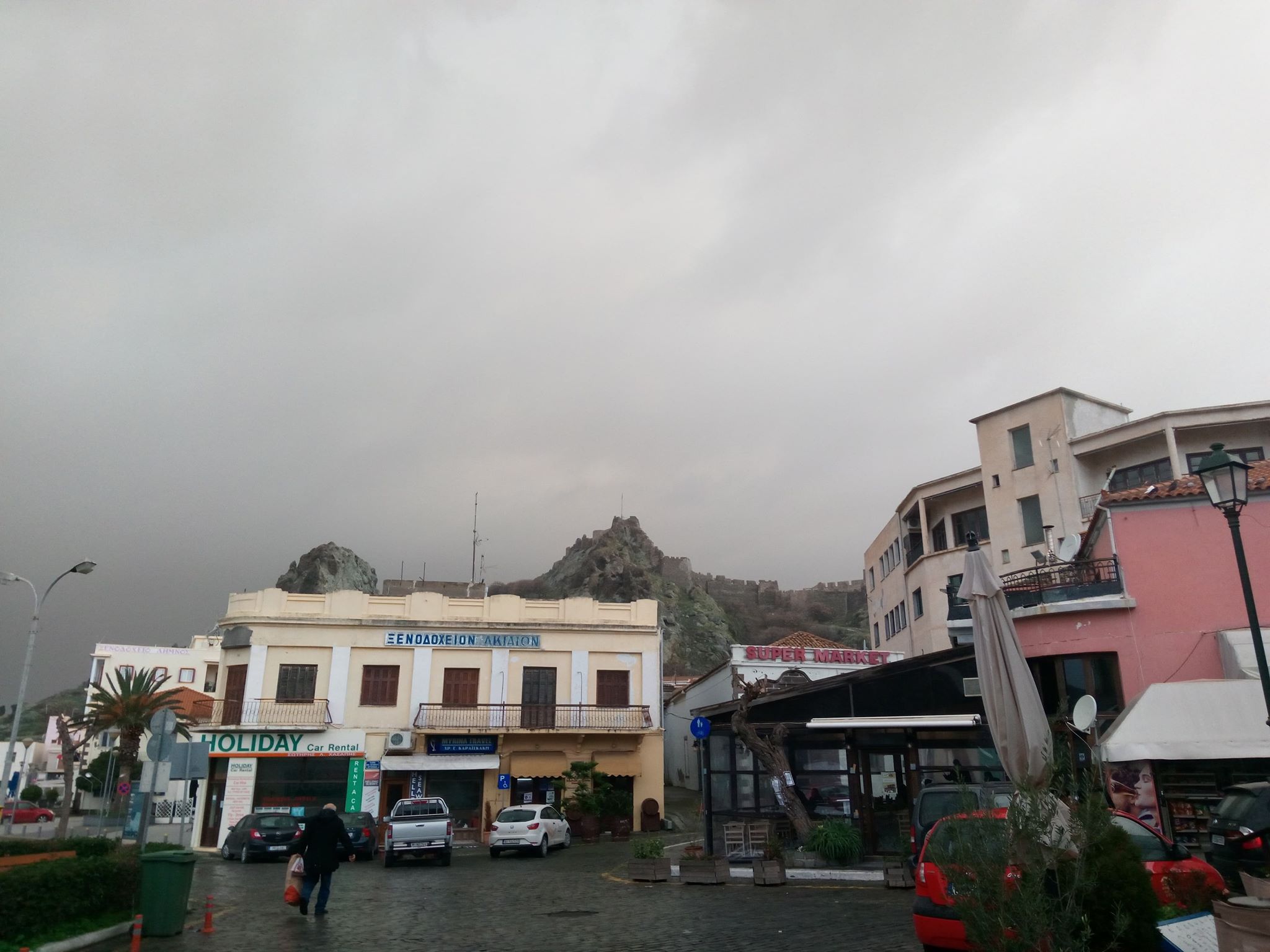 Στις φωτογραφίες διακρίνεται ένα παχύ στρώμα «νέφους» της αφρικανικής σκόνης να καλύπτει την πόλη της Μύρινας ενώ όσοι κυκλοφορούν έξω βλέπουν τα ρούχα και τις ομπρέλες τους να γίνονται κόκκινα από το χώμα που πέφτει με τη βροχή.
