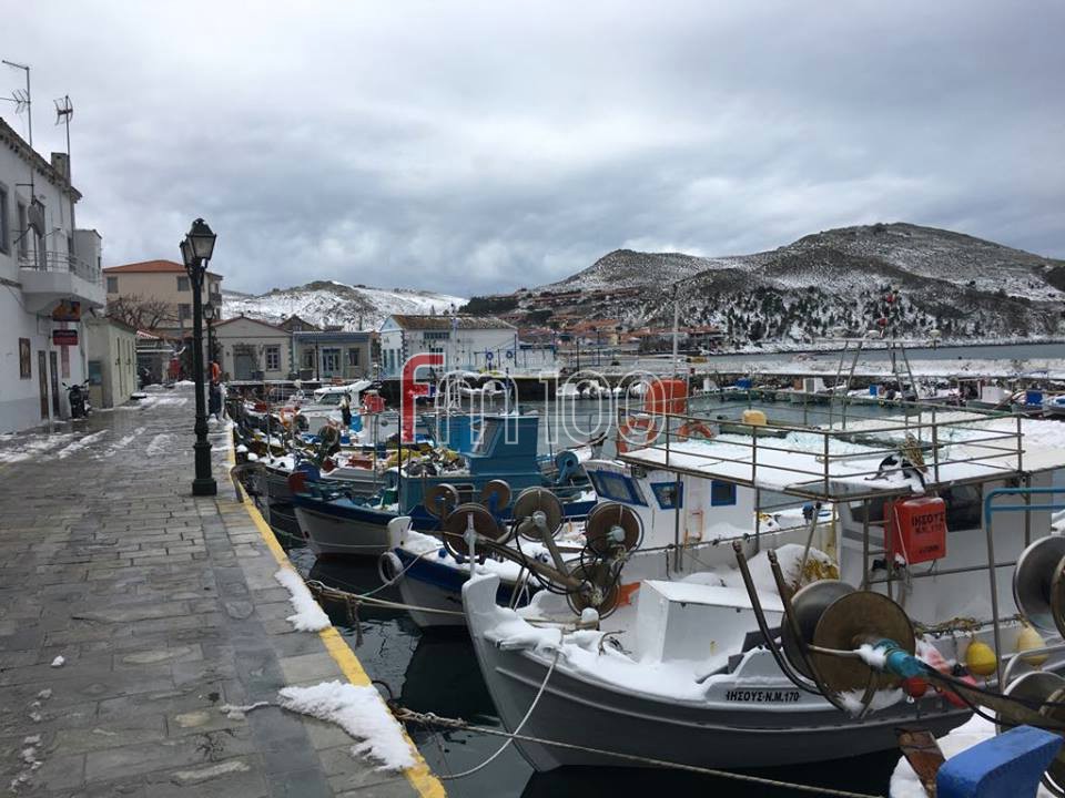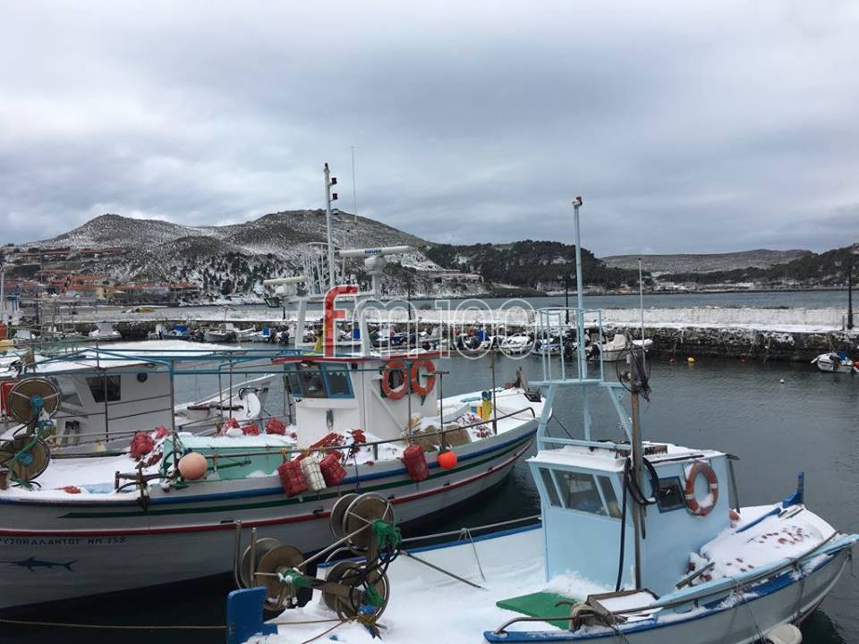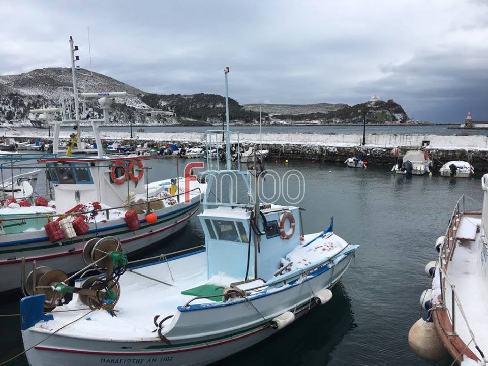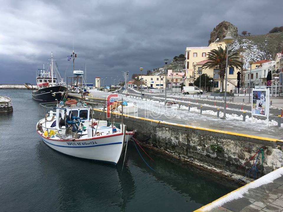 Το χιόνι έφτασε μέχρι τη θάλασσα, με τα ψαροκάικα στο λιμανάκι της Μύρινας να χαρίζουν υπέροχα ενσταντανέ.