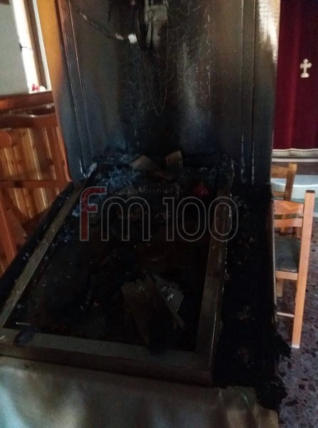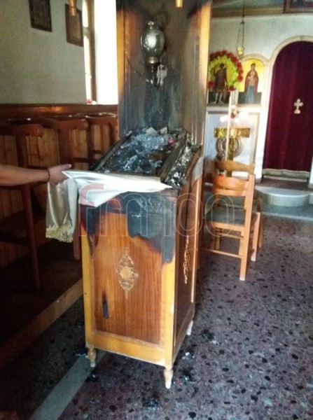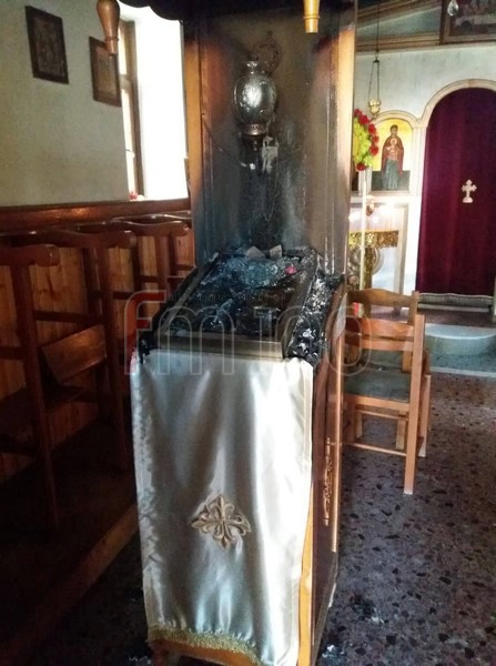 Όπως μας μεταφέρει κάτοικος του χωριού, το πρωί του Σαββάτου, όταν πήγε για το καθιερωμένο άναμμα του καντηλιού, αντίκρισε καμένη την εικόνα του Αγίου.
