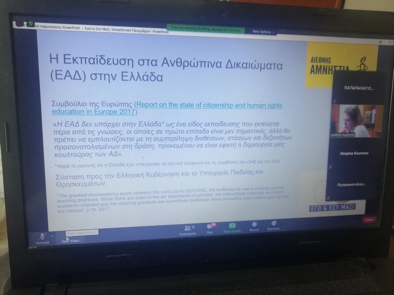 Ειδικότερα, στη σχετική ανακοίνωση του σχολείου αναφέρεται: «Με τα θερμότερα λόγια για το Γυμνάσιο Μούδρου και για τις καινοτόμες δράσεις του εκφράστηκε η υπεύθυνη του προγράμματος "Εγώ κι εσύ μαζί" του ελληνικού τμήματος της Διεθνούς Αμνηστίας, κ. Χατζηνικολάου, καθώς επιλεχθήκαμε ως ένα από τα δύο σχολεία που παρουσίασαν τις καλές πρακτικές τους στην εξ αποστάσεως επιμόρφωση των εκπαιδευτικών για τα ανθρώπινα δικαιώματα. Το πρόγραμμα συντόνισαν κατά το τρέχον σχολικό έτος οι κ.κ. Παπαπαναγιώτου Μαρία, Βρανά Τριανταφυλλιά και Αγάθου Κατερίνα. Το Γυμνάσιο Μούδρου έχει καταξιωθεί στο χώρο της εκπαίδευσης σε πανελλήνια κλίμακα ως ένα σχολείο εξωστρεφές, καινοτόμο, που καλλιεργεί στους μαθητές του την ενσυναίσθηση και ενδυναμώνει την προσωπικότητα τους».