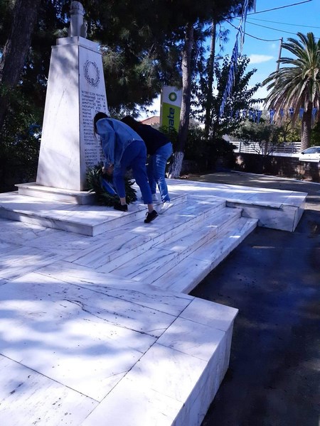 Ακολούθησε κατάθεση στεφάνου στο Ηρώον του Μούδρου από τις μαθήτριες της Γ' τάξης, Νεκταρία Γιαννέλη και Χριστίνα Σουλντίσα. Κατά τη διάρκεια των εκδηλώσεων τηρήθηκαν όλα τα υγειονομικά πρωτόκολλα.