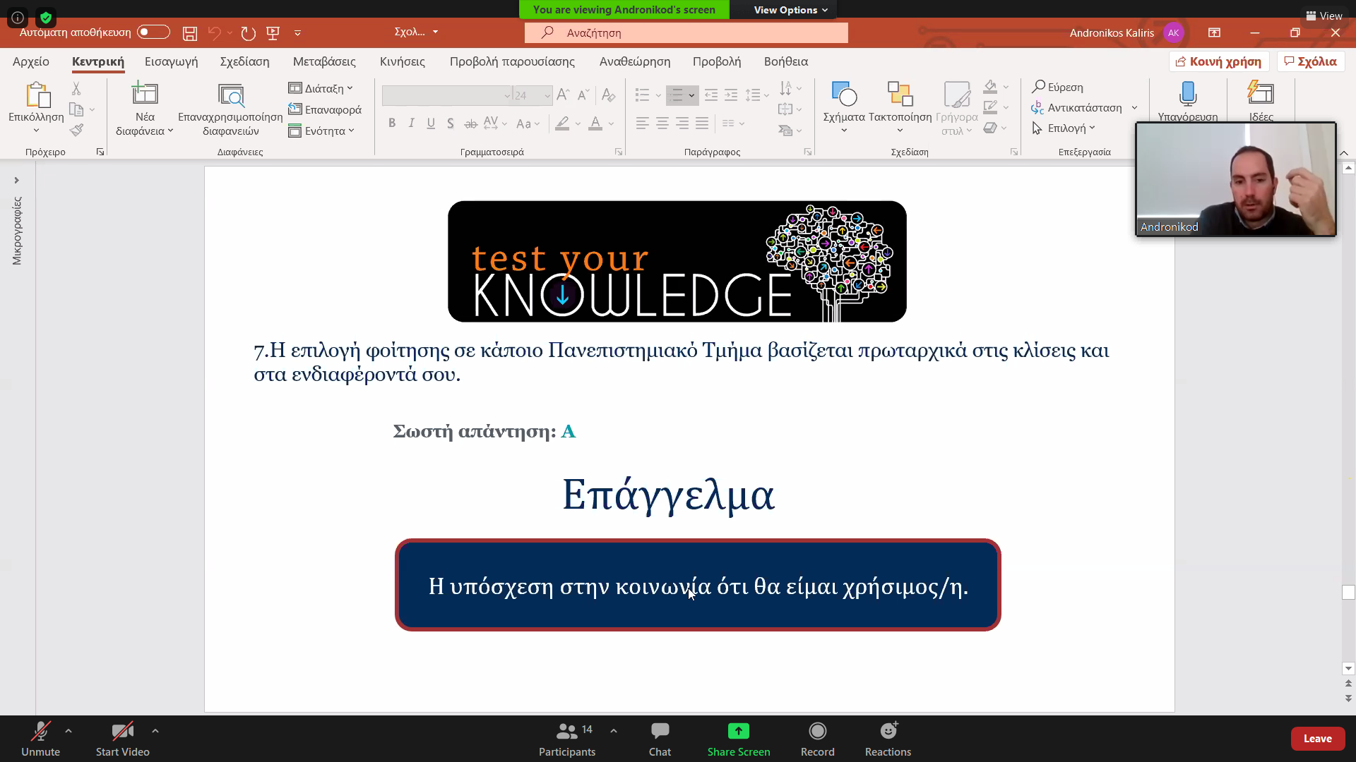 Ο κ. Ανδρόνικος Καλίρης, Σύμβουλος Εκπαίδευσης και Σταδιοδρομίας του Γραφείου Διασύνδεσης του Πανεπιστημίου, παρουσίασε όλες τις προοπτικές σπουδών, συζήτησε με τους μαθητές και τις μαθήτριές μας και δέχτηκε με προθυμία να απαντήσει στις ερωτήσεις τους.