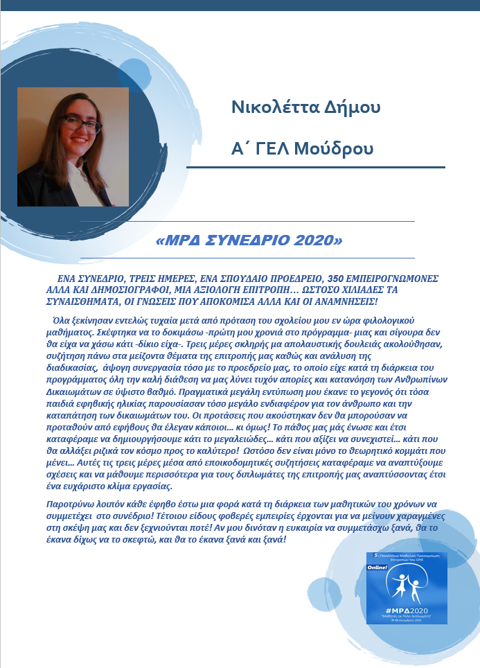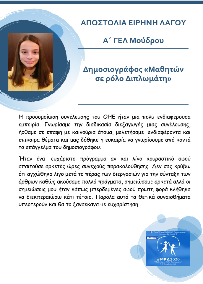 Οι μαθήτριες Νικολέττα Δήμου ως Διπλωμάτης της Τυνησίας στην Επιτροπή για την Ελευθερία Σκέψης, Συνείδησης και Θρησκείας και οι Δήμητρα Άντων και Αποστολία Ειρήνη Λαγού ως Δημοσιογράφοι των Διπλωματικών συζητήσεων για την Ελευθερία της Έκφρασης και το Δικαίωμα στη Ζωή εκπροσώπησαν το σχολείο μας και τη Λήμνο. Οι μαθήτριες δήλωσαν ενθουσιασμένες από το Πρόγραμμα και μοιράζονται τις εμπειρίες τους.