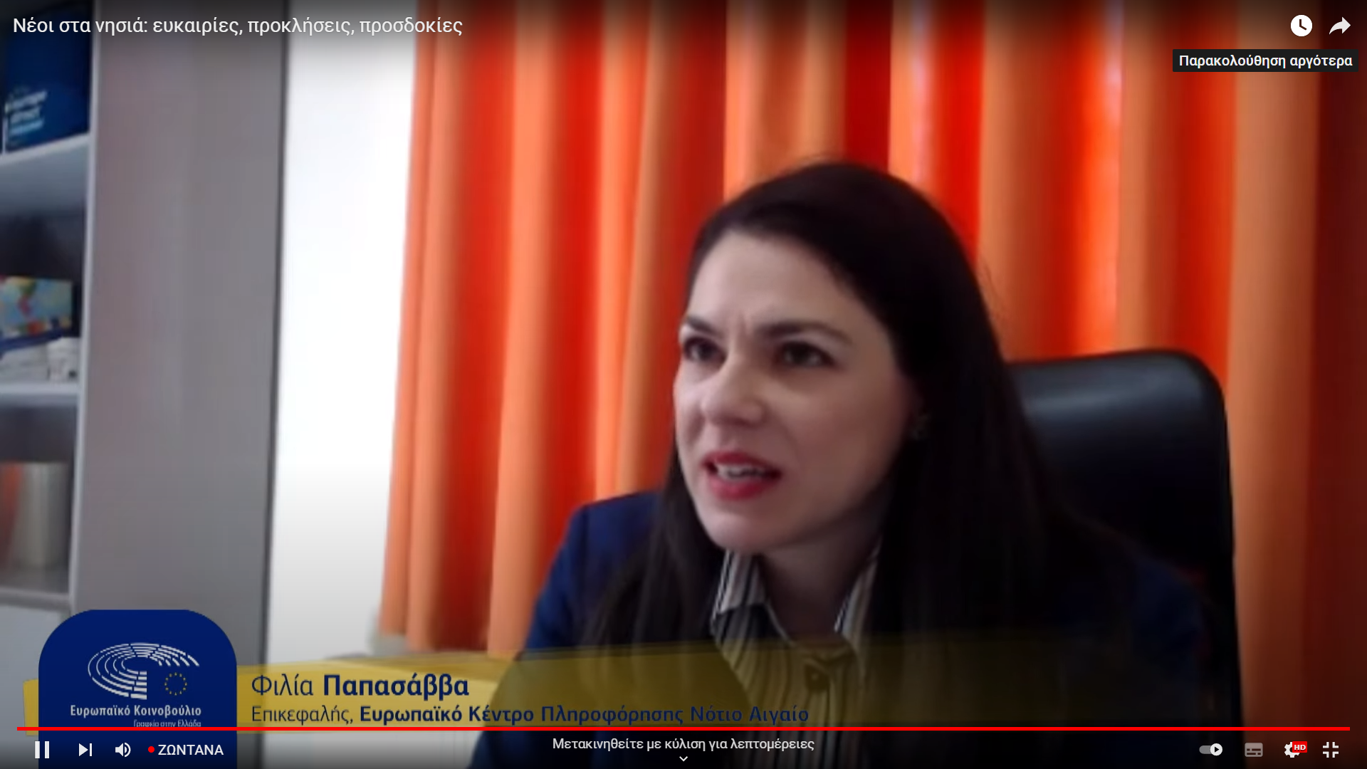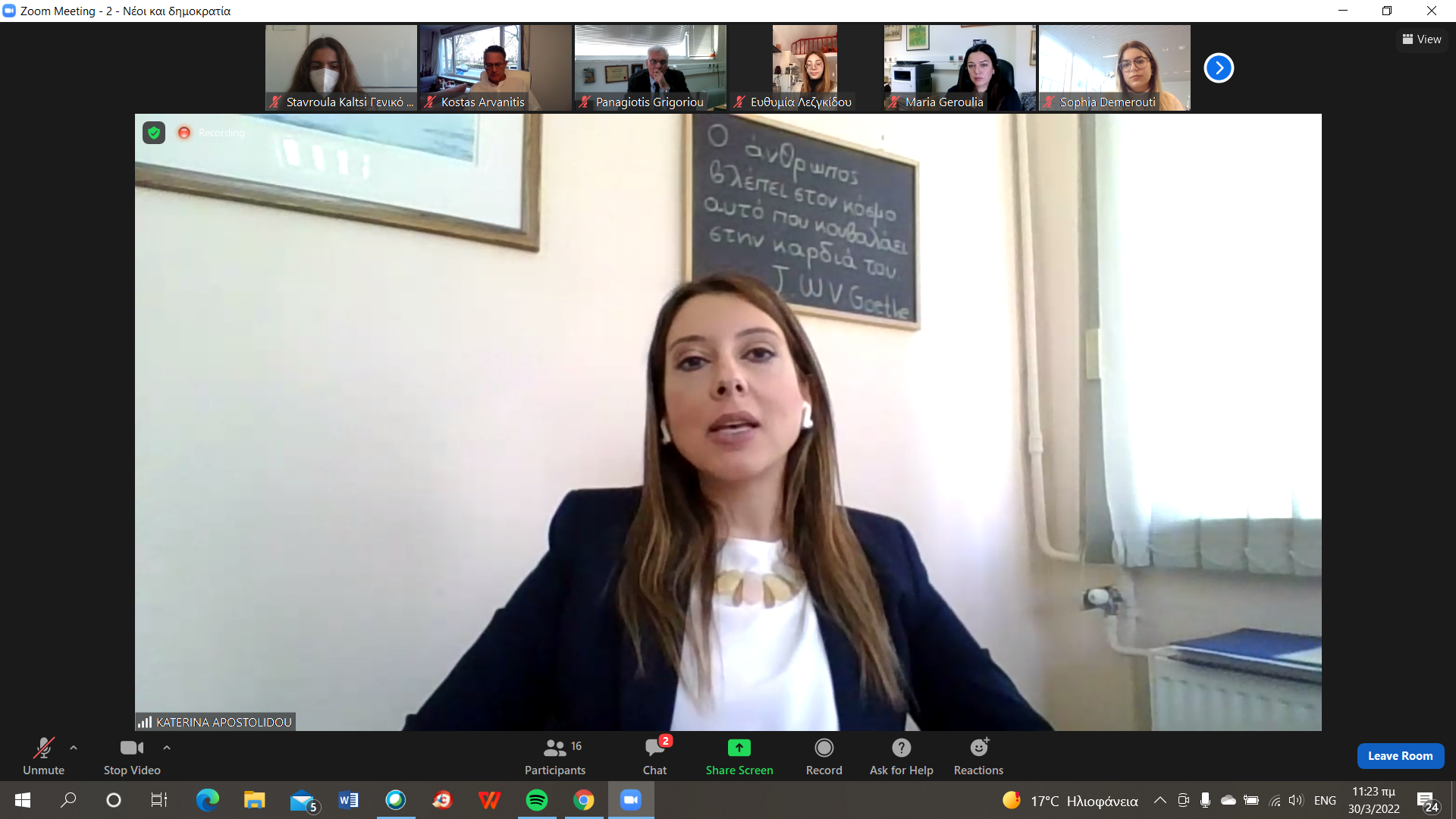 Η μαθήτρια συμμετείχε στην ομάδα συζήτησης: "Νέοι και δημοκρατία: Συμμετοχή των νέων στα κέντρα λήψης αποφάσεων, συμμετοχή στα κοινά (εκλέγειν και εκλέγεσθαι), παραπληροφόρηση, ριζοσπαστικοποίηση, εθνικισμός". Συντονιστής της συζήτησης ήταν ο κ. Παναγιώτης Γρηγορίου, Επικεφαλής του Ευρωπαϊκού Κέντρου Πληροφόρησης Βορείου Αιγαίου και στη συζήτηση συμμετείχε ο Ευρωβουλευτής κ. Κώστας Αρβανίτης (Η Αριστερά), καθώς και μαθητές και μαθήτριες σχολείων του Προγράμματος, φοιτητές και φοιτήτριες, συνεργάτες του Κέντρου Ευρωπαϊκής Πληροφόρησης Β. Αιγαίου και εθελοντές.