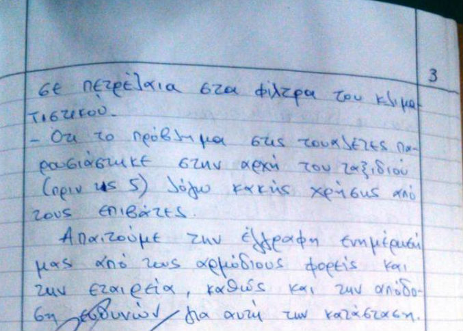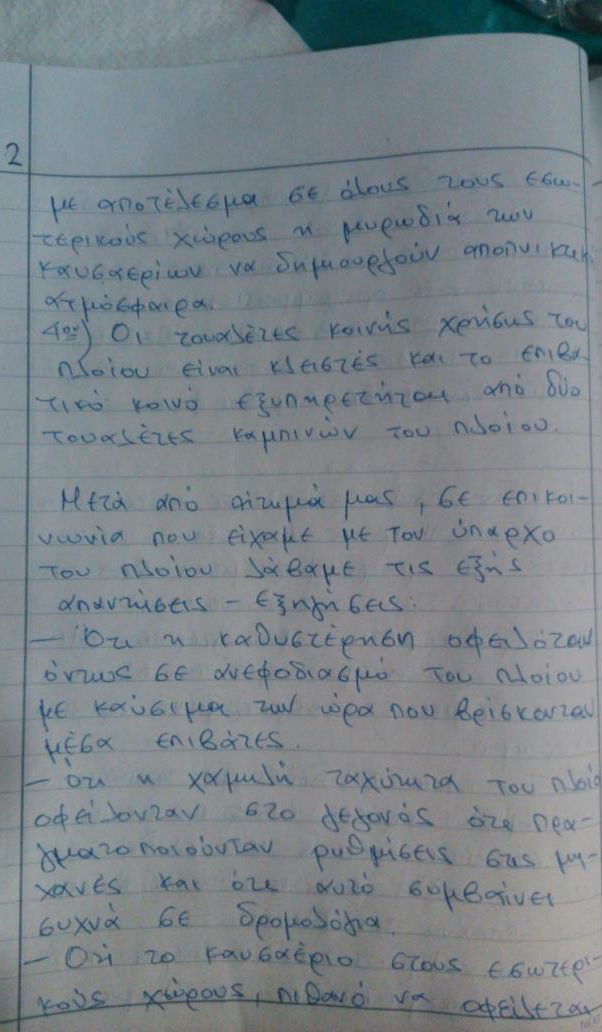 Δηλώνουν ότι οι αξιωματικοί του πλοίου, απάντησαν στα παράπονά τους, ότι το πλοίο άργησε να φύγει γιατί ανεφοδιάζονταν, ότι δεν πηγαίνει αργά, αλλά τους φαίνεται, ότι φταίνε οι ίδιοι για τη μη λειτουργία των WC, καθώς και άλλες δικαιολογίες. Εν πλω συγκεντρώθηκαν υπογραφές επιβατών και όταν το πλοίο έπιασε το πρώτο λιμάνι (Σύρος) έκαναν καταγγελία στο τοπικό λιμεναρχείο, ενώ οι επόμενες ενέργειες θα γίνουν όταν φτάσουν στο νησί τους και φυσικά όταν συνέλθουν.