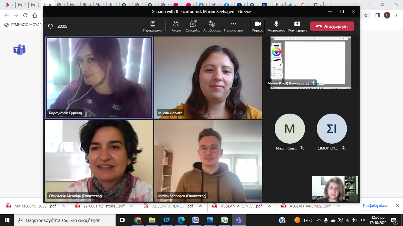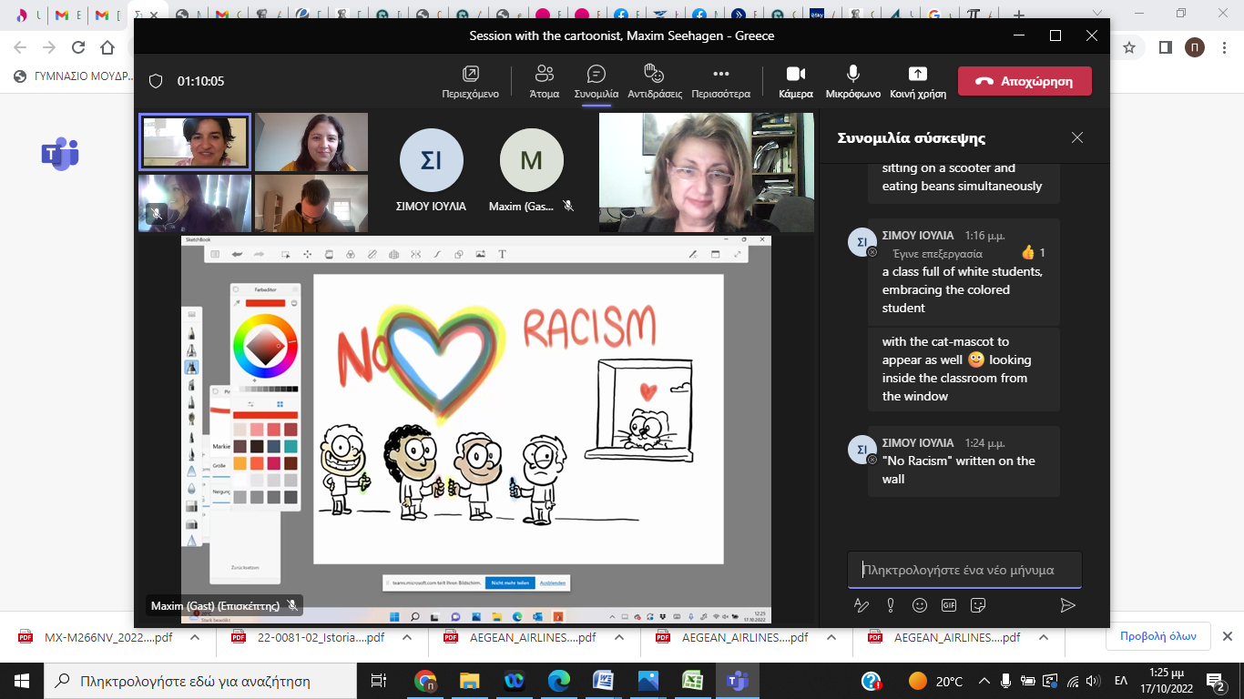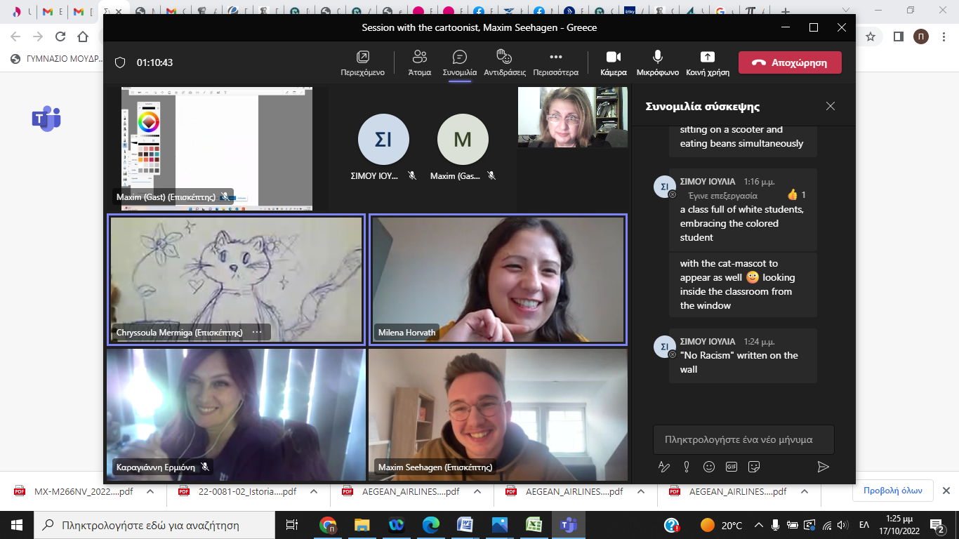 Στη διάρκεια της συνεδρίας οι μαθητές είχαν την ευκαιρία να μιλήσουν με τον καρτουνίστα και να εκφράσουν επιθυμίες που σκίτσαρε ζωντανά γι΄αυτούς ο καρτουνίστας, ο οποίος δημιουργούσε επιτόπου πρωτότυπα σχέδια. Όλα τα καρτούν που ζωγραφίστηκαν κατά την συνάντηση θα σταλούν ψηφιακά στο σχολείο. Η συνάντηση ολοκληρώθηκε με ένα αντιρατσιστικό μήνυμα των μαθητών που πήρε μορφή με τη βοήθεια του καρτουνίστα και την αφιέρωση ενός ευχαριστηρίου σκίτσου από τους μαθητές προς εκείνον.