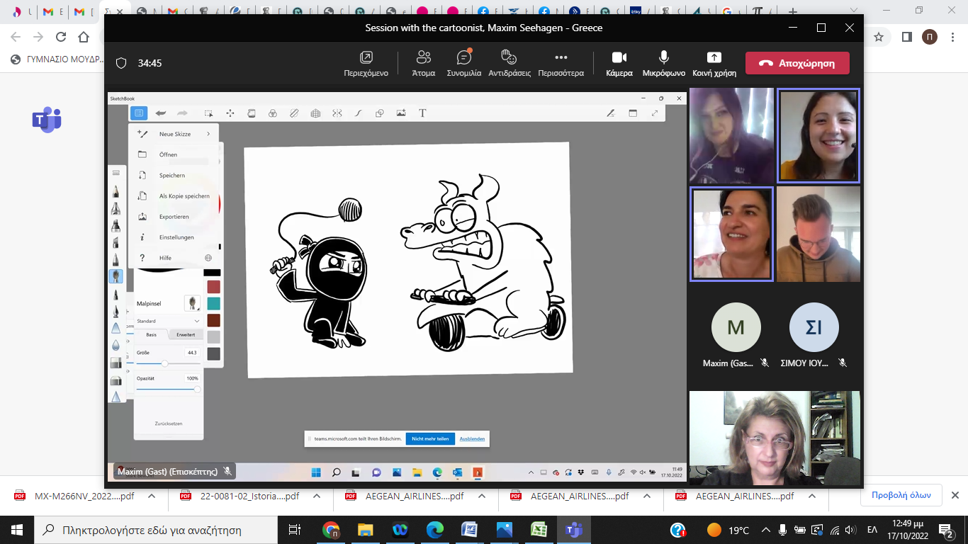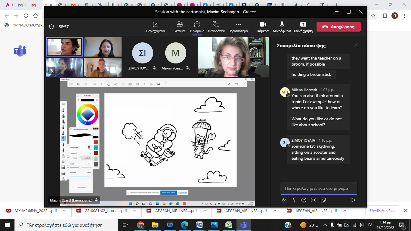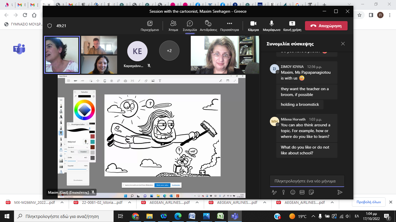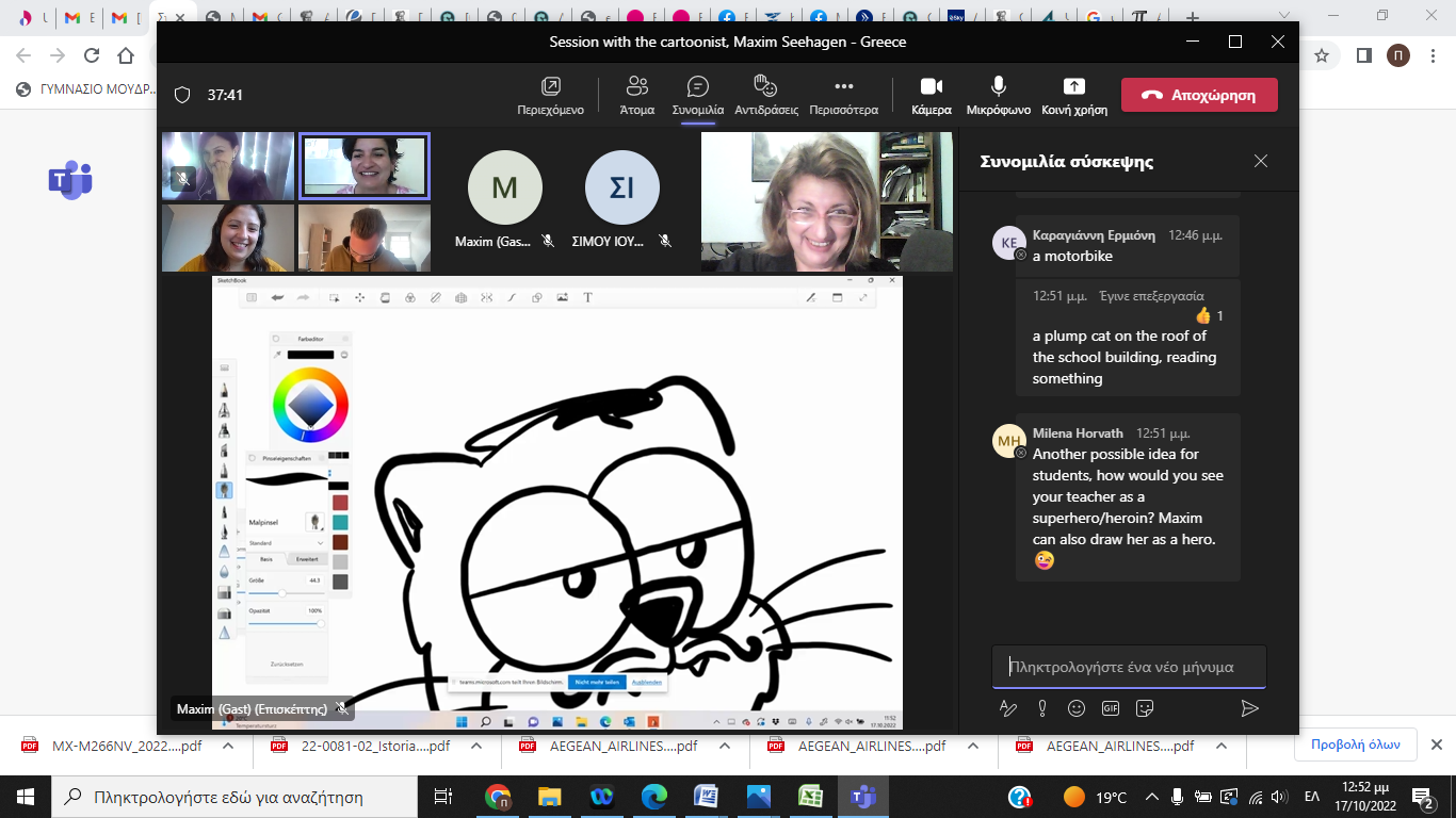 Στη διάρκεια της συνεδρίας οι μαθητές είχαν την ευκαιρία να μιλήσουν με τον καρτουνίστα και να εκφράσουν επιθυμίες που σκίτσαρε ζωντανά γι΄αυτούς ο καρτουνίστας, ο οποίος δημιουργούσε επιτόπου πρωτότυπα σχέδια. Όλα τα καρτούν που ζωγραφίστηκαν κατά την συνάντηση θα σταλούν ψηφιακά στο σχολείο. Η συνάντηση ολοκληρώθηκε με ένα αντιρατσιστικό μήνυμα των μαθητών που πήρε μορφή με τη βοήθεια του καρτουνίστα και την αφιέρωση ενός ευχαριστηρίου σκίτσου από τους μαθητές προς εκείνον.
