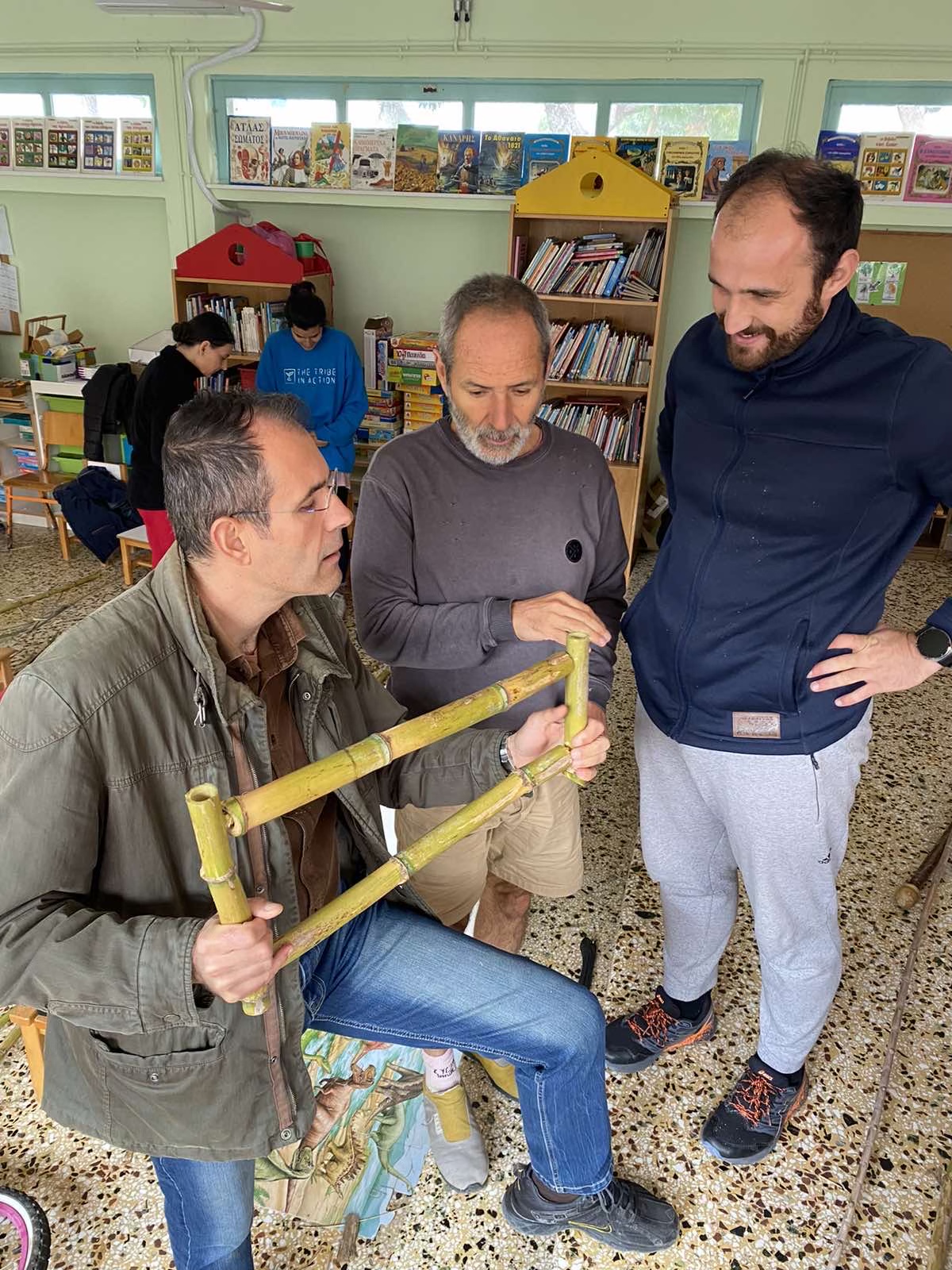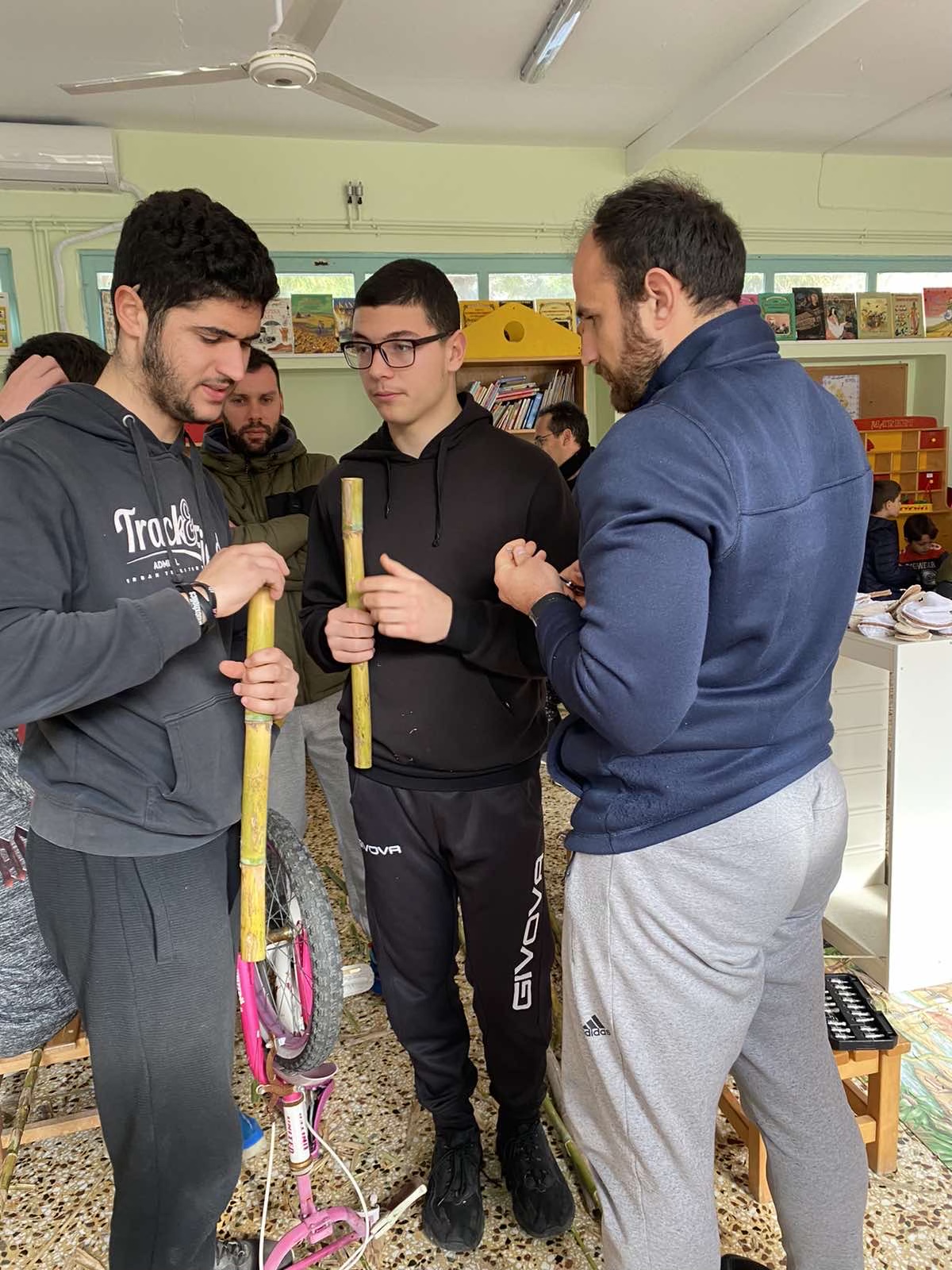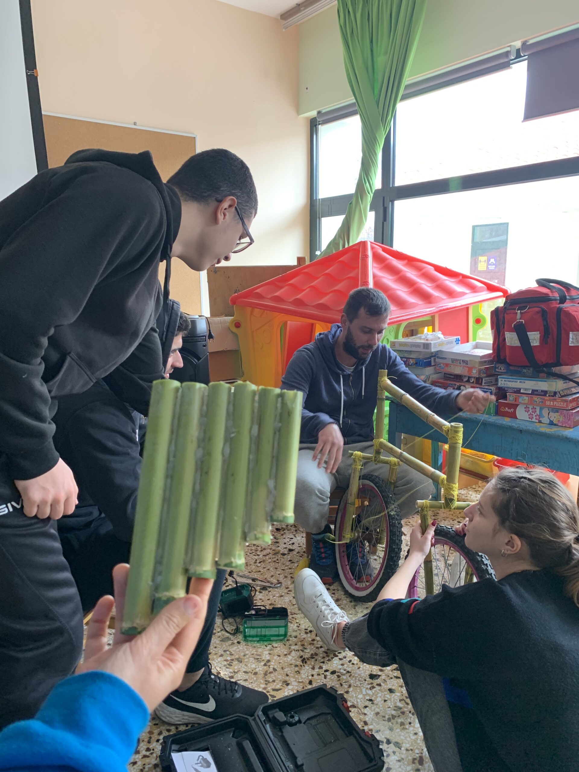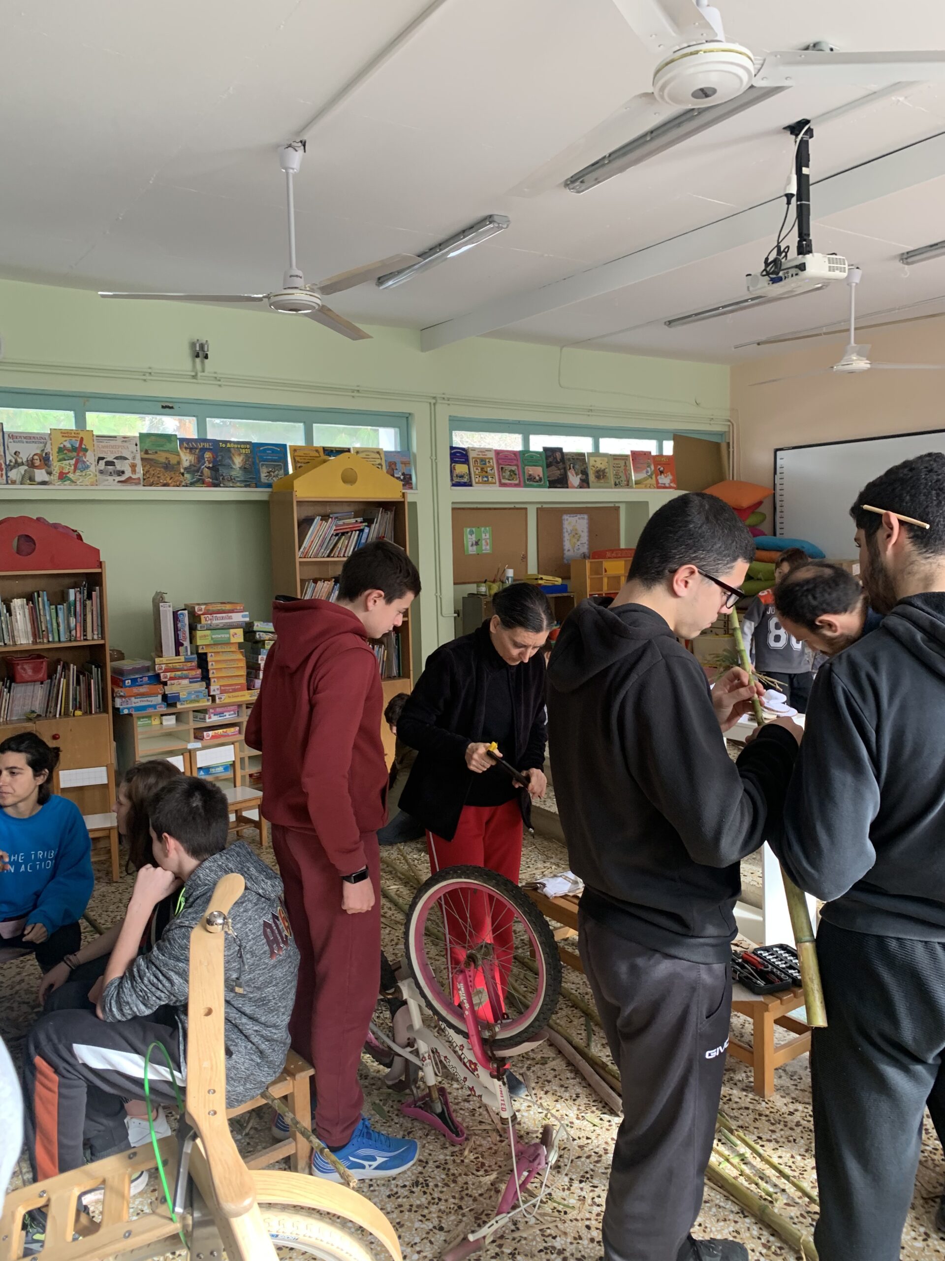 Στη συνέχεια, η θεωρία έγινε πράξη μέσα από την κατασκευή μουσικών οργάνων, παιχνιδιών και χρηστικών αντικειμένων, όπως ποτήρια και κουτάλια, από καλάμια και αλλά ντόπια υλικά, την ανακατασκευή ενός ποδηλάτου από τα σκουπίδια και τη φύτευση 30 ελαιοδένδρων!