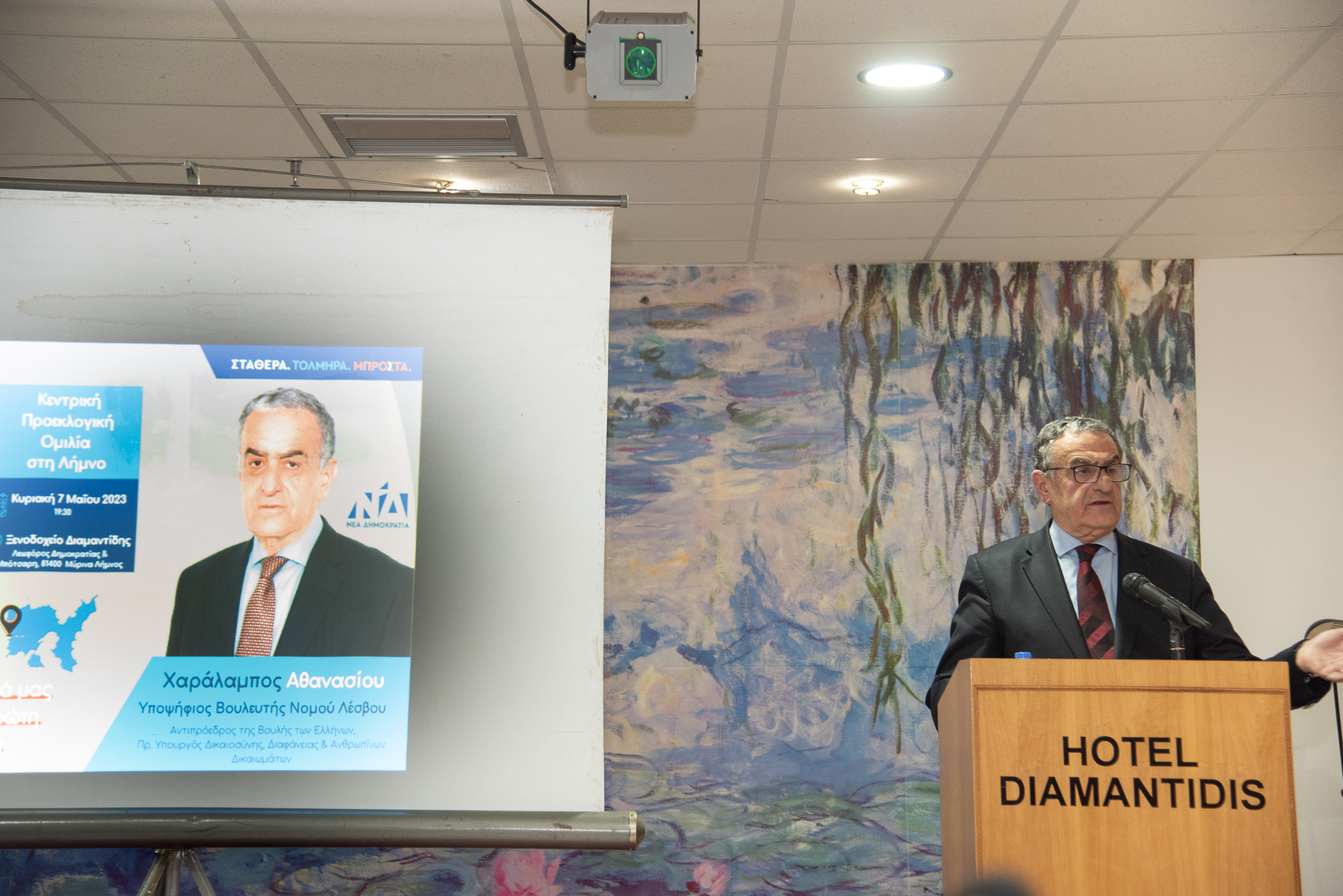 Πραγματοποιήθηκε χθες στην κατάμεστη αίθουσα του ξενοδοχείου Διαμαντίδης στη Μύρινα της Λήμνου με μεγάλη επιτυχία η προεκλογική ομιλία του Αντιπροέδρου της Βουλής και Υποψηφίου Βουλευτή Νομού Λέσβου Χαράλαμπου Αθανασίου .