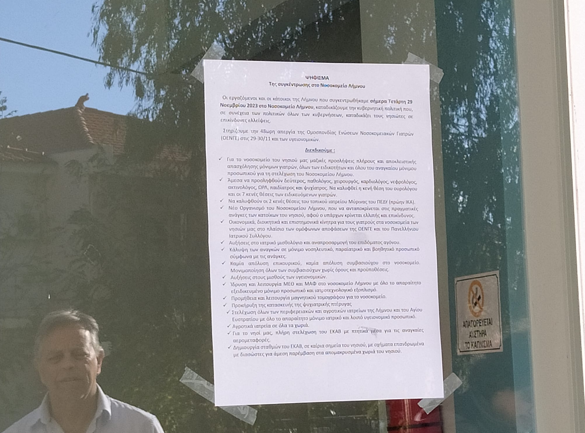 "Οι εργαζόμενοι και οι κάτοικοι της Λήμνου που συγκεντρωθήκαμε σήμερα Τετάρτη 29 Νοεμβρίου 2023 στο Νοσοκομείο Λήμνου, καταδικάζουμε την κυβερνητική πολιτική που, σε συνέχεια των πολιτικών όλων των κυβερνήσεων, καταδικάζει τους νησιώτες σε επικίνδυνες ελλείψεις.