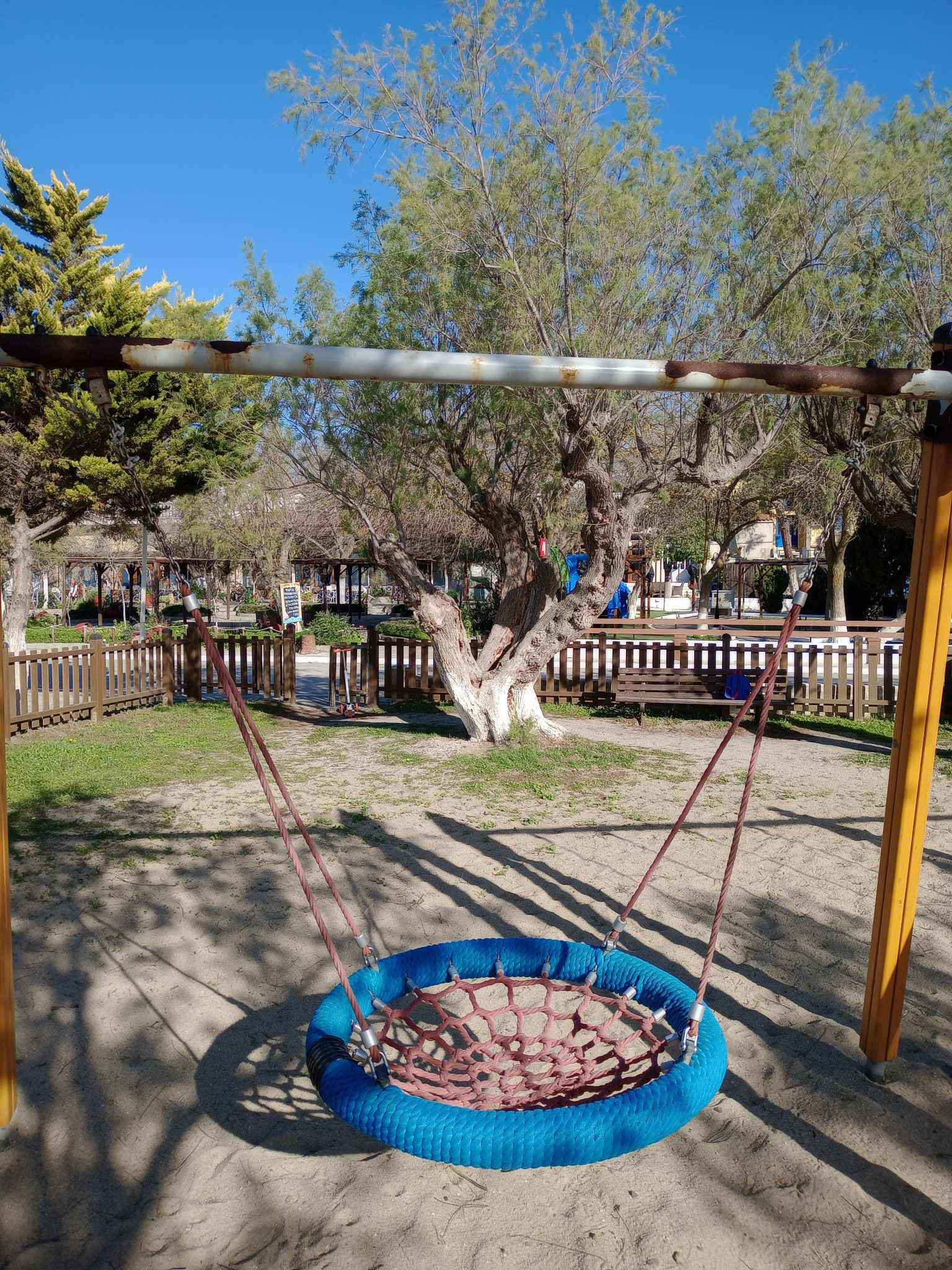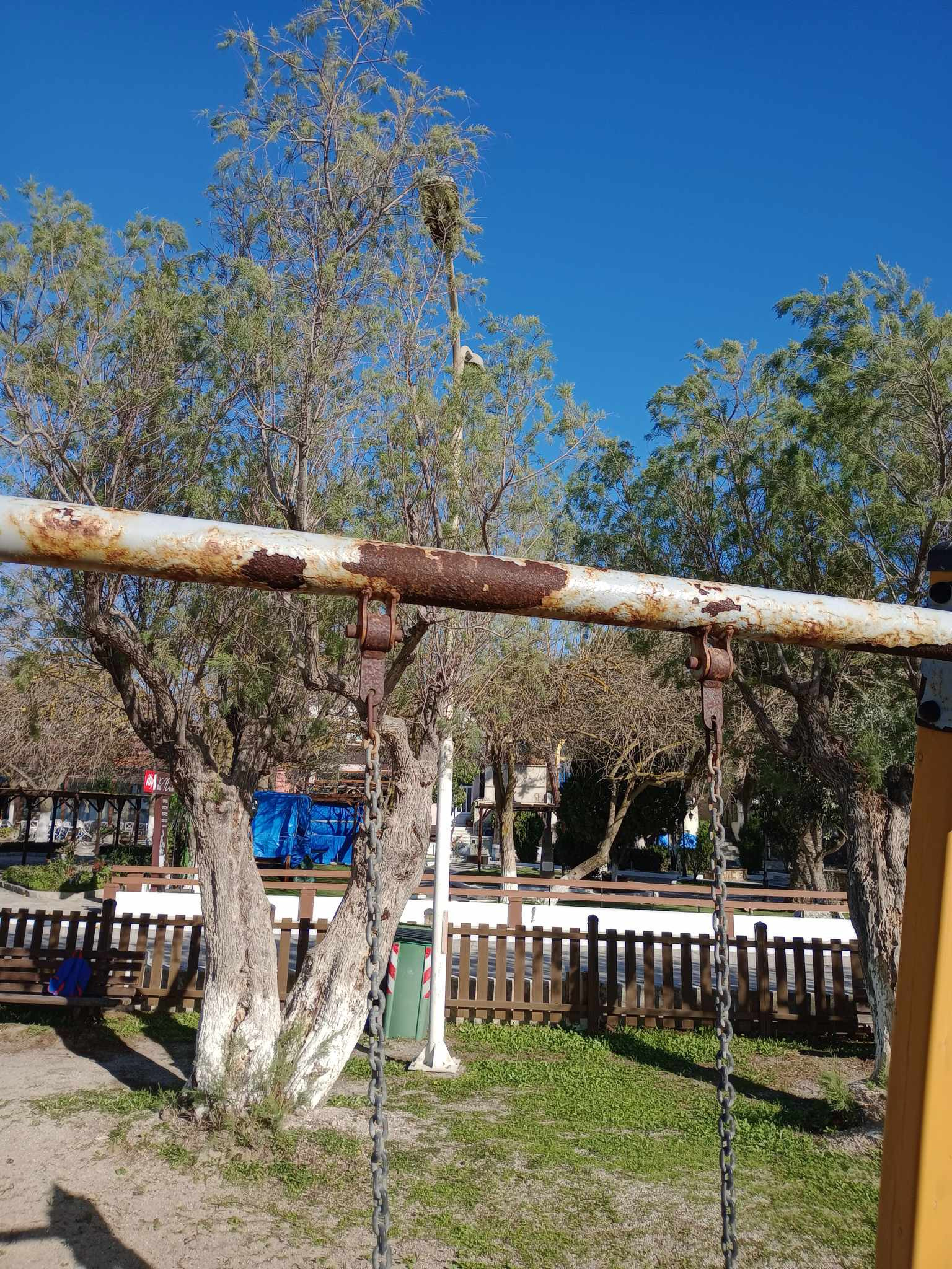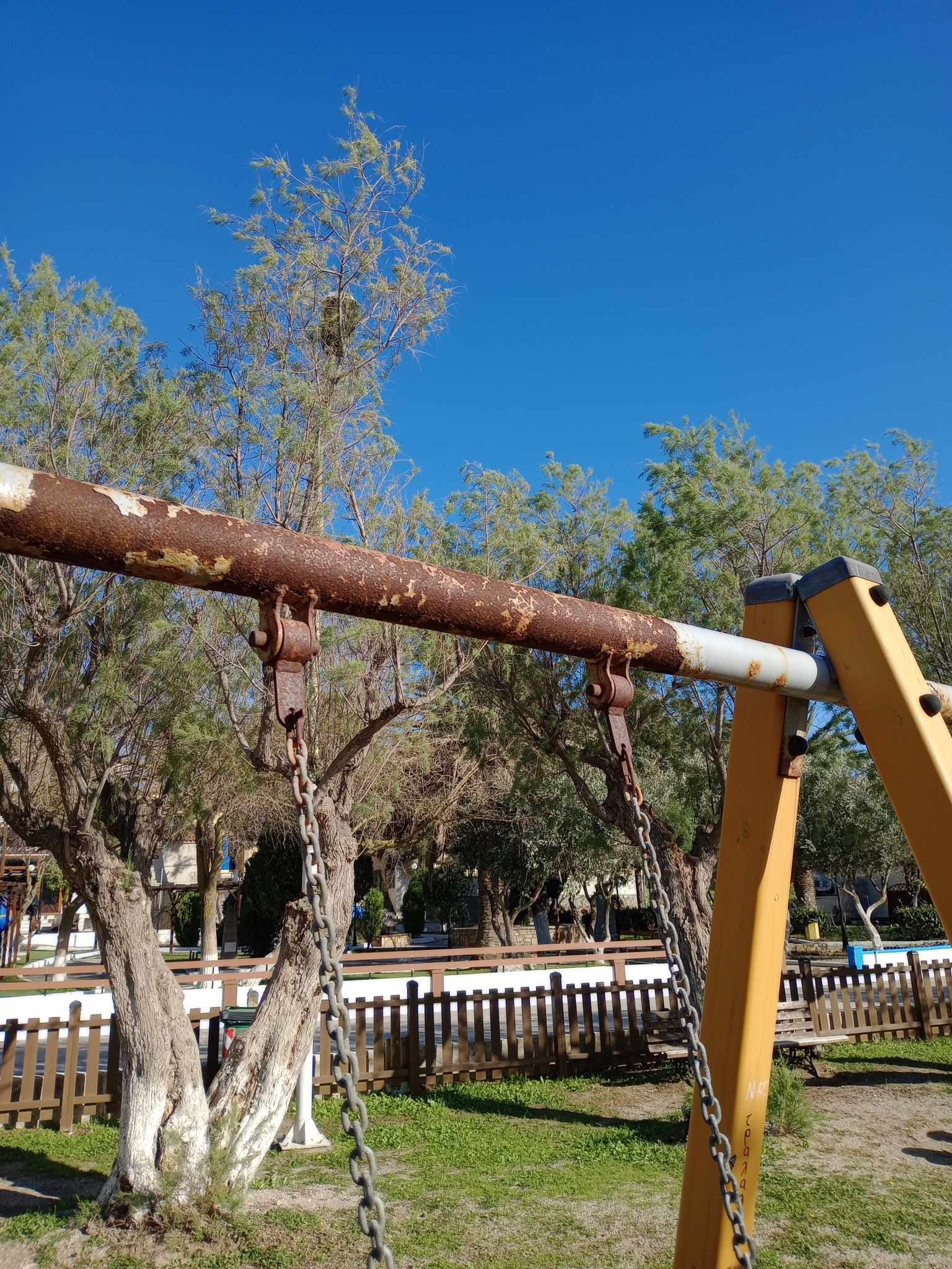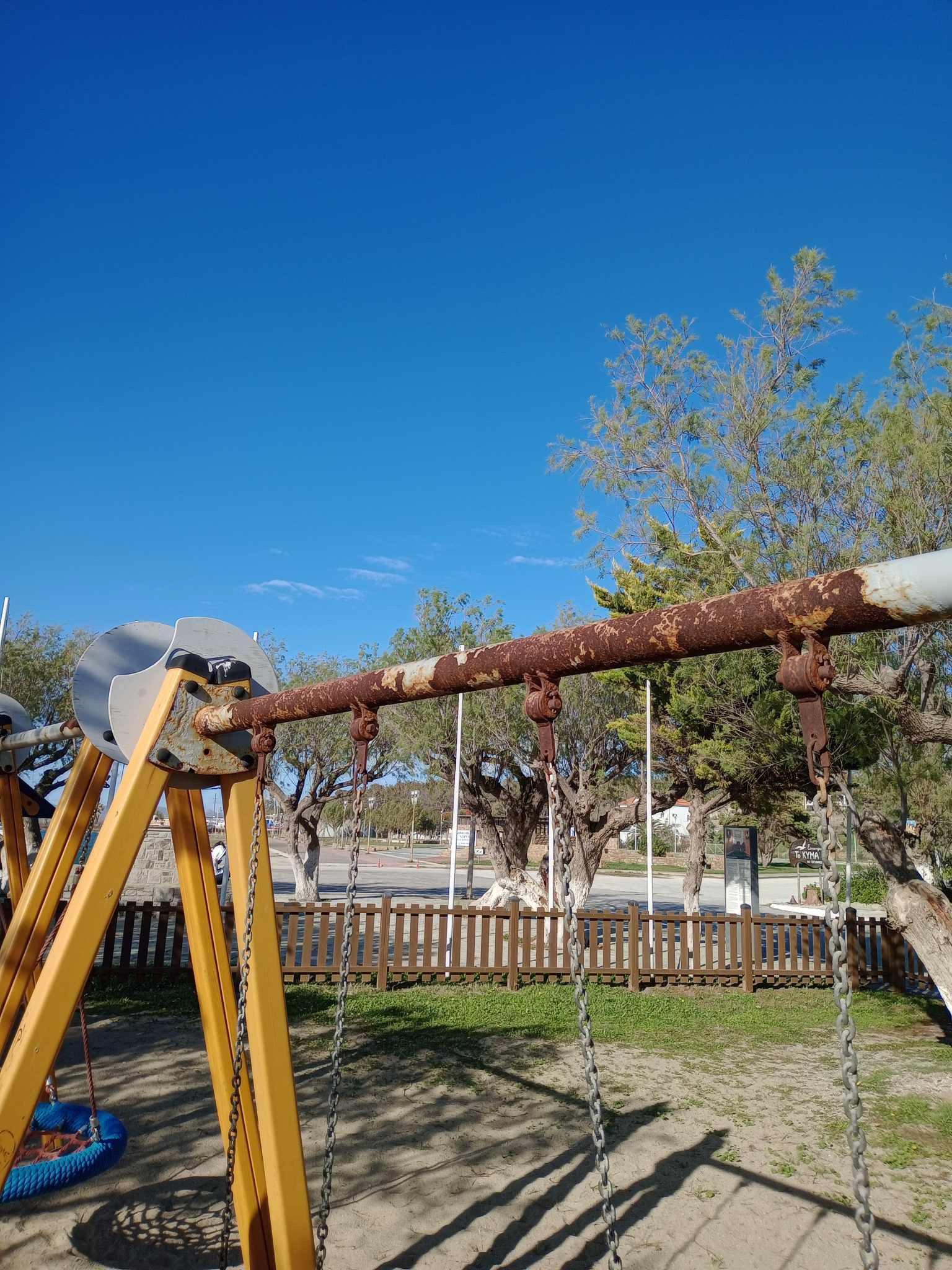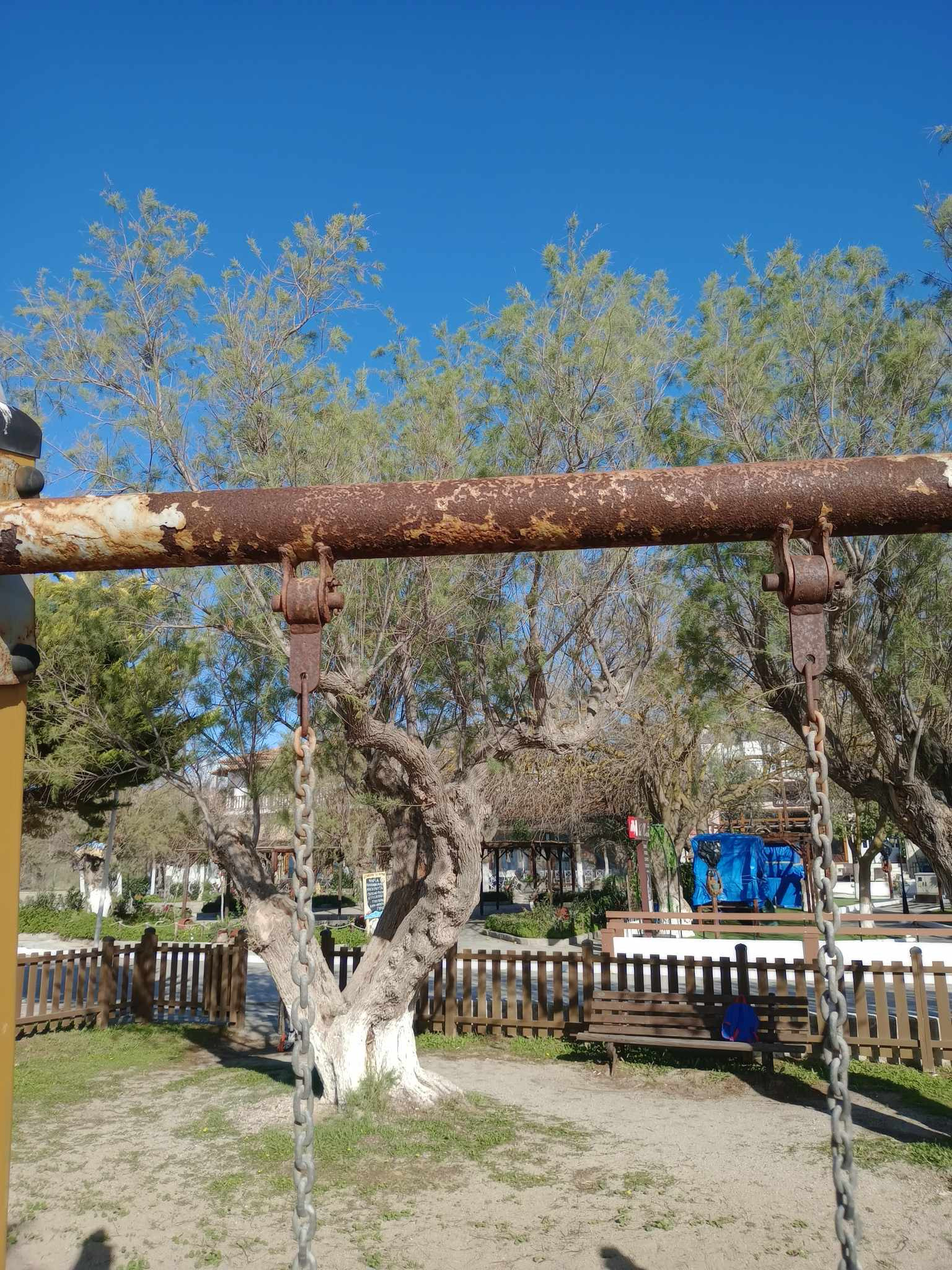Στην προκειμένη περίπτωση, όπως έχει αποτυπώσει και ο φωτογραφικός φακός, το χρώμα που κυριαρχεί στην παιδική χαρά του Μούδρου, είναι αυτό της σκουριάς, και ως γνωστόν, δεν είναι το καταλληλότερο χρώμα για παιδικές χαρές…