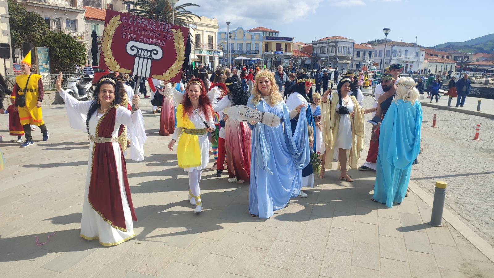 Η παρουσία του ΧΟΛ Ήφαιστος, που βρίσκονταν στην κορυφή της παρέλασης, ήταν εντυπωσιακή, από τη σύλληψη της ιδέας έως την εφαρμογή της, με εντυπωσιακό άρμα, στολές φροντισμένες μέχρι την τελευταία λεπτομέρεια και με θέμα συνυφασμένο με τη μυθολογία της Λήμνου.