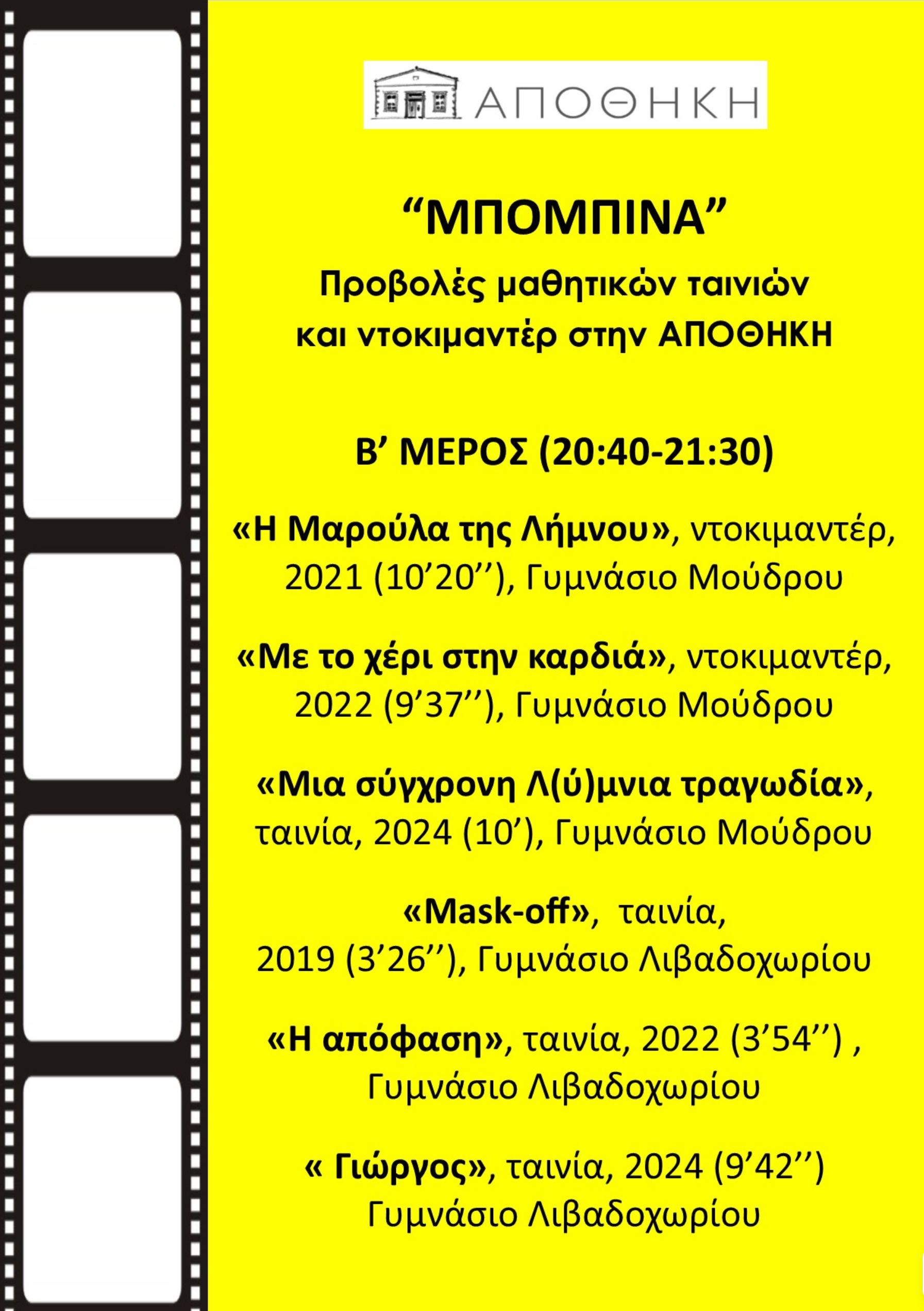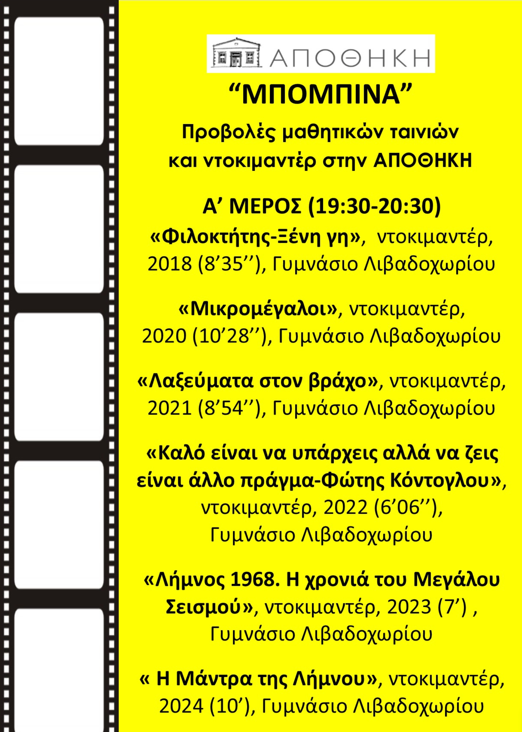 Οι ταινίες και τα ντοκιμαντέρ που θα προβληθούν αποτελούν εργασίες των μαθητών των τελευταίων χρόνων, ενώ δεν έχει πραγματοποιηθεί προηγουμένως δημόσια προβολή τους στη Λήμνο.