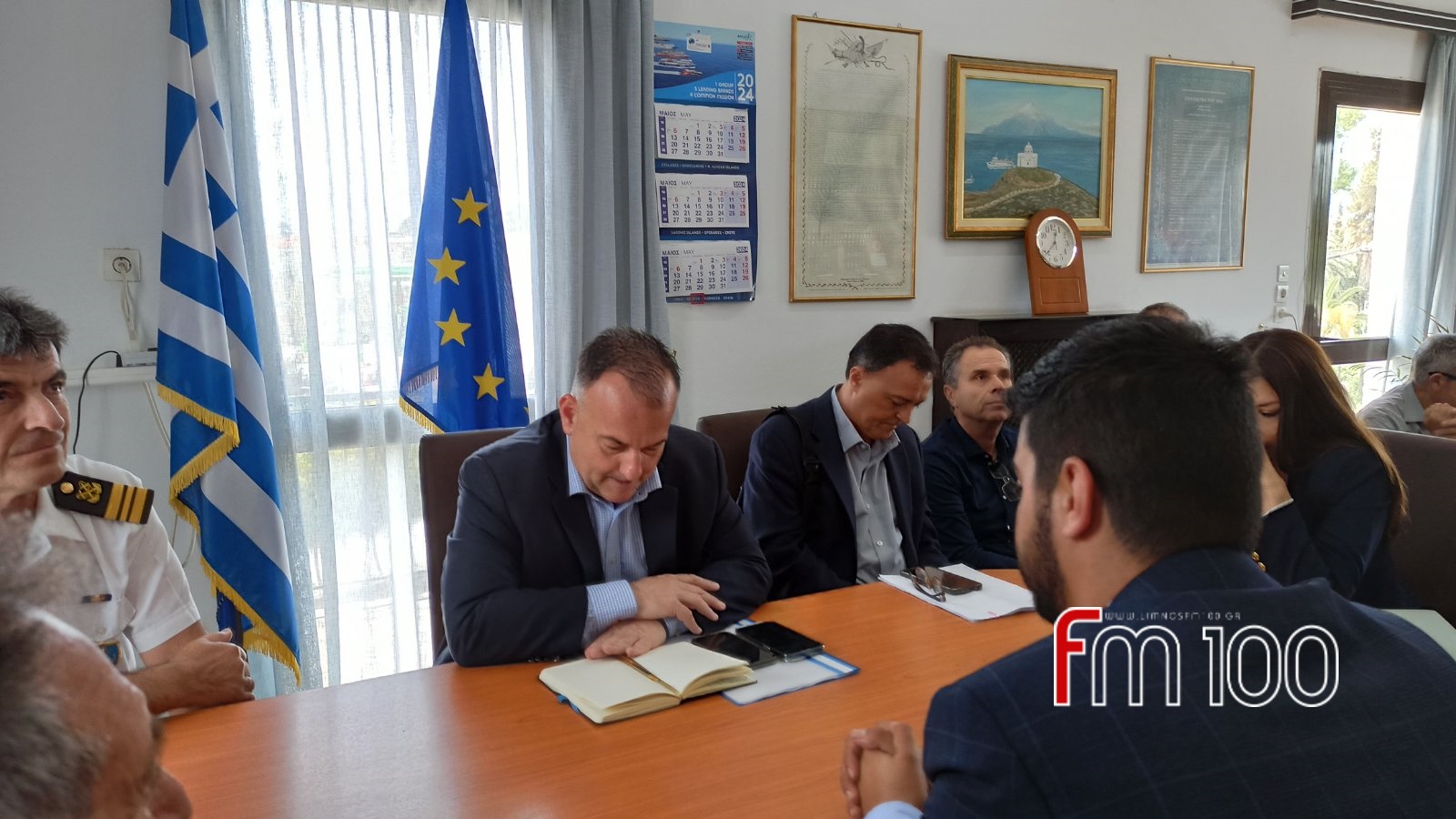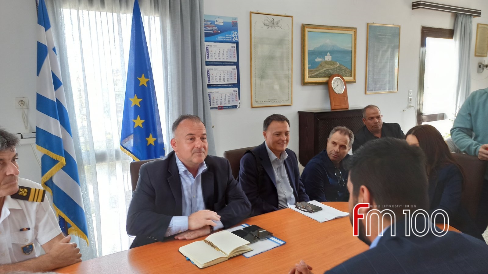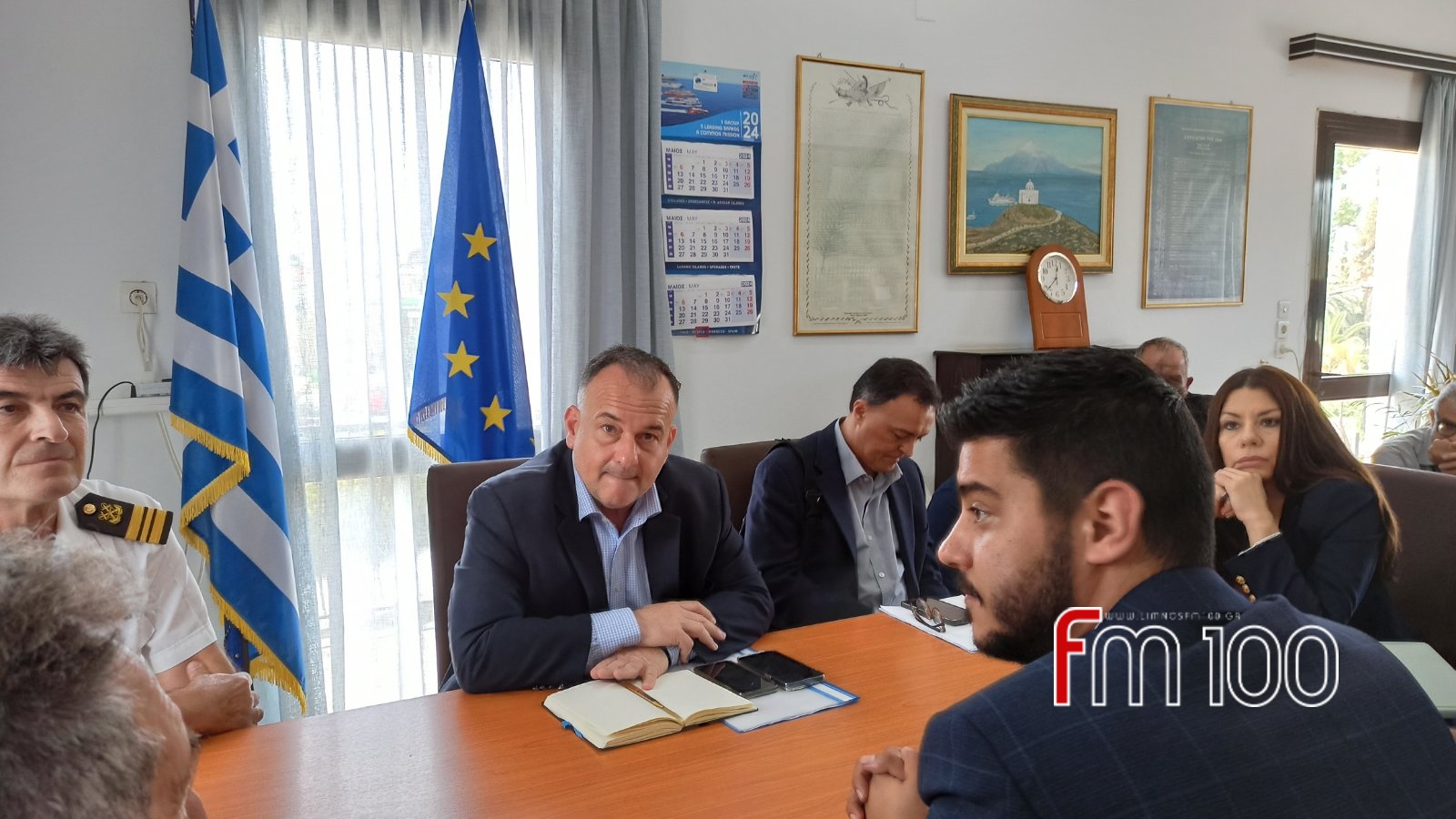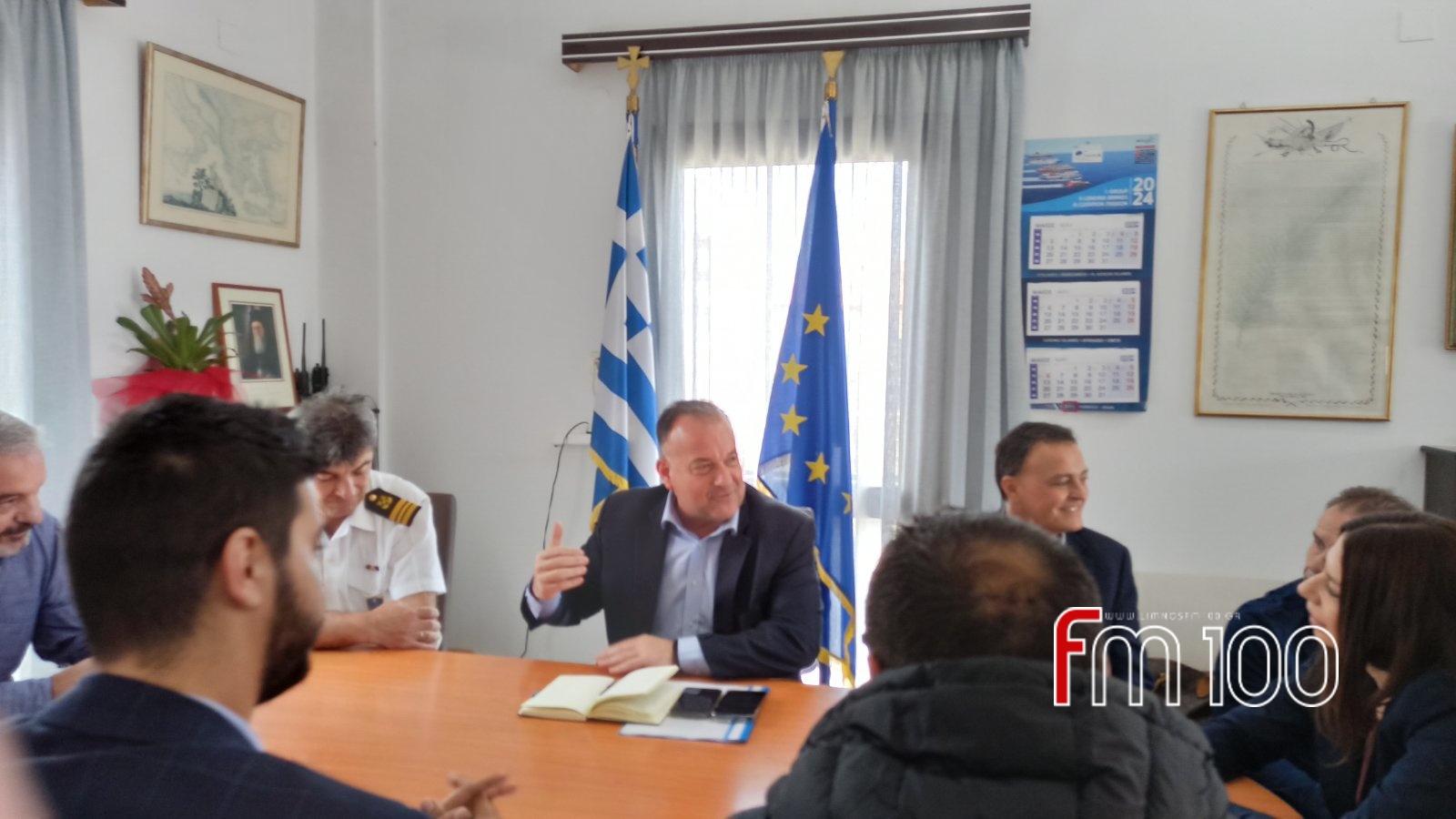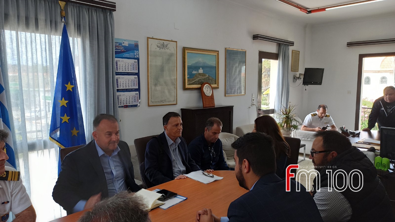 Οι δυο άνδρες έφτασαν στη Λήμνο λίγο πριν τις 12 το μεσημέρι και κατευθυνθήκαν αμέσως στο Επαρχείο όπου και συνομίλησαν με τον Έπαρχο Λήμνου κ. Απόστολο Κουτσογιάννη ο οποίος έθεσε ορισμένα από τα προβλήματα που αντιμετωπίζει το νησί στο κομμάτι της ακτοπλοΐας.