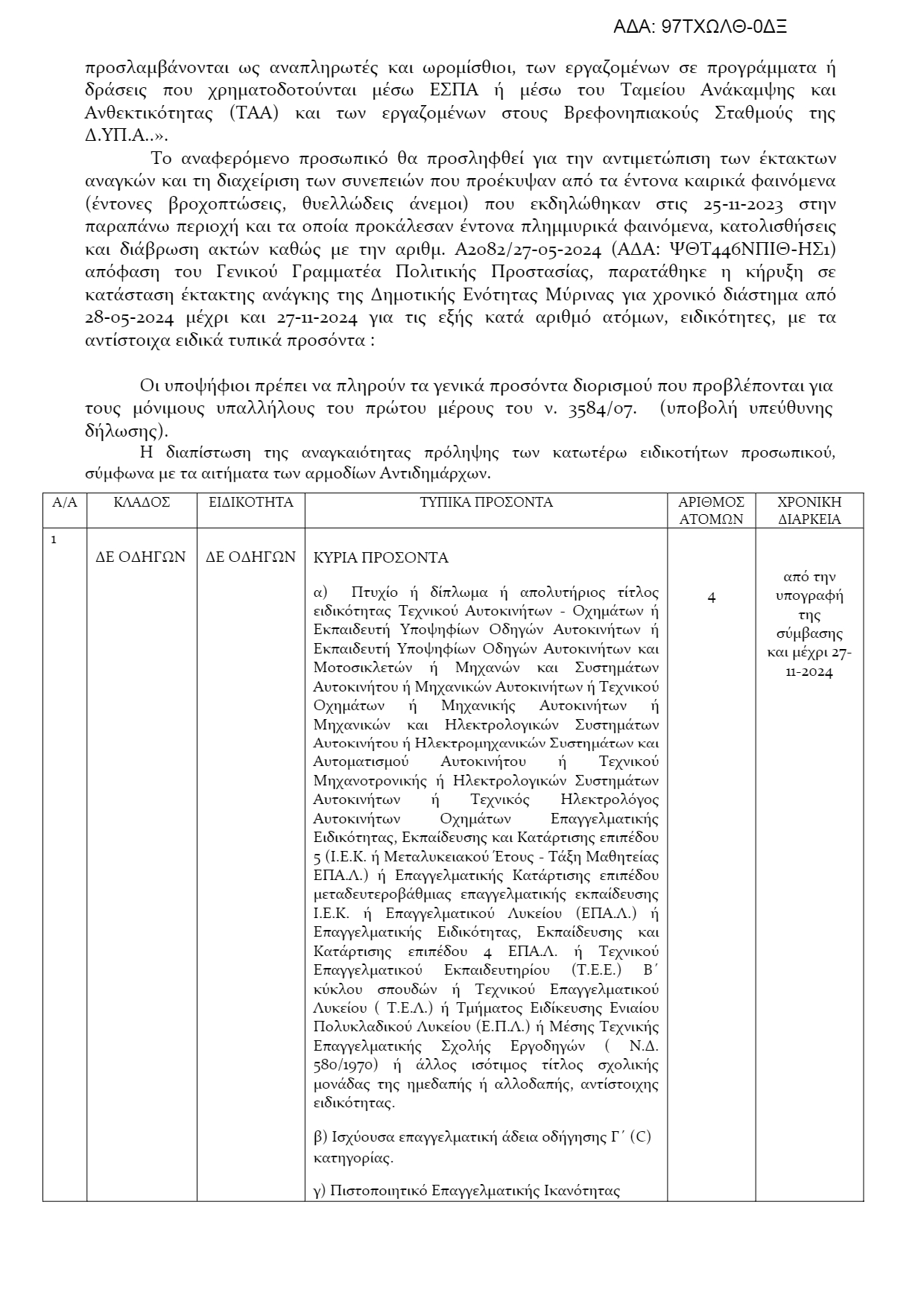 Το αναφερόμενο προσωπικό θα προσληφθεί για την αντιμετώπιση των έκτακτων αναγκών και τη διαχείριση των συνεπειών που προέκυψαν από τα έντονα καιρικά φαινόμενα (έντονες βροχοπτώσεις, θυελλώδεις άνεμοι) που εκδηλώθηκαν στις 25-11-2023.