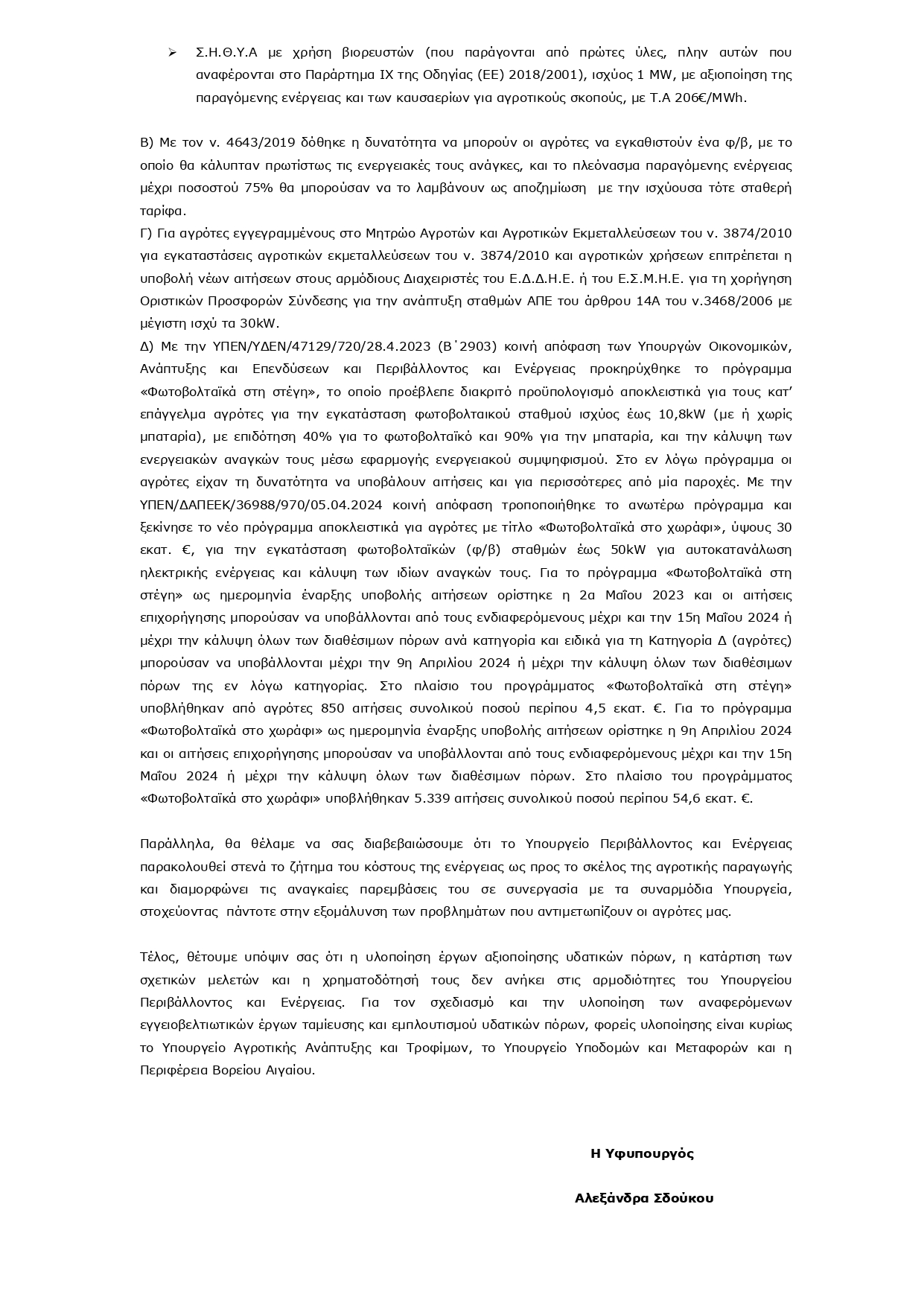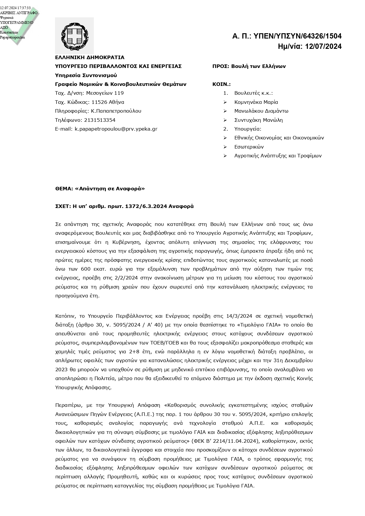 Μετά την απάντηση του Υπουργείου Αγροτικής Ανάπτυξης και Τροφίμων, καθώς και του Υπουργείου Ναυτιλίας και Νησιωτικής Πολιτικής, στην αναφορά της Μαρίας Κομνηνάκα και άλλων βουλευτών του ΚΚΕ στην αναφορά με τα αιτήματα της Συντονιστικής Επιτροπής Αγώνα των αγροτών, είχαμε απάντηση και από το Υπουργείο Περιβάλλοντος και Ενέργειας.
