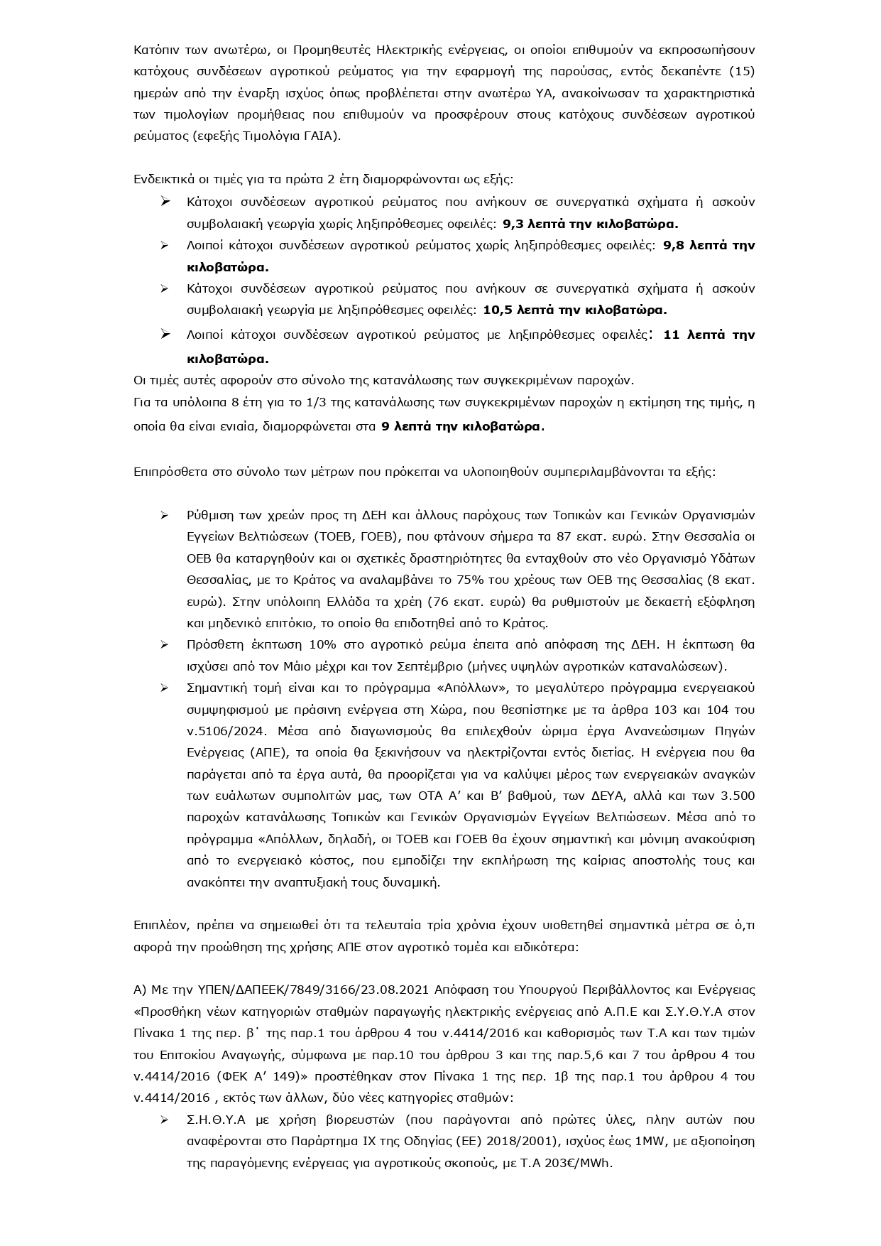 Στο αίτημα για φθηνό αγροτικό ρεύμα, το Υπουργείο παραπέμπει τους αγρότες, μεταξύ άλλων, στα τιμολόγια ΓΑΙΑ της ΔΕΗ, όπου αναφέρονται τιμές από 9.3 λεπτά την κιλοβατώρα, μέχρι 11 λεπτά την κιλοβατώρα για τα 2 πρώτα χρόνια, και 9 λεπτά την κιλοβατώρα για τα επόμενα 8 χρόνια, τη στιγμή που το 2020 η τιμή του αγροτικού ρεύματος ήταν 7 λεπτά την κιλοβατώρα!