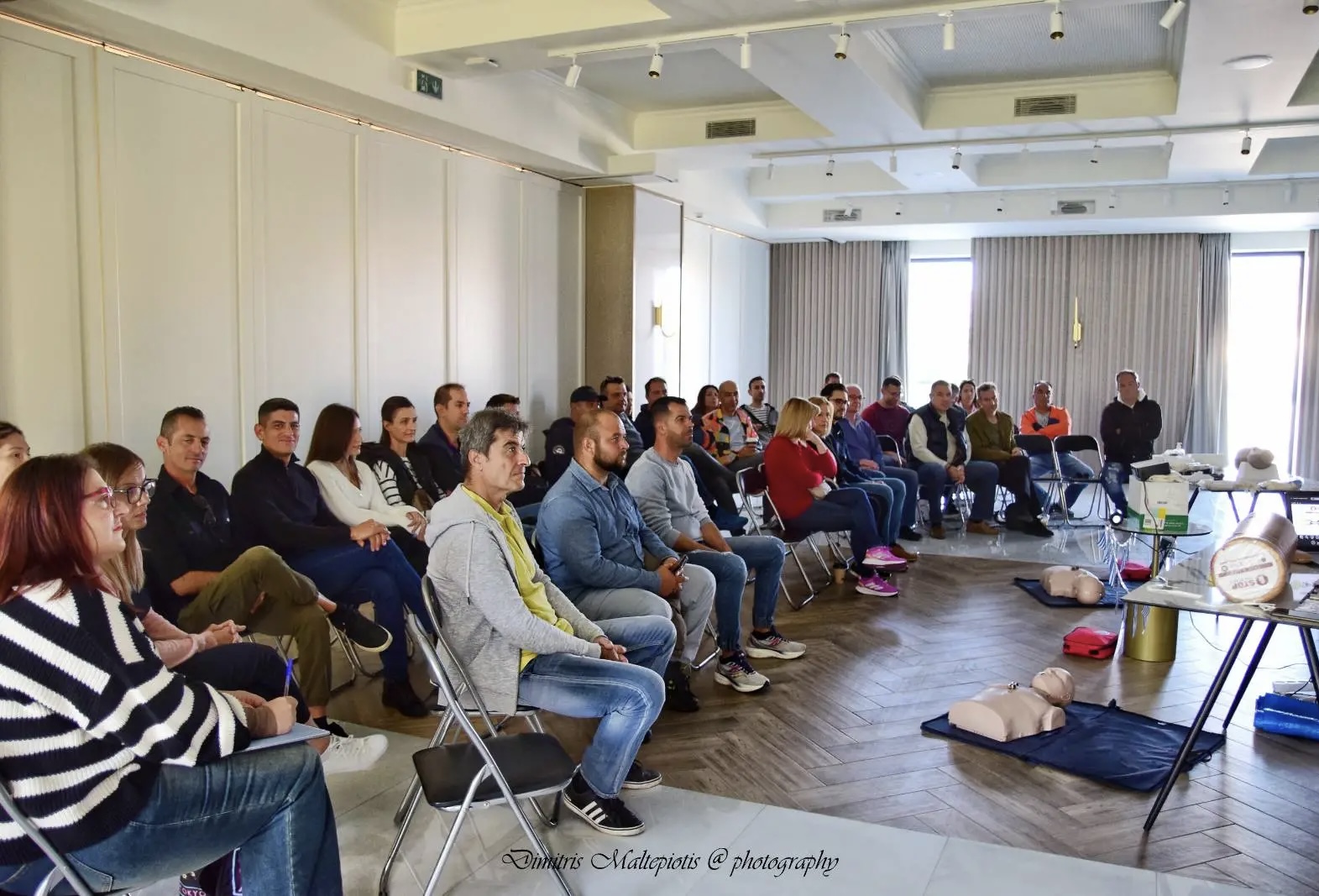 Μετά το πέρας της Εκπαίδευσης παρουσιάσαμε θέματα Καρδιοπνευμονικής Αναζωογόνησης (ΚΑΡΠΑ), Χρήσης Αυτόματου Εξωτερικού Απινιδωτή και Θέσης Ασφαλείας/Ανάνηψης.