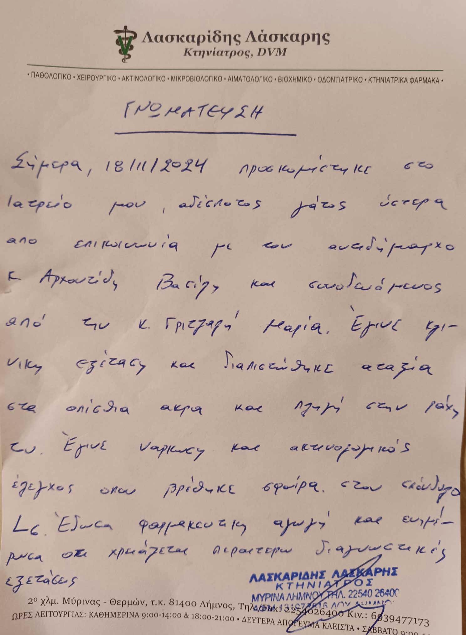 «Στην περιοχή της Παχνιας του Κοντιά έχουν χαθεί και άλλες αδέσποτες γάτες και μερικές από αυτές και δικές μου... θα ήθελα πάρα πολύ να δημοσιευθεί για να προσέχουν οι υπόλοιποι τα γατάκια τους από κάτι τέτοια τέρατα που κυκλοφορούν ανάμεσα μας».