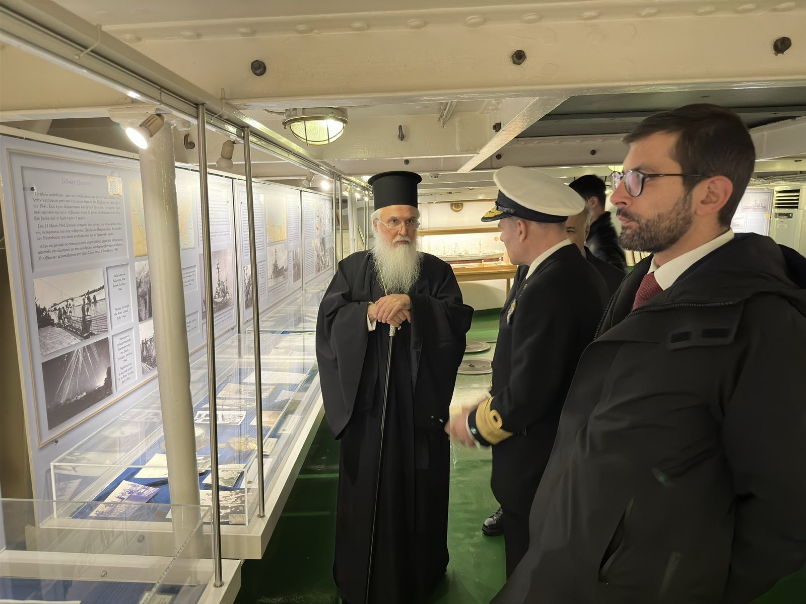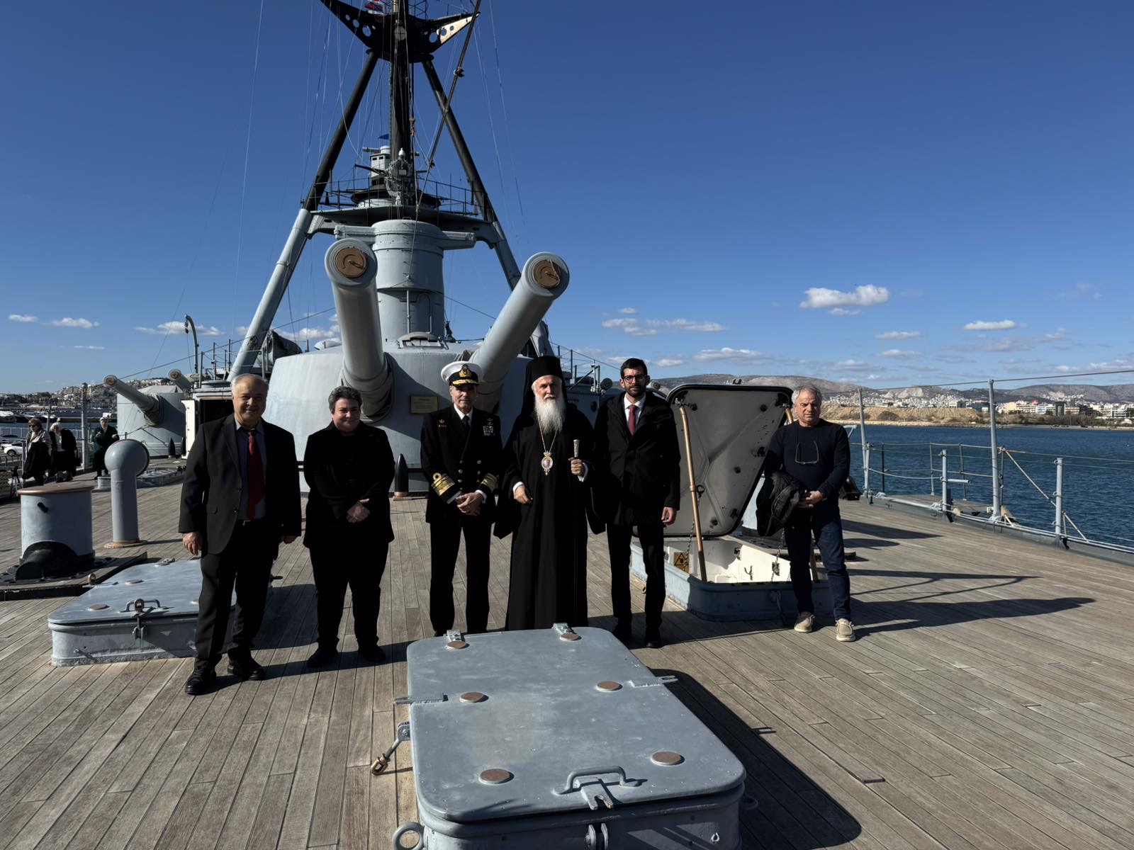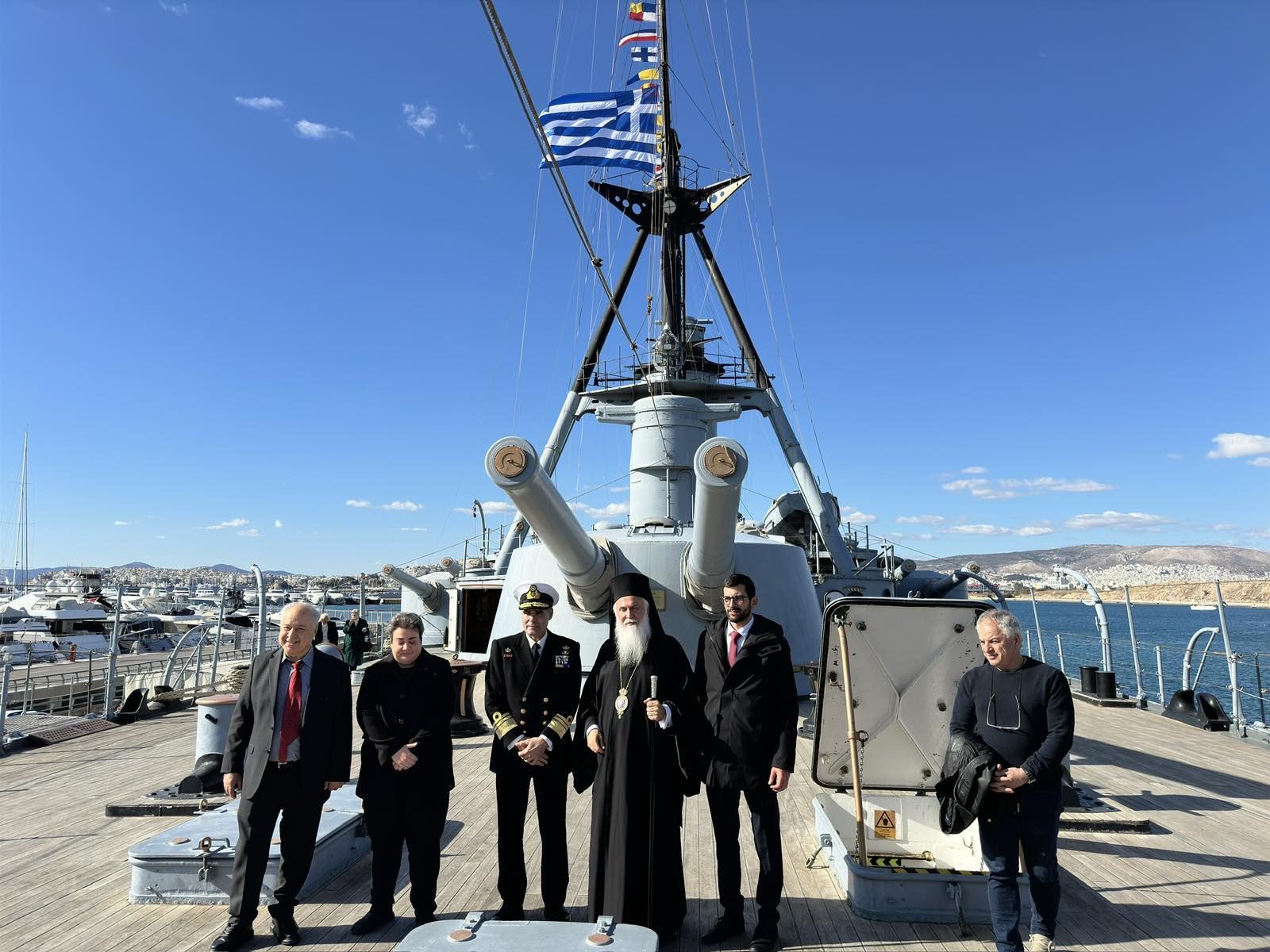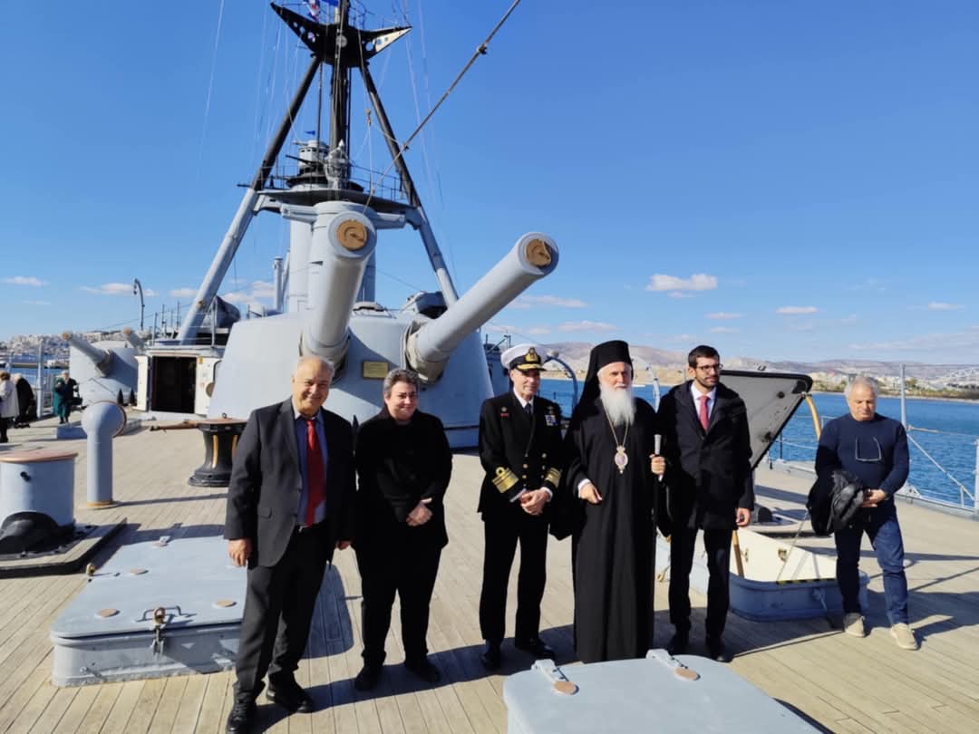 Η τελετή ξεκίνησε με τη δοξολογία, την οποία τέλεσε ο Σεβασμιώτατος Μητροπολίτης Λήμνου και Αγίου Ευστρατίου, κ. Ιερόθεος, ενώ η υποδοχή των παρευρισκομένων έγινε με ιδιαίτερη τιμή από τον Κυβερνήτη και Διευθυντή του Πλωτού Ναυτικού Μουσείου του θωρηκτού «Αβέρωφ», Αντιδήμαρχο Ιωάννη Καλογερόπουλο, Π.Ν.