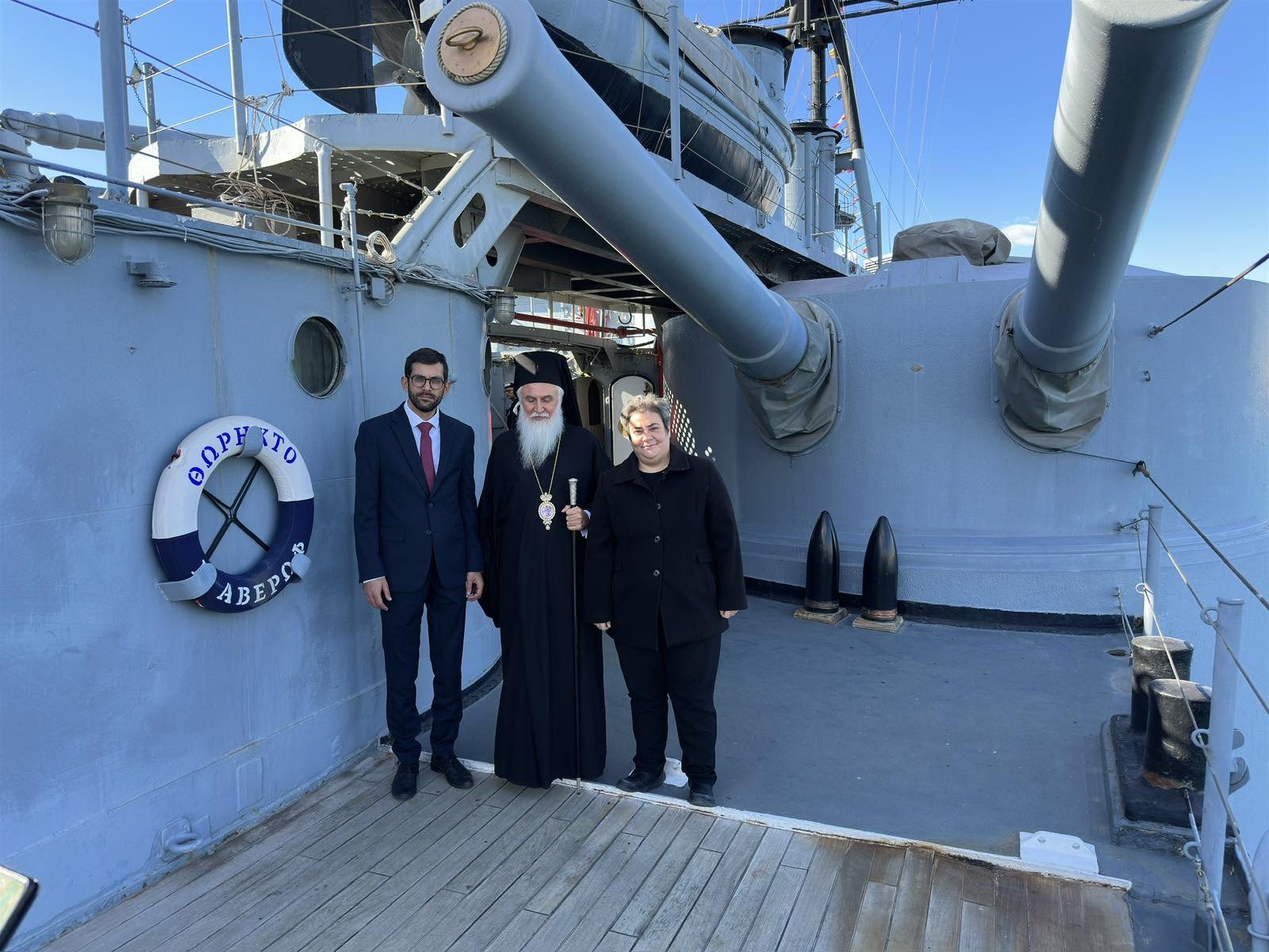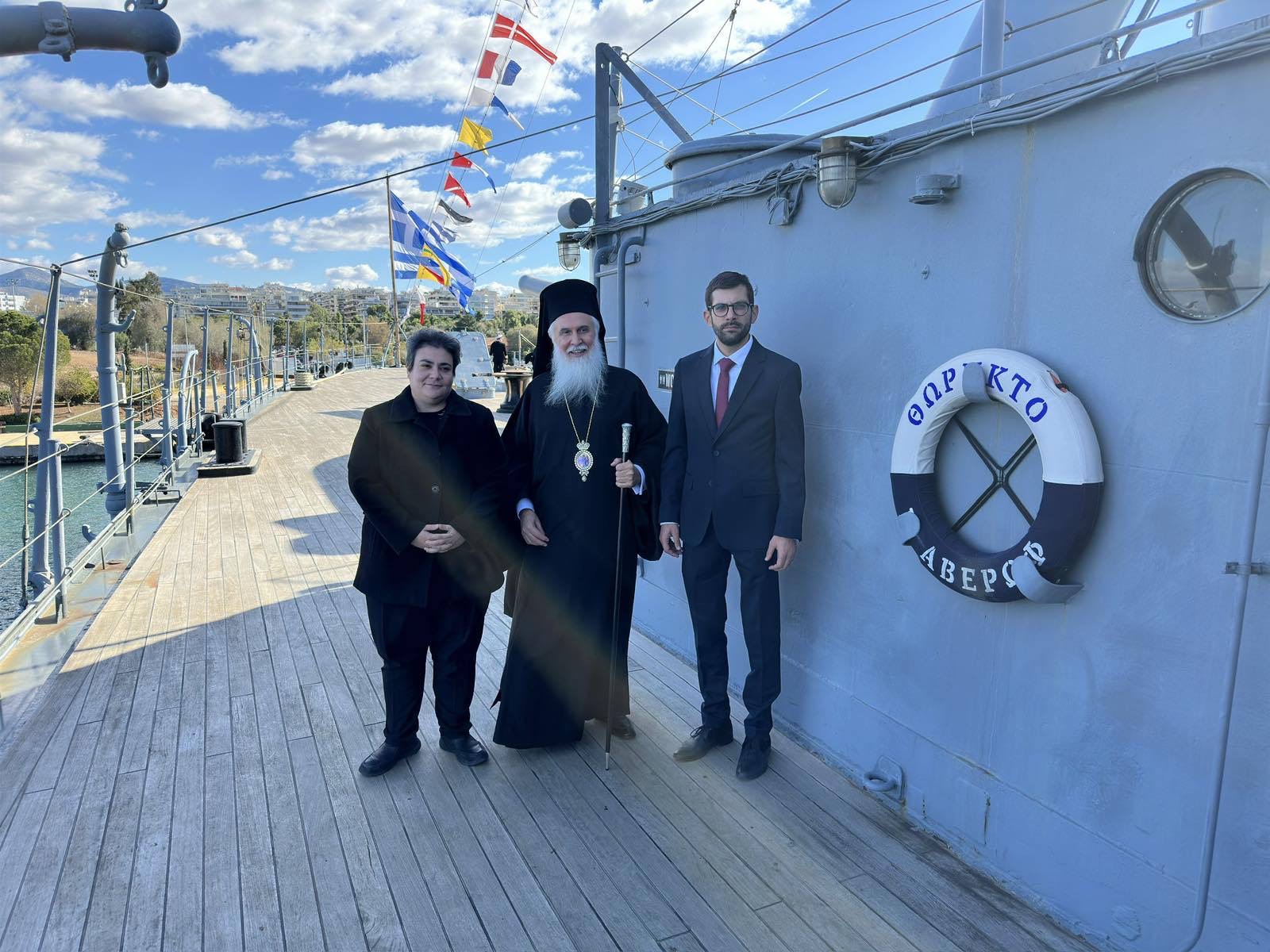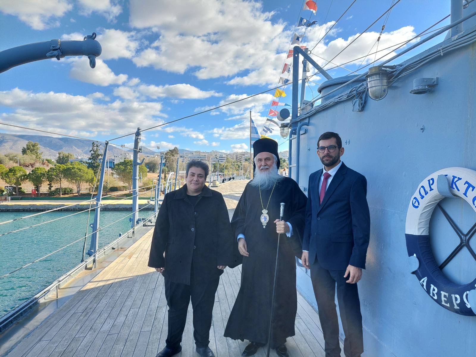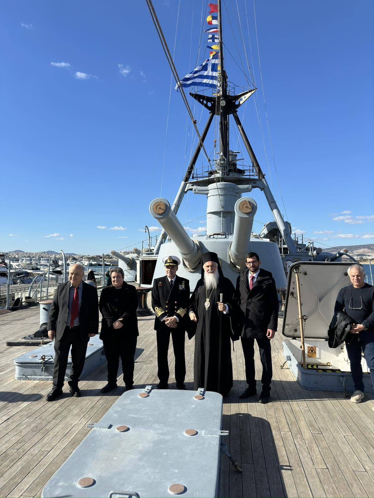 Η τελετή ξεκίνησε με τη δοξολογία, την οποία τέλεσε ο Σεβασμιώτατος Μητροπολίτης Λήμνου και Αγίου Ευστρατίου, κ. Ιερόθεος, ενώ η υποδοχή των παρευρισκομένων έγινε με ιδιαίτερη τιμή από τον Κυβερνήτη και Διευθυντή του Πλωτού Ναυτικού Μουσείου του θωρηκτού «Αβέρωφ», Αντιδήμαρχο Ιωάννη Καλογερόπουλο, Π.Ν.
