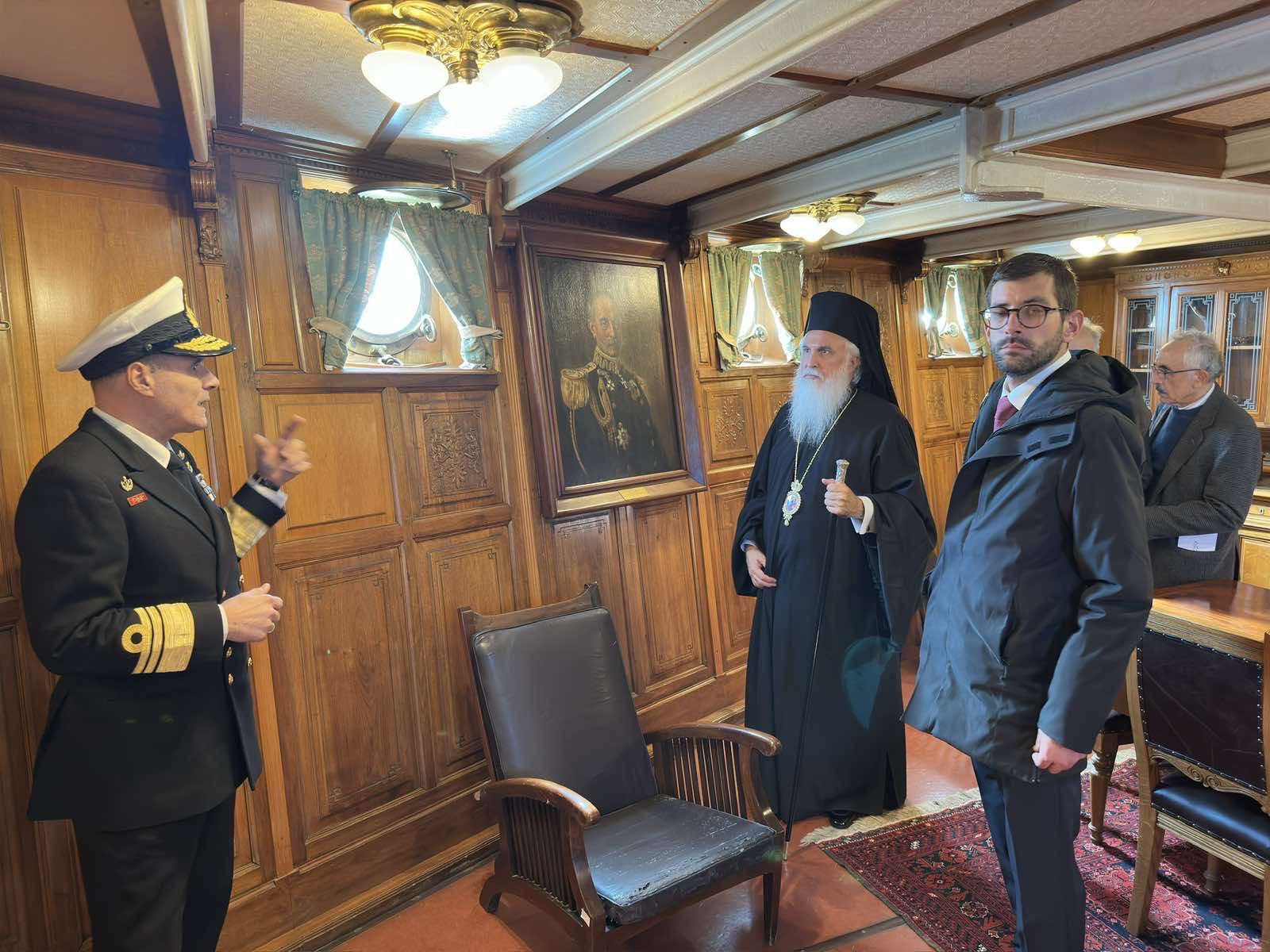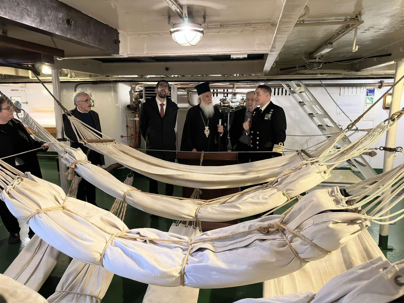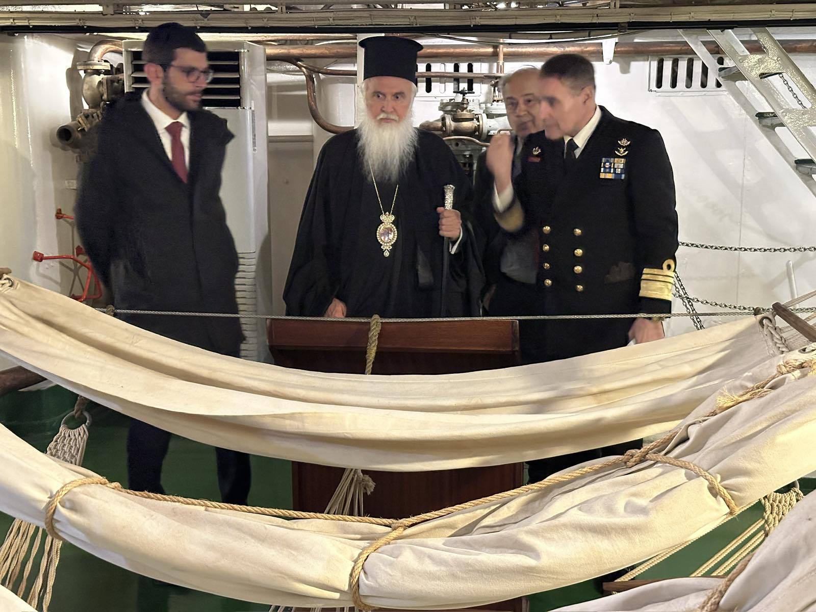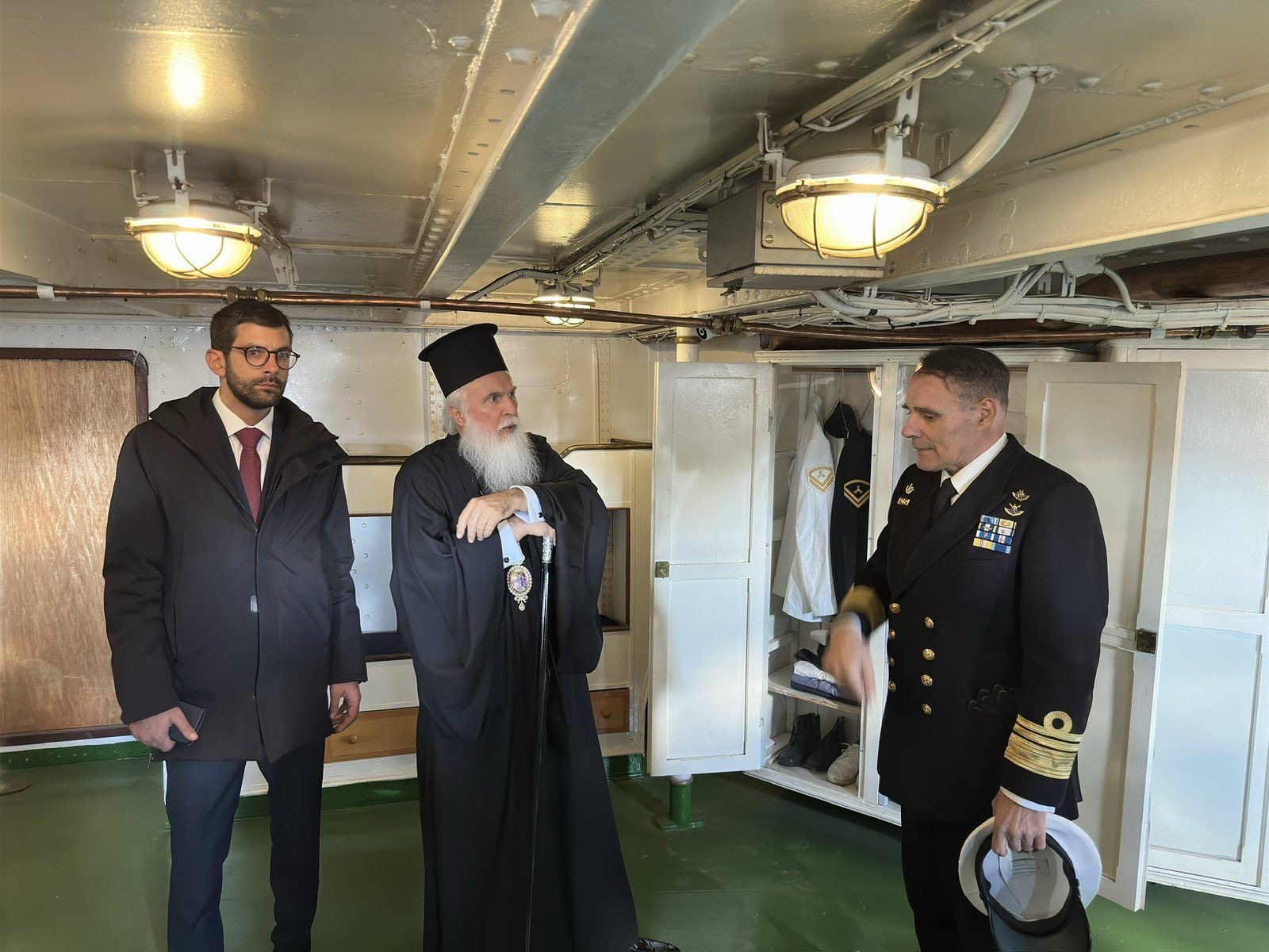 Η τελετή ξεκίνησε με τη δοξολογία, την οποία τέλεσε ο Σεβασμιώτατος Μητροπολίτης Λήμνου και Αγίου Ευστρατίου, κ. Ιερόθεος, ενώ η υποδοχή των παρευρισκομένων έγινε με ιδιαίτερη τιμή από τον Κυβερνήτη και Διευθυντή του Πλωτού Ναυτικού Μουσείου του θωρηκτού «Αβέρωφ», Αντιδήμαρχο Ιωάννη Καλογερόπουλο, Π.Ν.