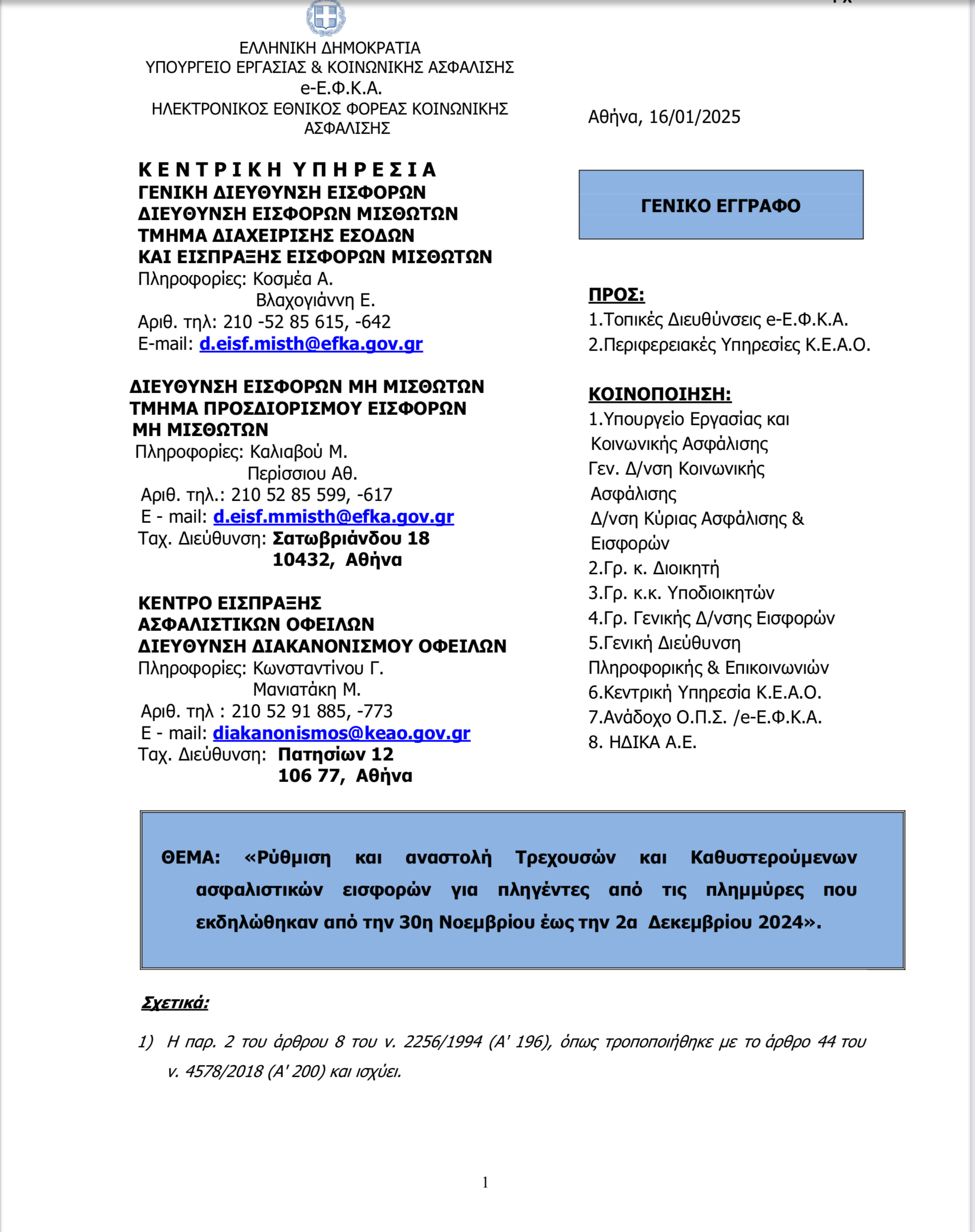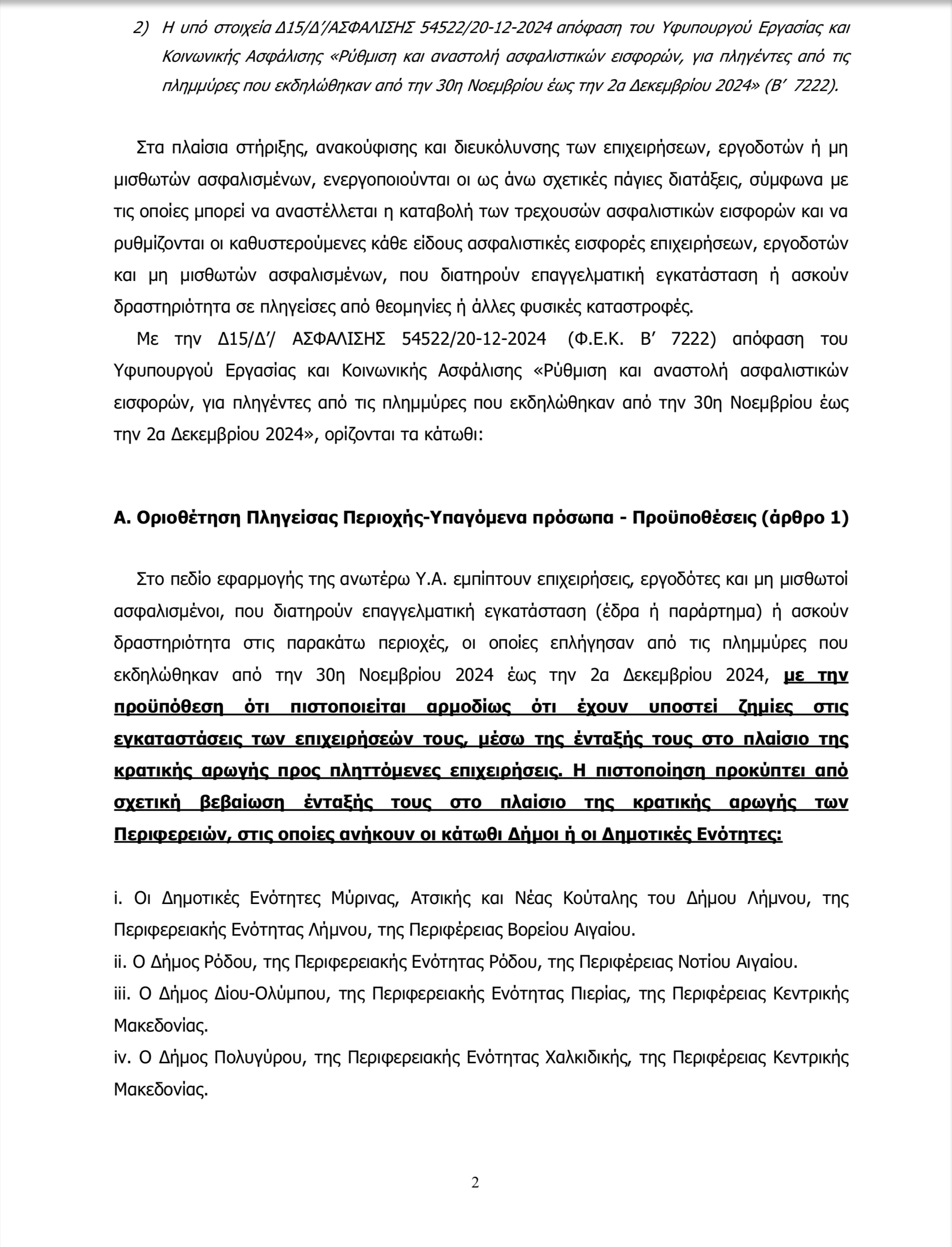 Ο ΕΦΚΑ ανακοίνωσε σειρά ευνοϊκών ρυθμίσεων για τις πληγείσες περιοχές από φυσικές καταστροφές, στις οποίες περιλαμβάνονται οι δημοτικές ενότητες Μύρινας, Ατσικής και Κοντιάς της Λήμνου. Τα μέτρα που εφαρμόζονται περιλαμβάνουν την αναστολή καταβολής ασφαλιστικών εισφορών και τη δυνατότητα ένταξης σε ευνοϊκά σχέδια αποπληρωμής.