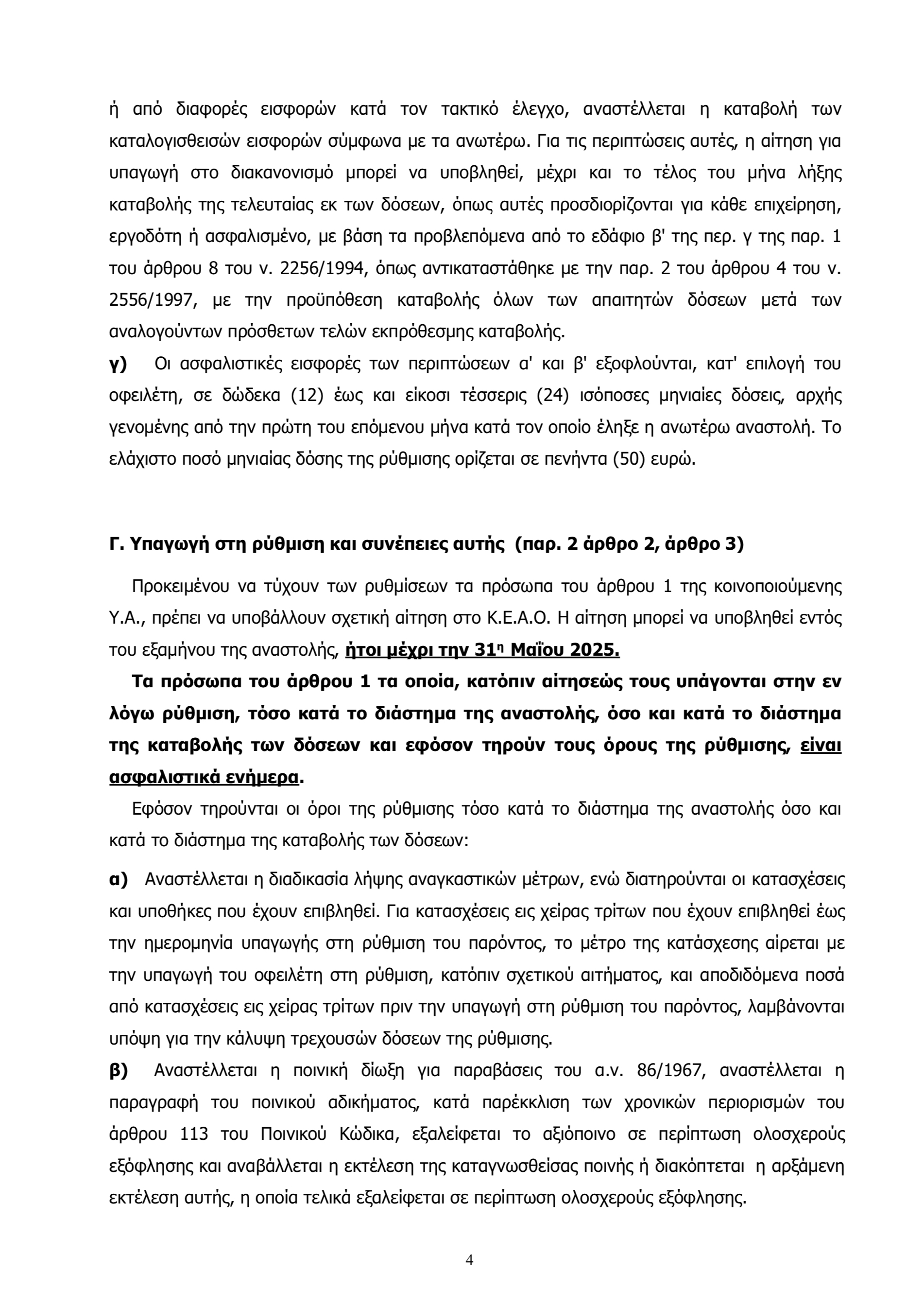 Όσοι ενταχθούν στη ρύθμιση παραμένουν ασφαλιστικά ενήμεροι καθ’ όλη τη διάρκεια της αναστολής και της αποπληρωμής των δόσεων, ενώ η προθεσμία για την υποβολή αιτήσεων λήγει στις 31 Μαΐου 2025.
