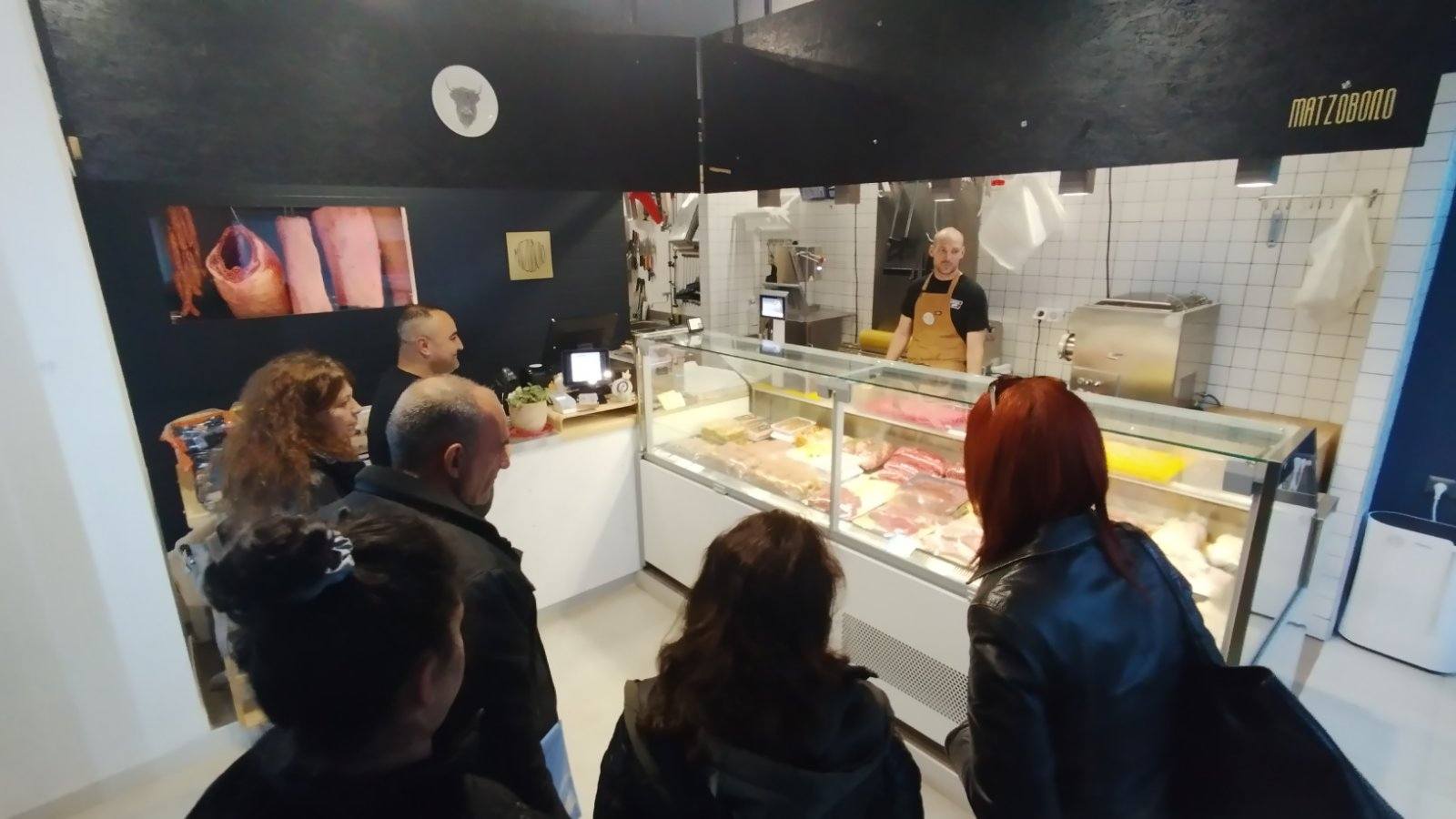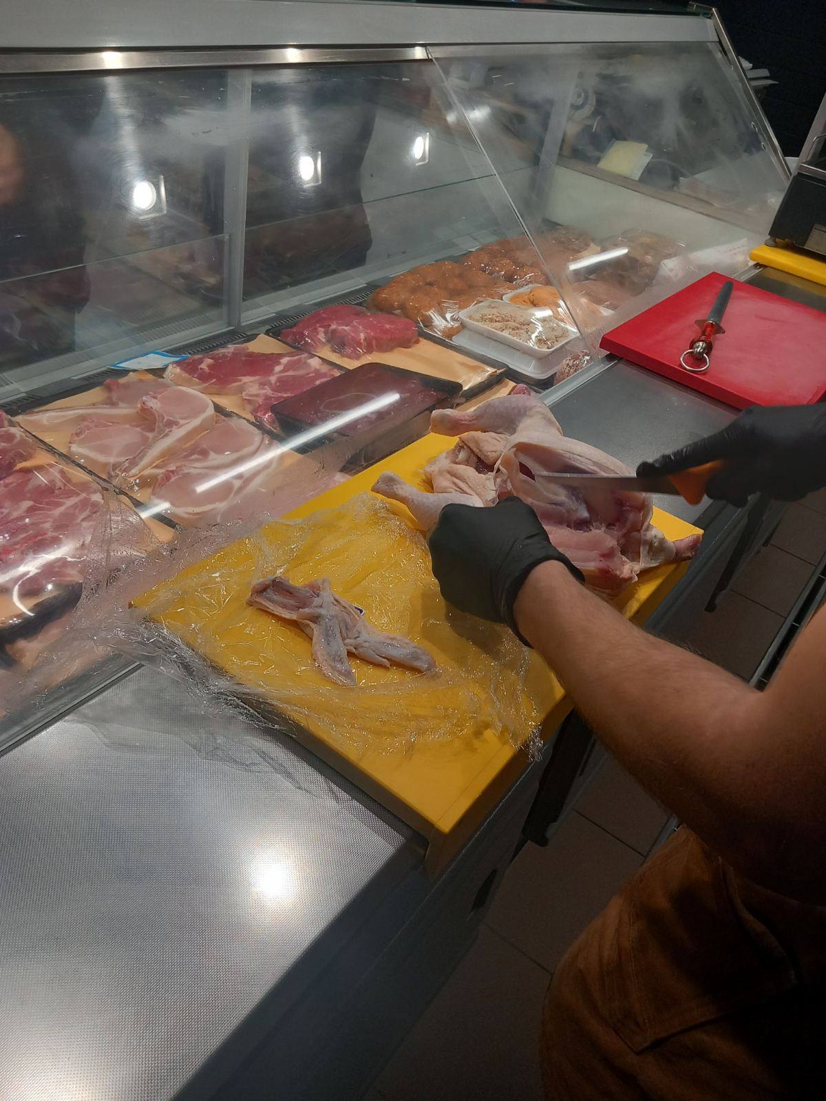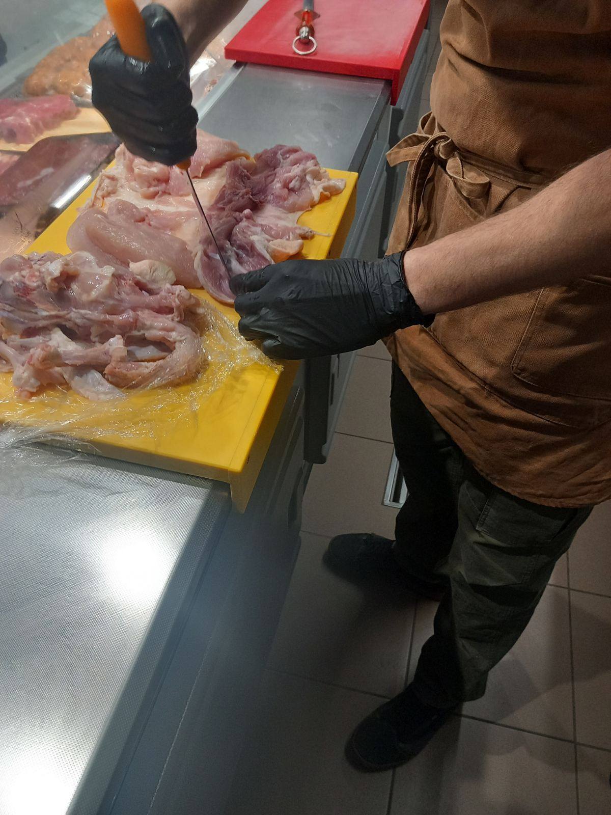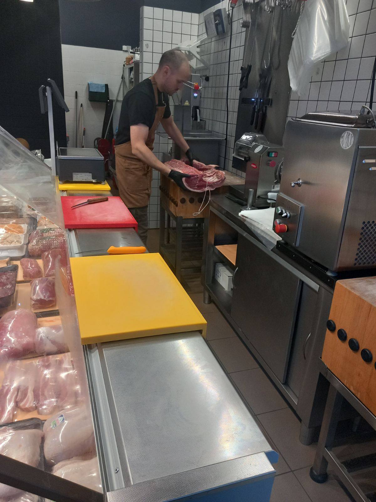 Επιπλέον τους έδειξε τις μηχανές που χρειάζονται σε ένα κρεοπωλείο πριονοκορδέλα, μηχανή του κιμά, η οποία ψύχεται και περνούν μόνο τα κόκκινα κρέατα και δεύτερη μηχανή κιμά που είναι για πουλερικά, μηχανή για σνίτσελ, πάγκους κοπής κίτρινο για πουλερικά και κόκκινο για κρέατα.