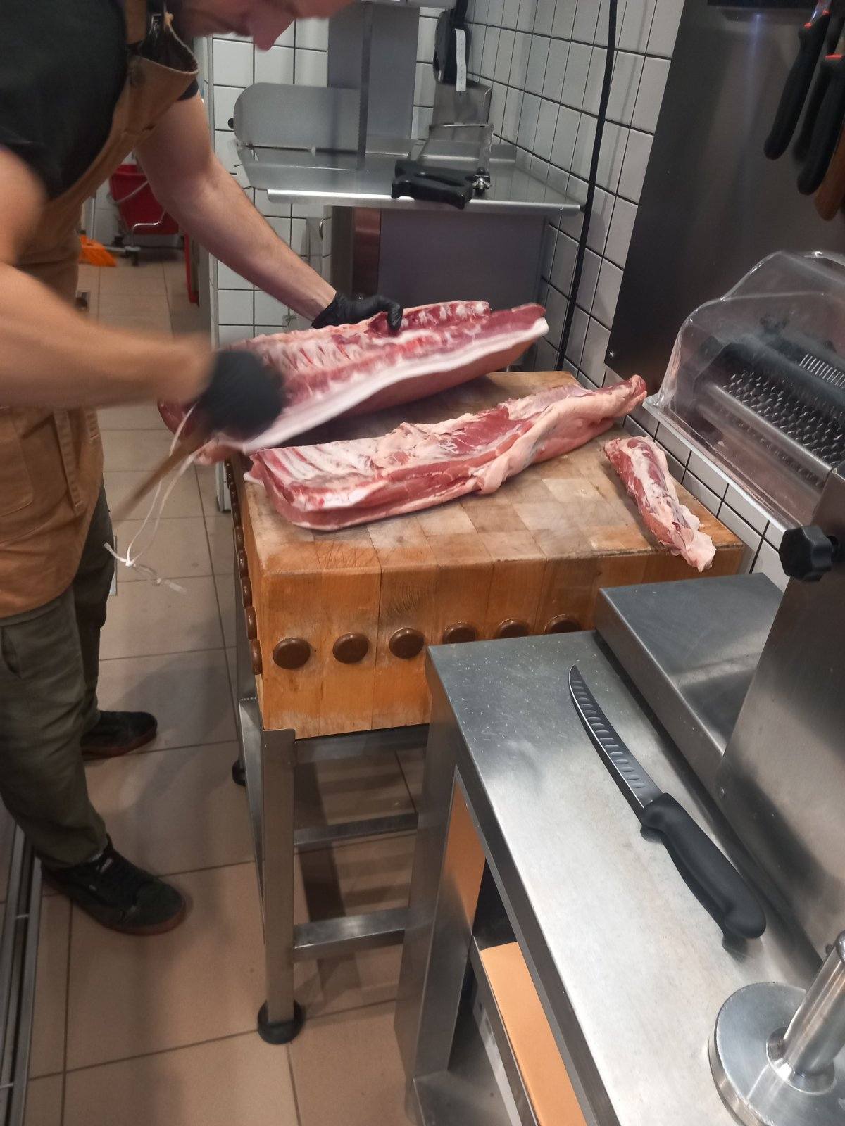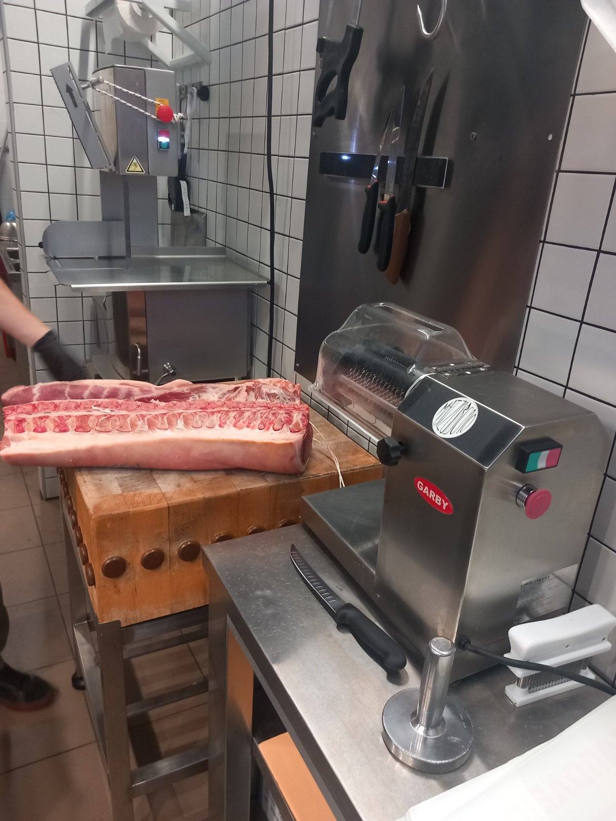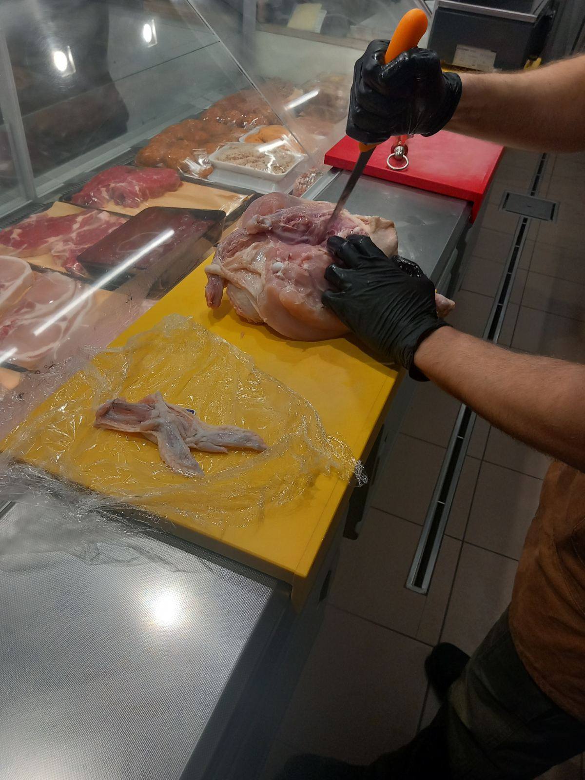 Επιπλέον τους έδειξε τις μηχανές που χρειάζονται σε ένα κρεοπωλείο πριονοκορδέλα, μηχανή του κιμά, η οποία ψύχεται και περνούν μόνο τα κόκκινα κρέατα και δεύτερη μηχανή κιμά που είναι για πουλερικά, μηχανή για σνίτσελ, πάγκους κοπής κίτρινο για πουλερικά και κόκκινο για κρέατα.