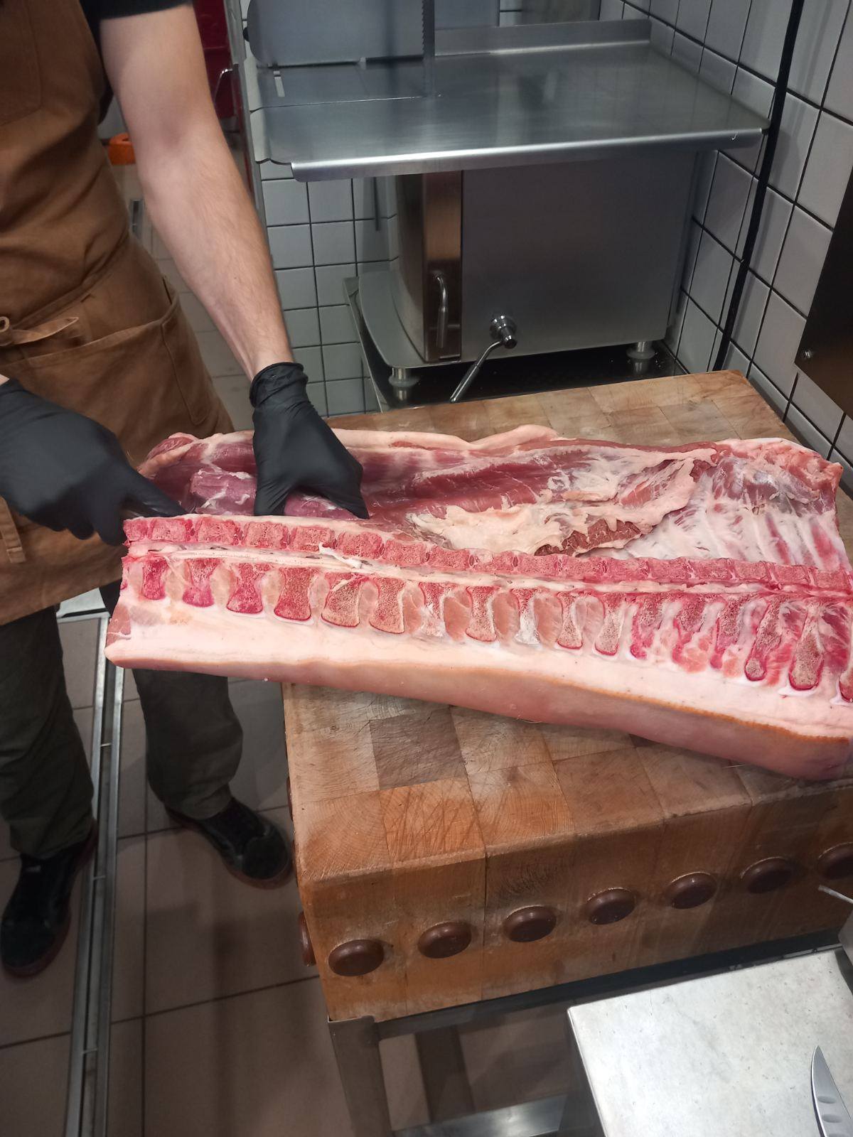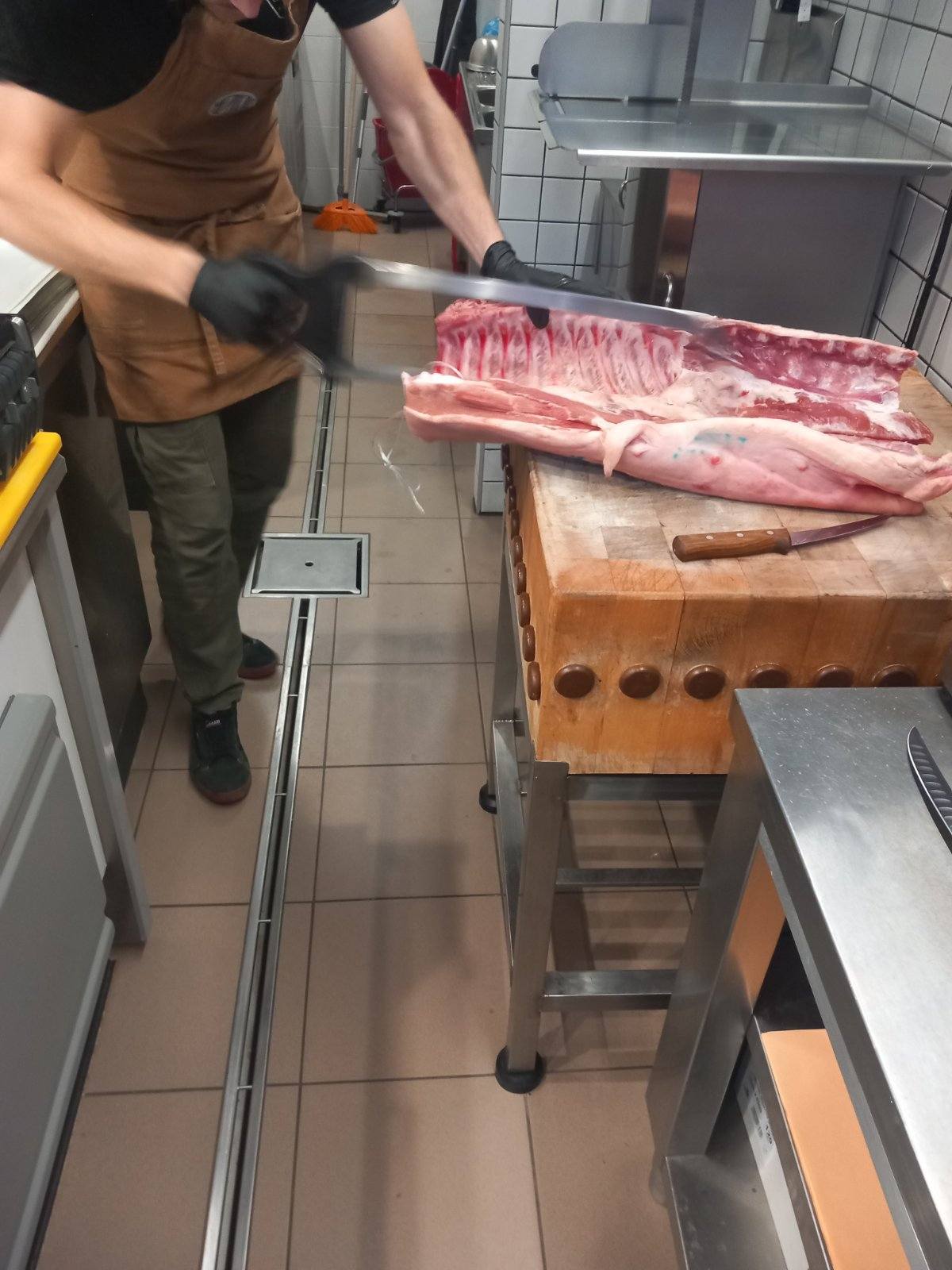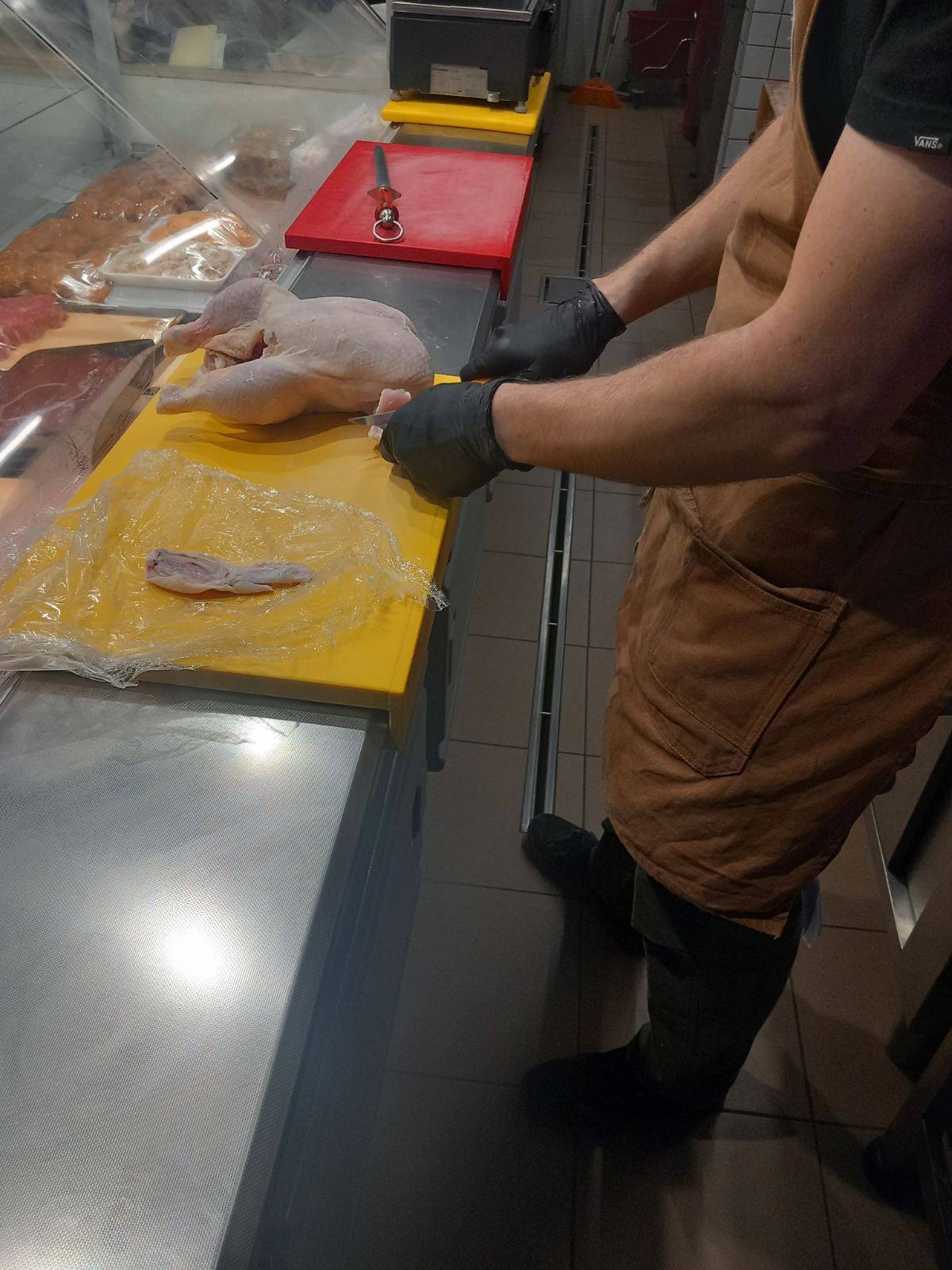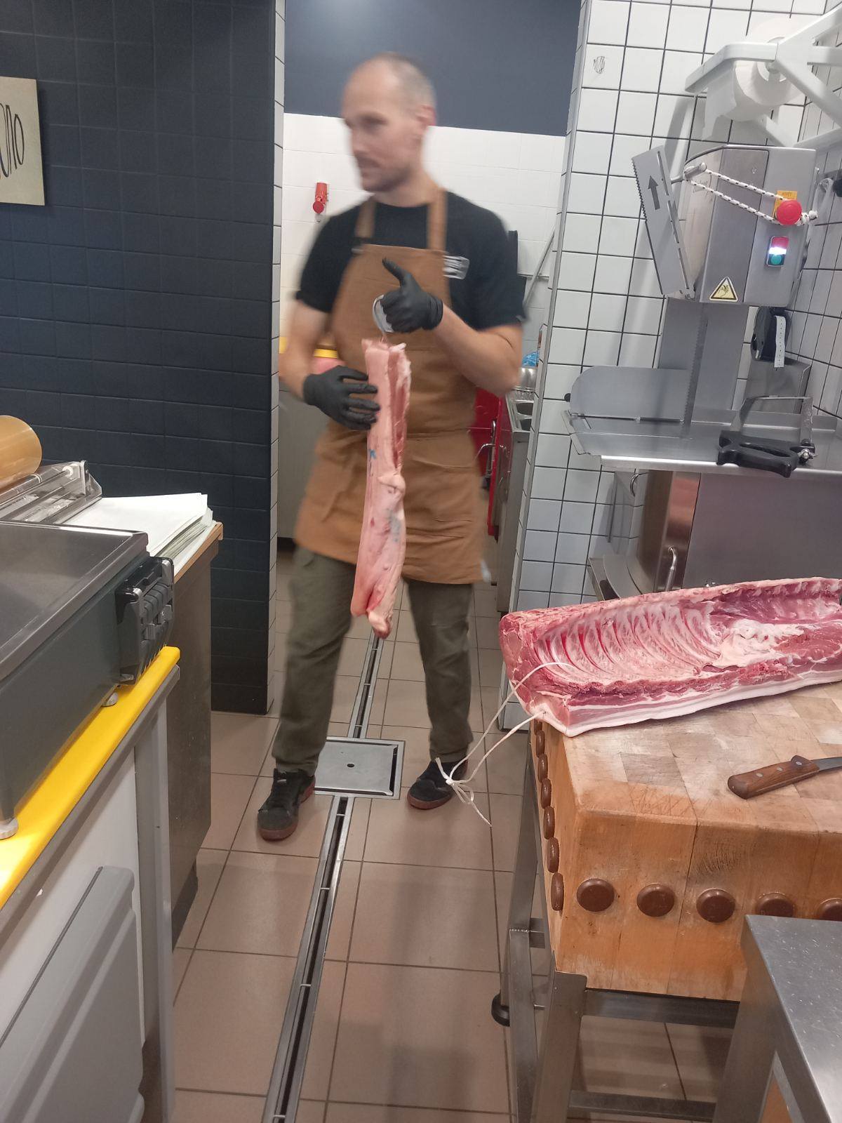 Επιπλέον τους έδειξε τις μηχανές που χρειάζονται σε ένα κρεοπωλείο πριονοκορδέλα, μηχανή του κιμά, η οποία ψύχεται και περνούν μόνο τα κόκκινα κρέατα και δεύτερη μηχανή κιμά που είναι για πουλερικά, μηχανή για σνίτσελ, πάγκους κοπής κίτρινο για πουλερικά και κόκκινο για κρέατα.