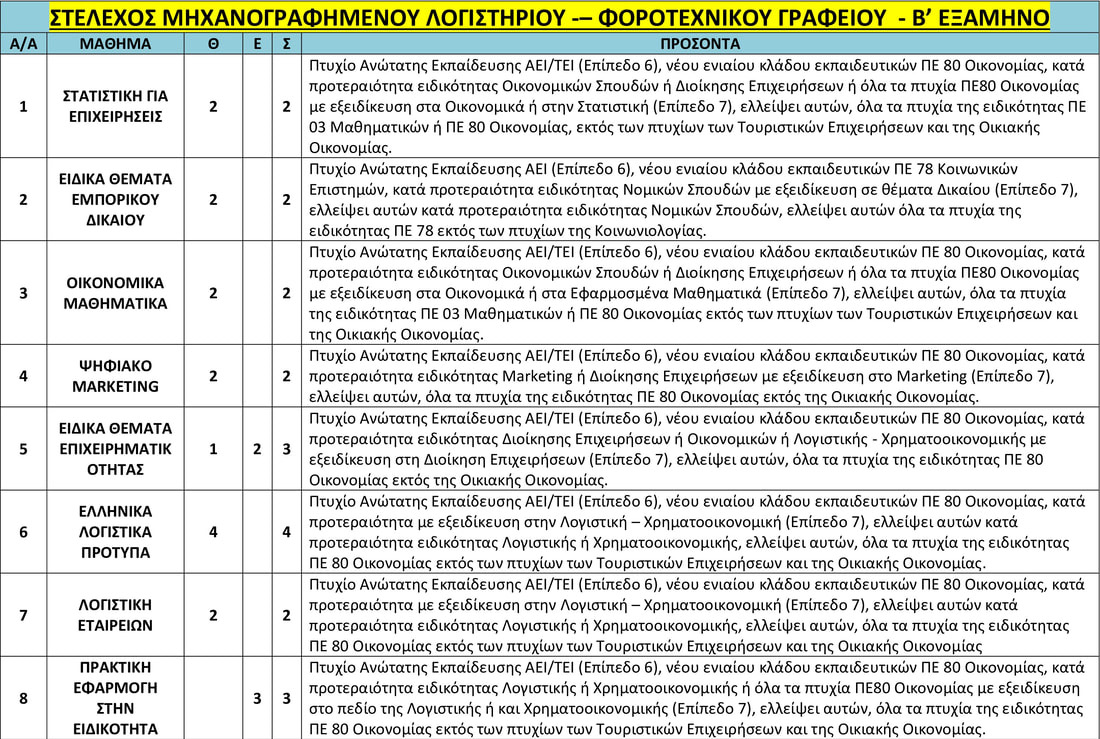 Οι διαθέσιμες θέσεις αφορούν εκπαιδευτές από διάφορες ειδικότητες, μεταξύ των οποίων Αισθητική, Νοσηλευτική, Μηχανική, Πληροφορική, Γλωσσολογία και Οικονομικά.