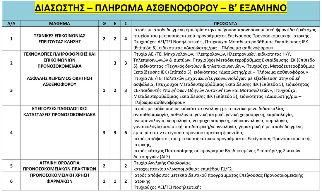 - Πτυχιούχοι Μεταδευτεροβάθμιας Εκπαίδευσης ΙΕΚ (Επίπεδο 5), ειδικότητας «Διασώστης/ρια – Πλήρωμα ασθενοφόρου»