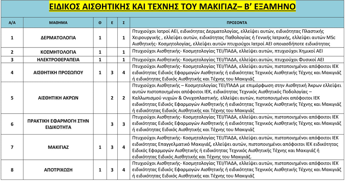 - Πιστοποιημένοι απόφοιτοι ΙΕΚ ειδικότητας Ειδικός Εφαρμογών Αισθητικής ή ειδικότητας Τεχνικός Αισθητικής Τέχνης και Μακιγιάζ ή ειδικότητας Ειδικός Αισθητικής και Τέχνης του Μακιγιάζ